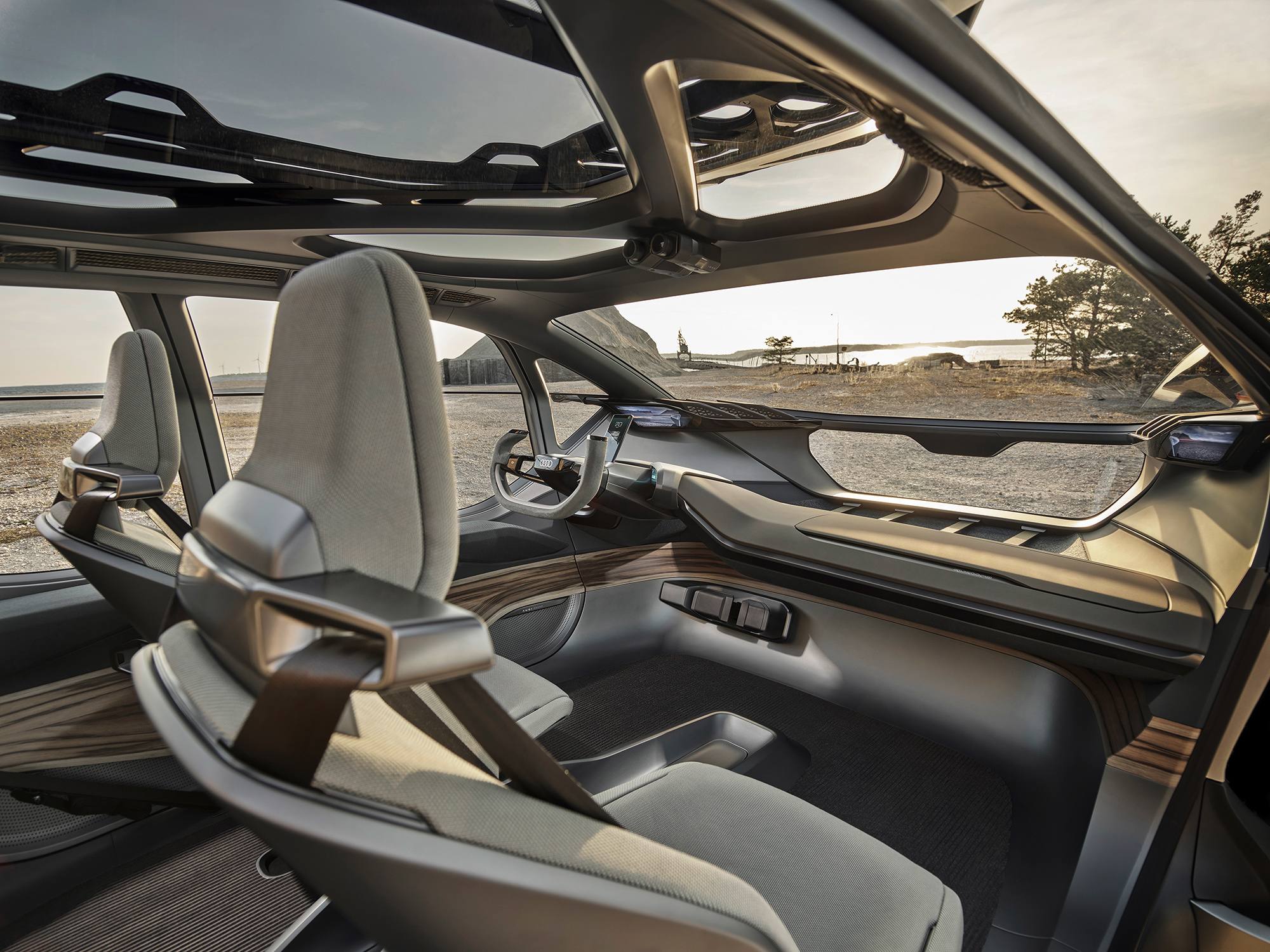 Застеклённые стены кабины расширяются на «линии талии». Получившиеся боковые выступы дают пассажирам дополнительное пространство вокруг плеч и локтей. Обзорность действительно аквариумная, ведь ещё и крыша панорамная. Седоки могут во время движения наблюдать из окна за работой подвески. Интересно также, что лобовое стекло и задняя дверь открываются, обеспечивая доступ к отделениям для вещей. Грязные хранятся в специальном отсеке, встроенном в задний бампер. Пороги действуют как убирающиеся подножки, облегчая загрузку багажника на крыше.