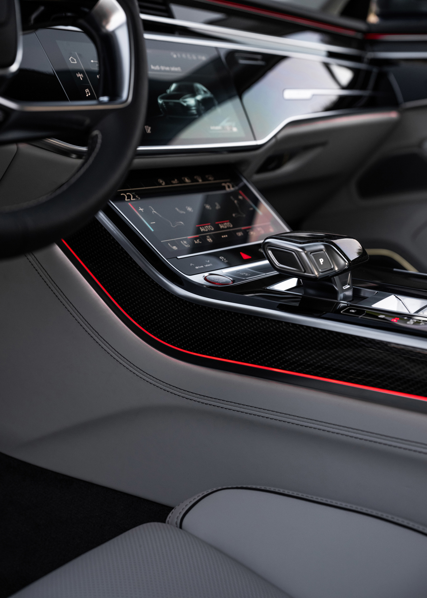 Аналогично, в штатное оснащение «эски» входит «предсказывающая» активная подвеска. Она позволяет через меню Audi drive select выбрать один из пяти режимов работы, от динамического с подавлением крена до расслабленного Comfort +, в котором кузов кренится внутрь поворота ради снижения поперечных перегрузок на пассажиров. Когда же подошедший к машине человек берётся за дверную ручку, седан быстро приподнимается на 50 мм для облегчения посадки. Среди других технических особенностей: опциональные фары HD Matrix LED, каждая из которых содержит по 138 светодиодов и лазерно-люминофорную секцию, дополняемые фонарями на органических диодах OLED.
