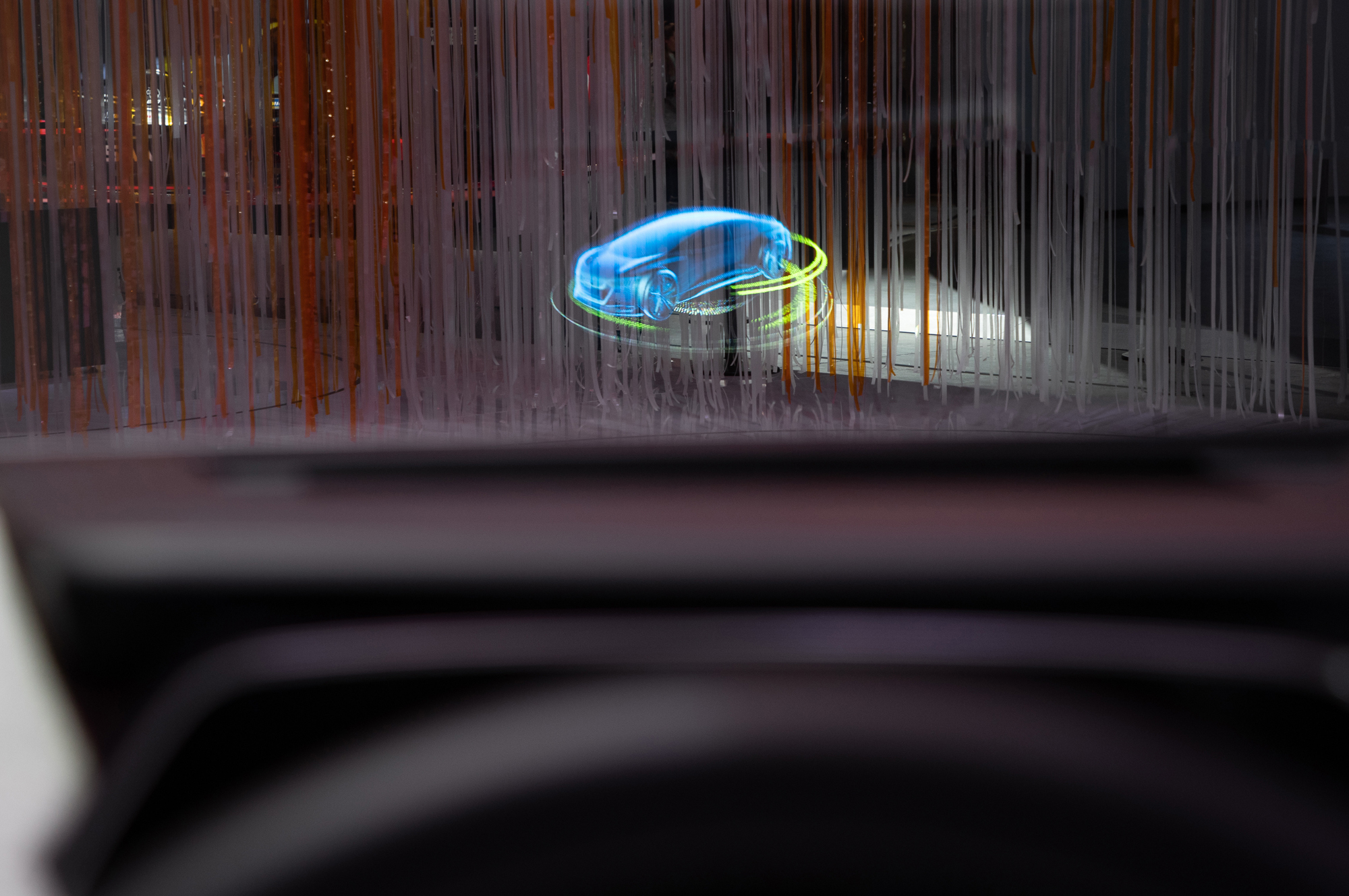 Проекционный 3D-дисплей со смешанной реальностью (коллаж выше) — ещё одна любопытная разработка на перспективу. В этом устройстве кажущееся «плавание» цифр, значков и навигационных стрелок перед машиной, уже демонстрируемое в обычных проекционных системах, существенно усилено за счёт объёмности изображения: картинок на деле две, и каждая предназначена только для правого или левого глаза (как обеспечено их разделение для водителя — не уточняется). Этот проект реализован в кооперации с компанией Samsung.