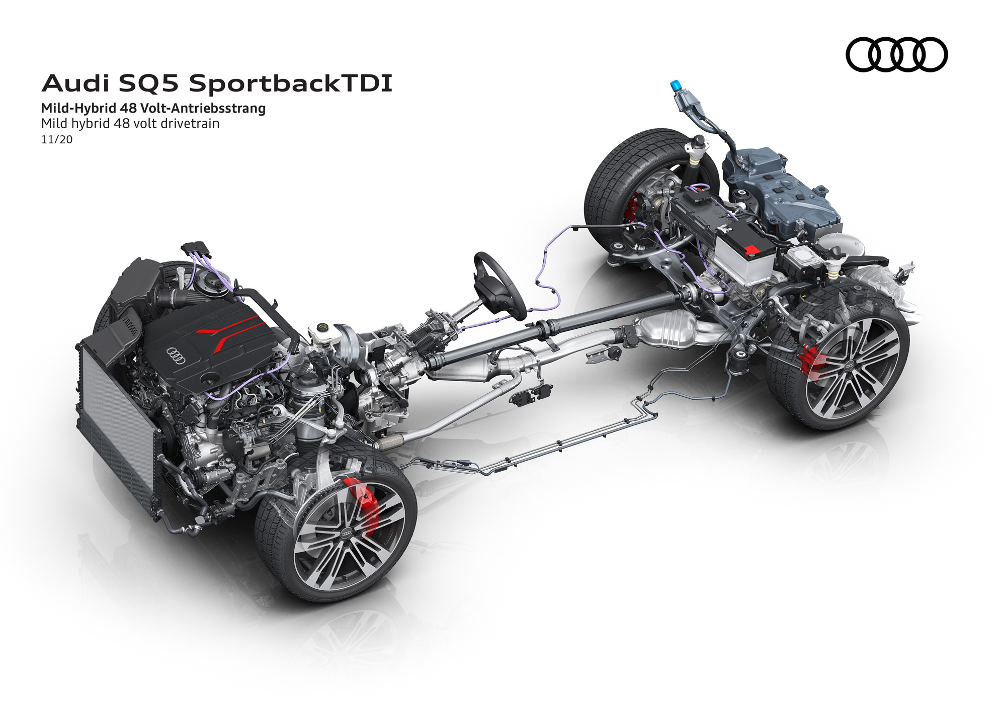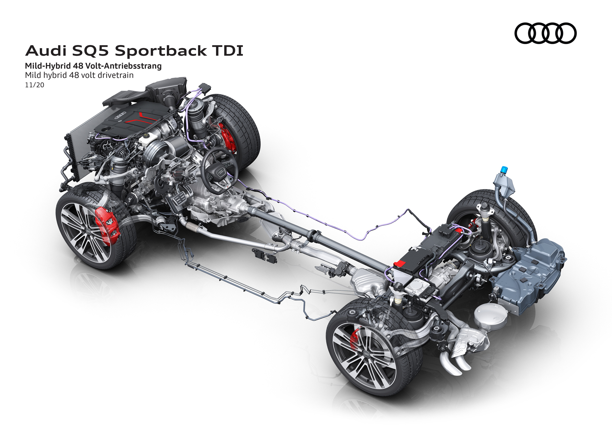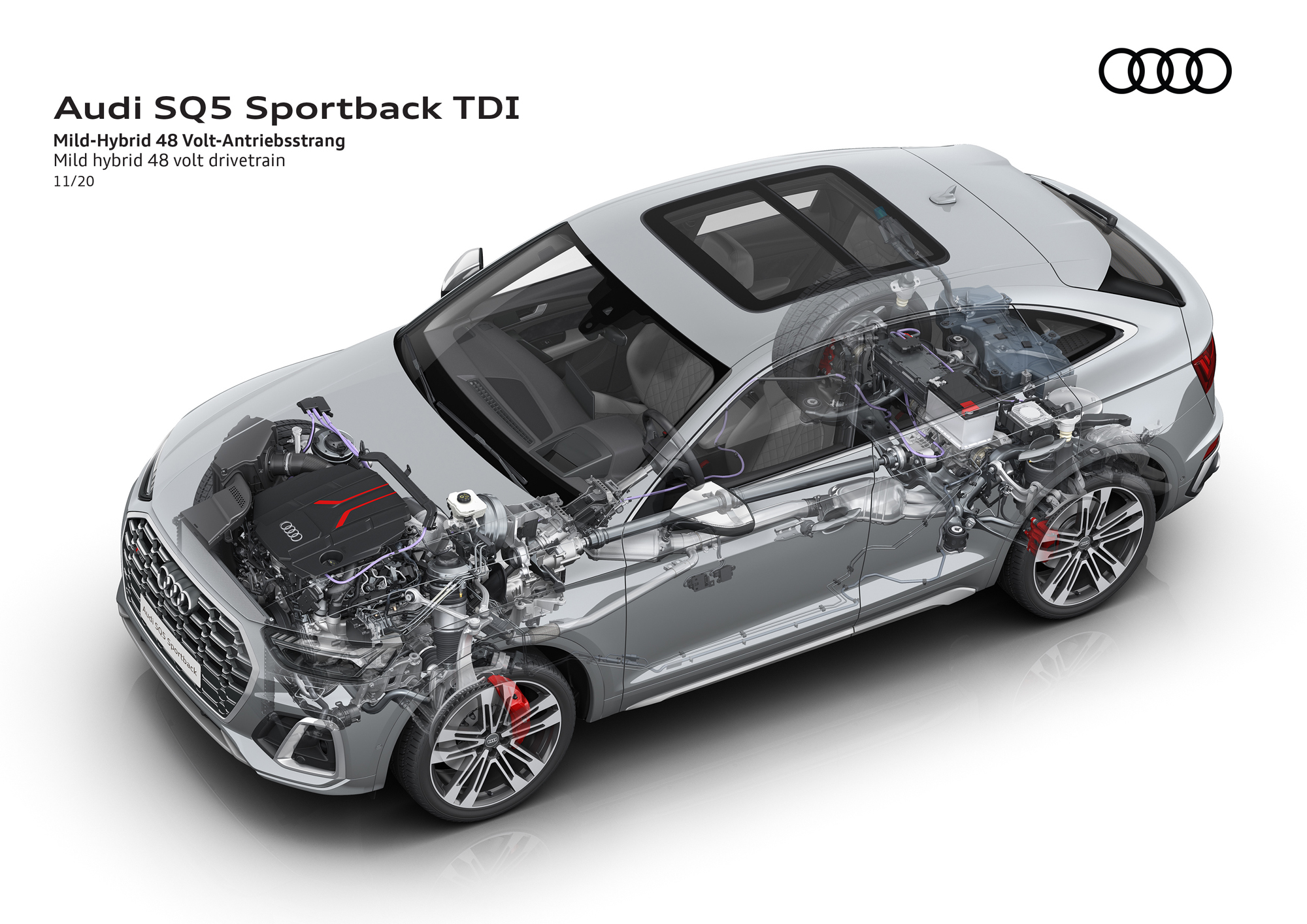 Список моторов на простом кроссовере Audi Q5 Sportback уточнён, как и характеристики: 40 TDI quattro (дизель 2.0, 204 л.с. 400 Н•м), 50 TDI quattro (дизель V6 3.0, 286 л.с., 620 Н•м) и 45 TFSI quattro (турбочетвёрка 2.0, 265 л.с., 370 Н•м). Четырёхцилиндровые дизель и бензиновый мотор оснащены семиступенчатым «роботом» S tronic, полным приводом quattro ultra и 12-вольтовой умеренной гибридной системой, а дизель V6 — восьмидиапазонным «автоматом» tiptronic, приводом quattro с самоблокирующимся межосевым дифференциалом и умеренной гибридной надбавкой на базе 48-вольтовой сети. Ускорение с места до сотни у них занимает 7,6; 5,7 и 6,1 с соответственно.