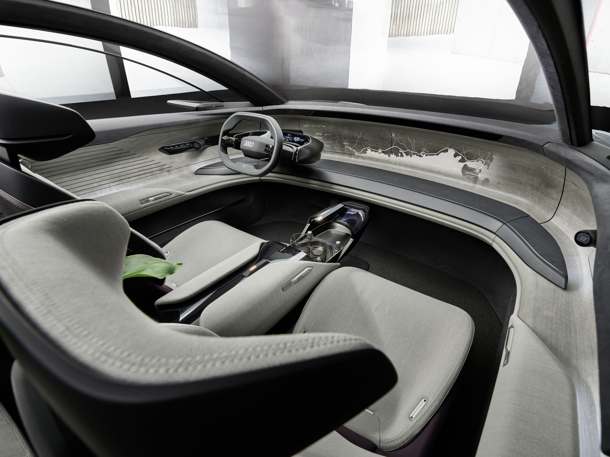 После трансформируемого родстера Audi Skysphere можно было ожидать прячущиеся элементы управления. Но в Grandsphere идея получила развитие. Даже цепочка передних экранов невидима, пока не понадобится. А когда они активны, то демонстрируют изображения, спроецированные прямо на деревянную переднюю панель. Под ней расположена сенсорная поверхность для быстрого переключения контента. Вообще же в отделке применены дерево, шерсть, текстиль и металл, но не кожа (ради экологии). Шпон граба сделан из древесины, специально выращенной или переработанной.