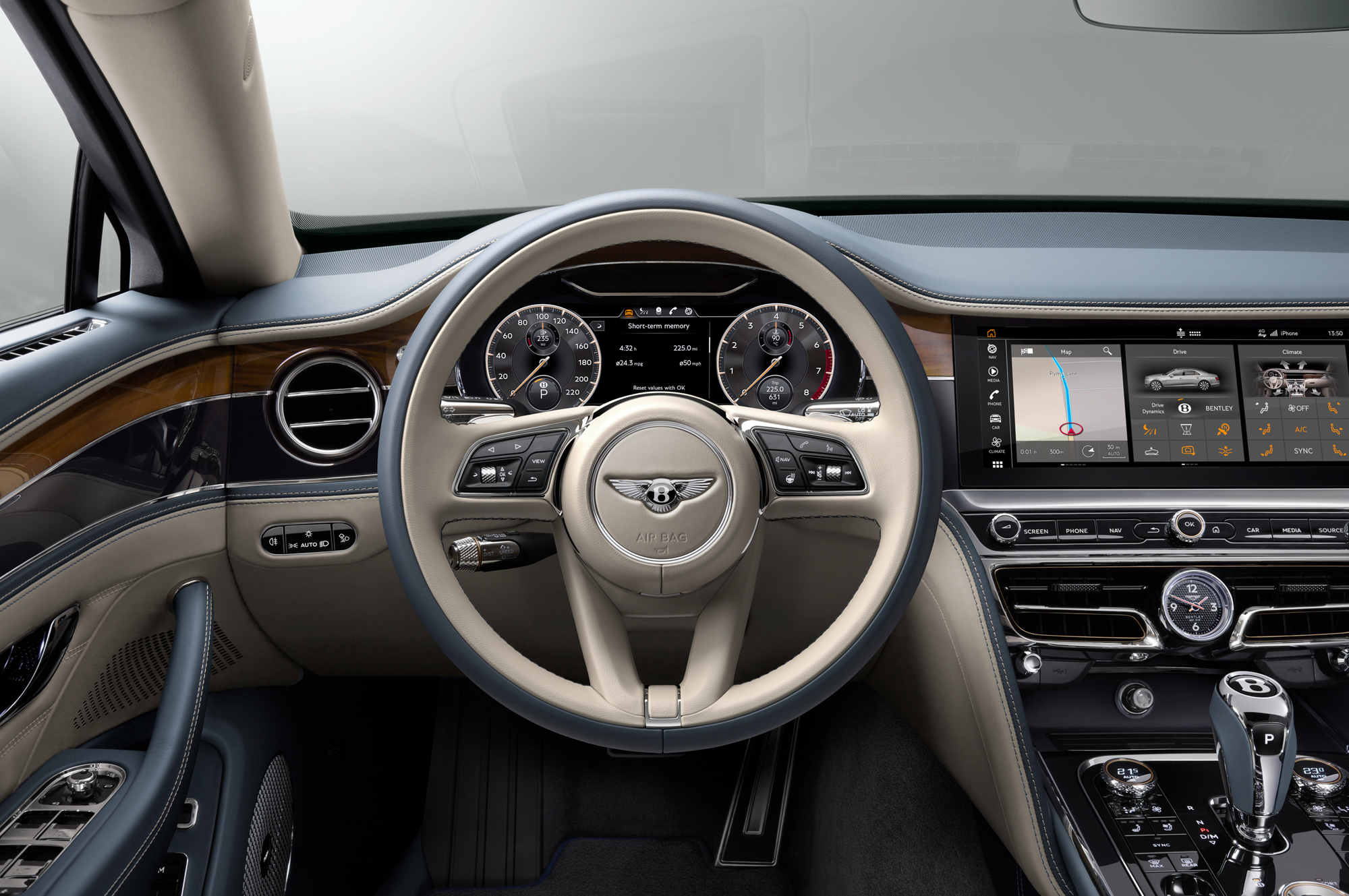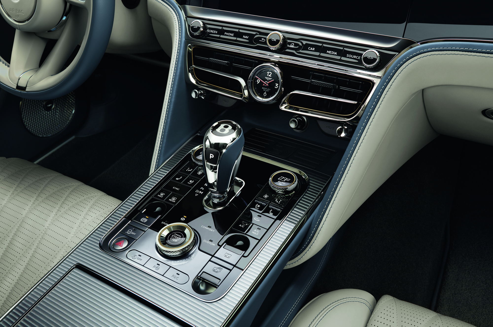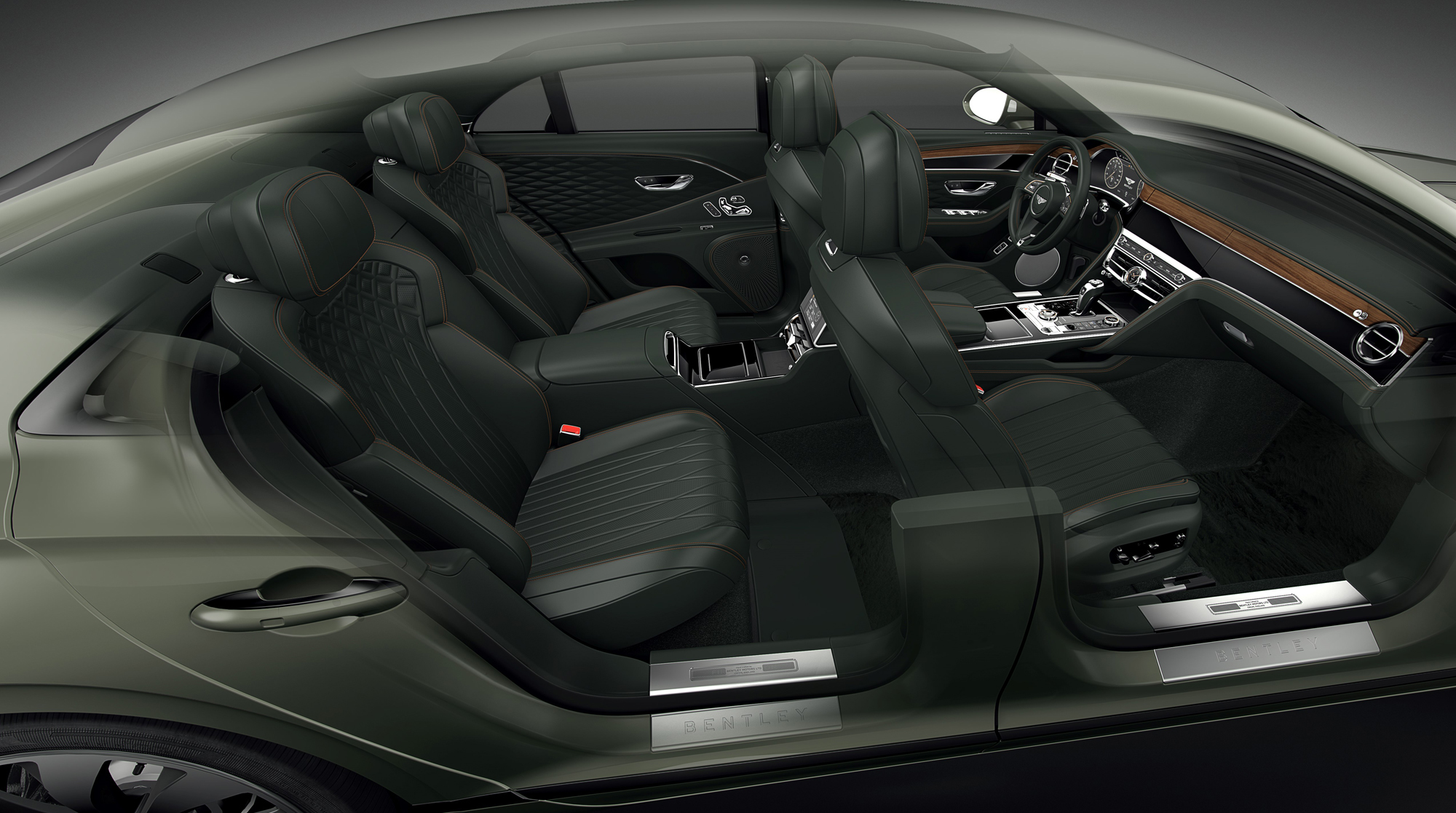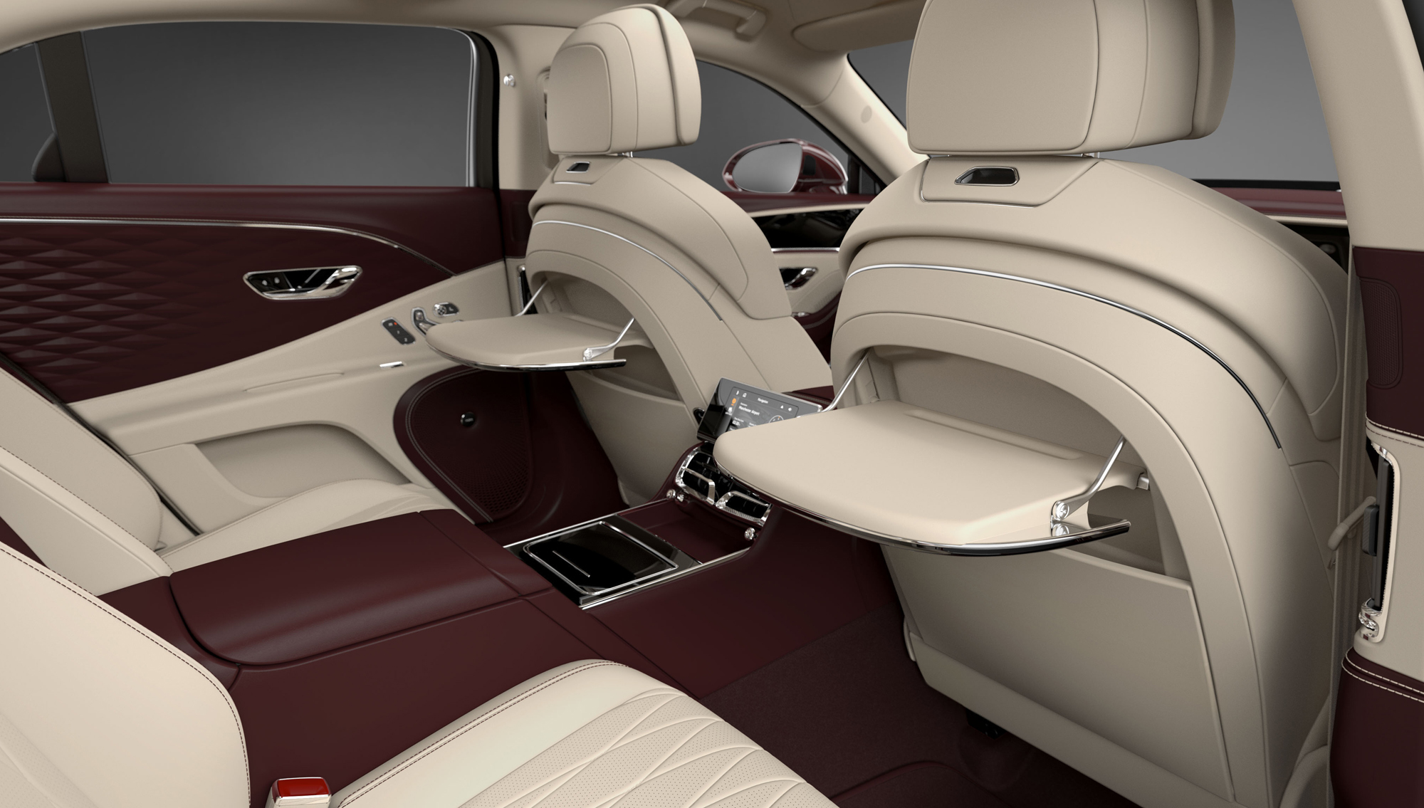 Вместе с четырёхместной конфигурацией машине положен центральный задний подлокотник с металлическим декором, подогревом, двумя портами USB, розеткой на 12 В, а в виде опции туда поставят беспроводную зарядку для смартфона. Параллельно с новой версией салона Flying Spur обзавёлся опциональными столиками с электроприводом в спинках передних кресел. Они отделаны шпоном и кожей и обладают углублением для ручки или стилуса. Из других новаций на очередной год: теперь можно заказать более тонкую и мягкую полуанилиновую кожу на сиденьях с подчёркнутой зернистостью, ручную вышивку крестиком по всему салону (применяется специальная нить с особо стойкой окраской, 115 м, 11 100 стежков, сделанных вручную).