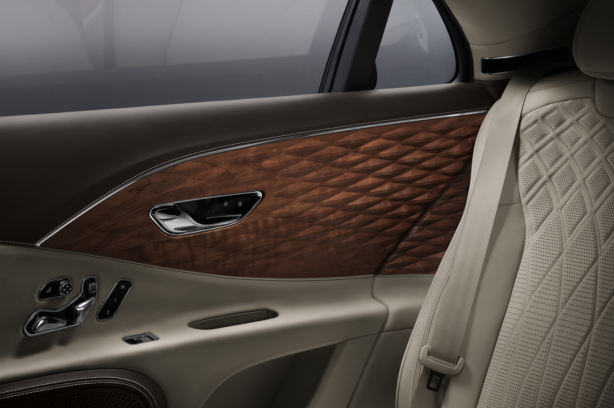 Компания Bentley продолжила свою новаторскую деятельность в области интерьеров. В прошлом году, ещё до премьеры нового седана Flying Spur, она представила его одну занятную особенность — трёхмерную текстурированную кожаную отделку. А теперь британцы внедрили новую опцию для Шпоры: первую в мире на серийном автомобиле «трёхмерную древесину» (Three-Dimensional Wood). Это вставки для задних дверей, выполненные не из шпона, а из толстого цельного массива дерева, на котором операторы сначала вырезают на многокоординатном фрезерном станке основной объёмный рельеф с точностью до 0,1 мм, а потом мастера вручную доводят поверхности до идеала.