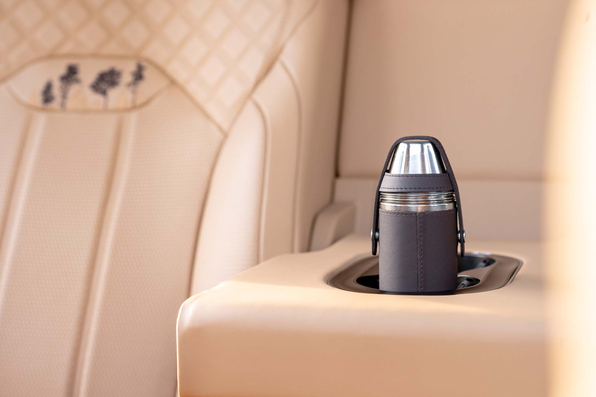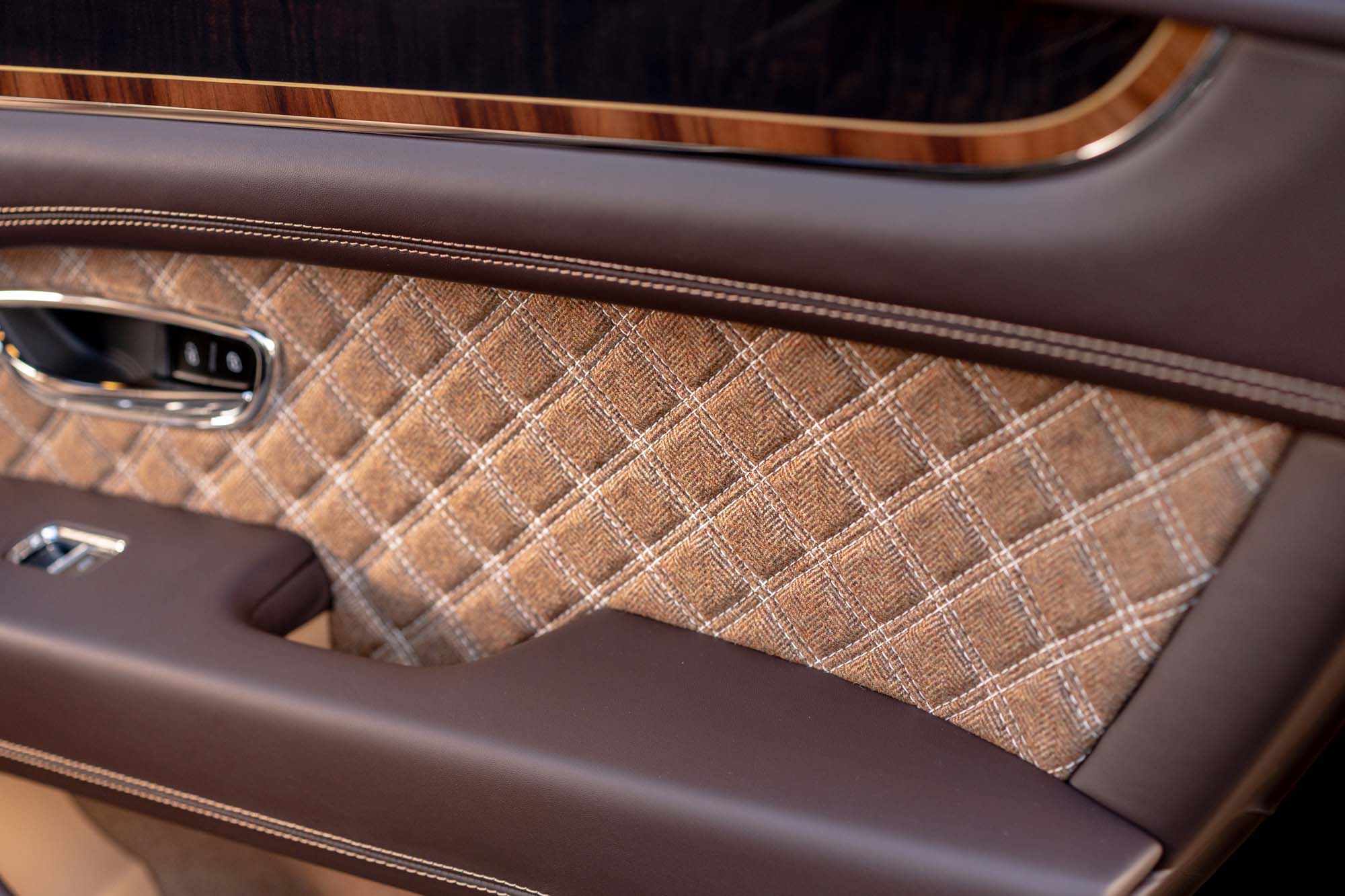 Шерстяная ткань применена на внутренней части дверей, карманах на спинках передних сидений, поручнях, дополнительных деталях на приборной панели. На дверях и передней панели нашлось место шпону Liquid Amber из амбрового дерева с прямыми волокнами, инкрустацией из самшита, дополненного тёмным шпоном из эвкалипта. Передняя панель может быть украшена рисунком с изображением сцены ловли нахлыстом, британских гончих, прыгающей лошади или просто словом «Mulliner».