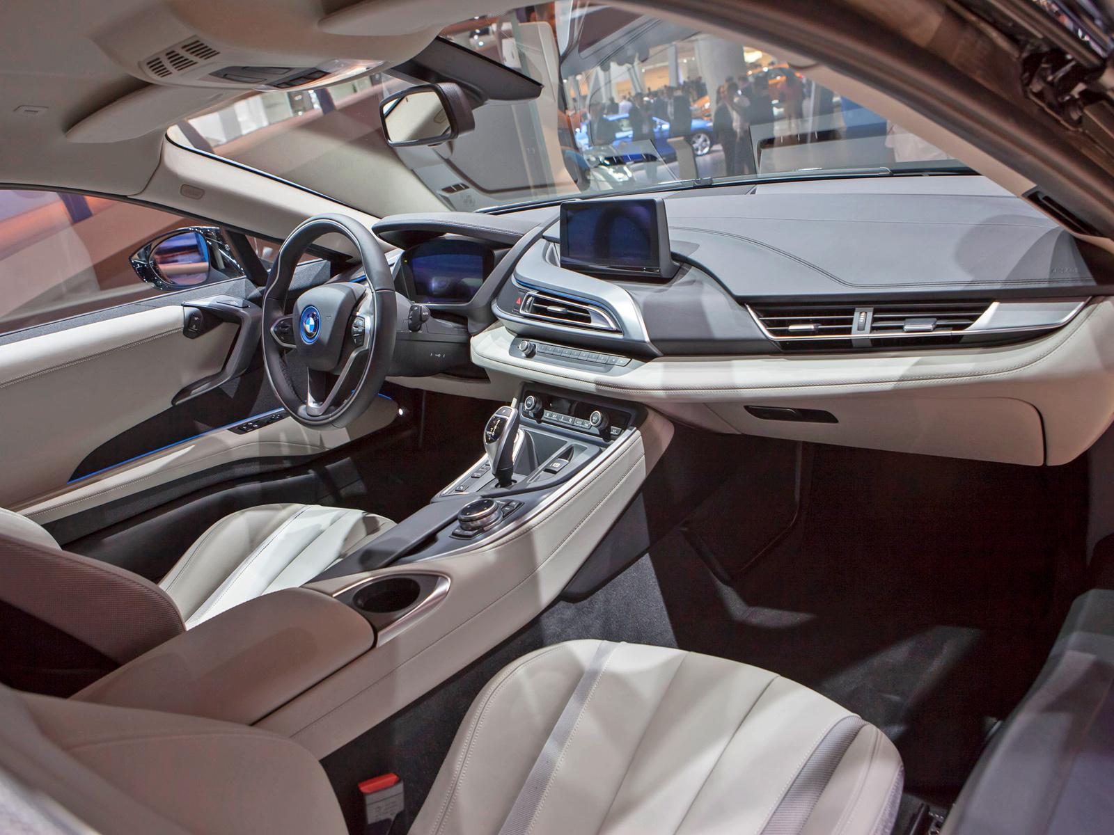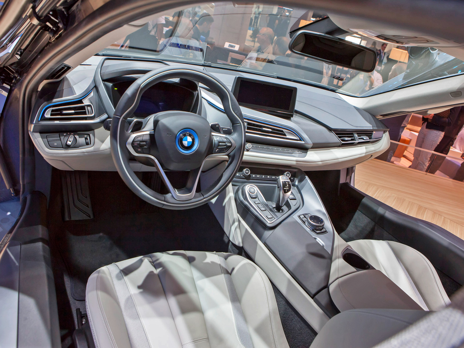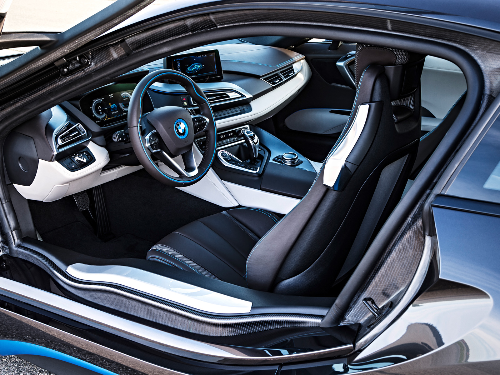 Литий-ионная батарея расположена в центре пола BMW i8, что позволило сделать развесовку по осям идеальной (50 на 50). В зависимости от напряжения зарядной установки (120 или 220 В) аккумуляторы полностью наполняются энергией за три с половиной или полтора часа. Также заряжается батарея при рекуперативном торможении или когда ДВС начинает работать как генератор. Если бензина в баке и энергии в аккумуляторах по максимуму, то автомобиль способен одолеть до 500 км пути. Этот показатель уменьшится до 35 км, если электродвигатель будет трудиться без поддержки бензинового турбомотора. В таком случае и максимальная скорость не превысит 120 км/ч. В общем, чтобы успокоиться, нам осталось только взглянуть на внешность и интерьер серийной машины.