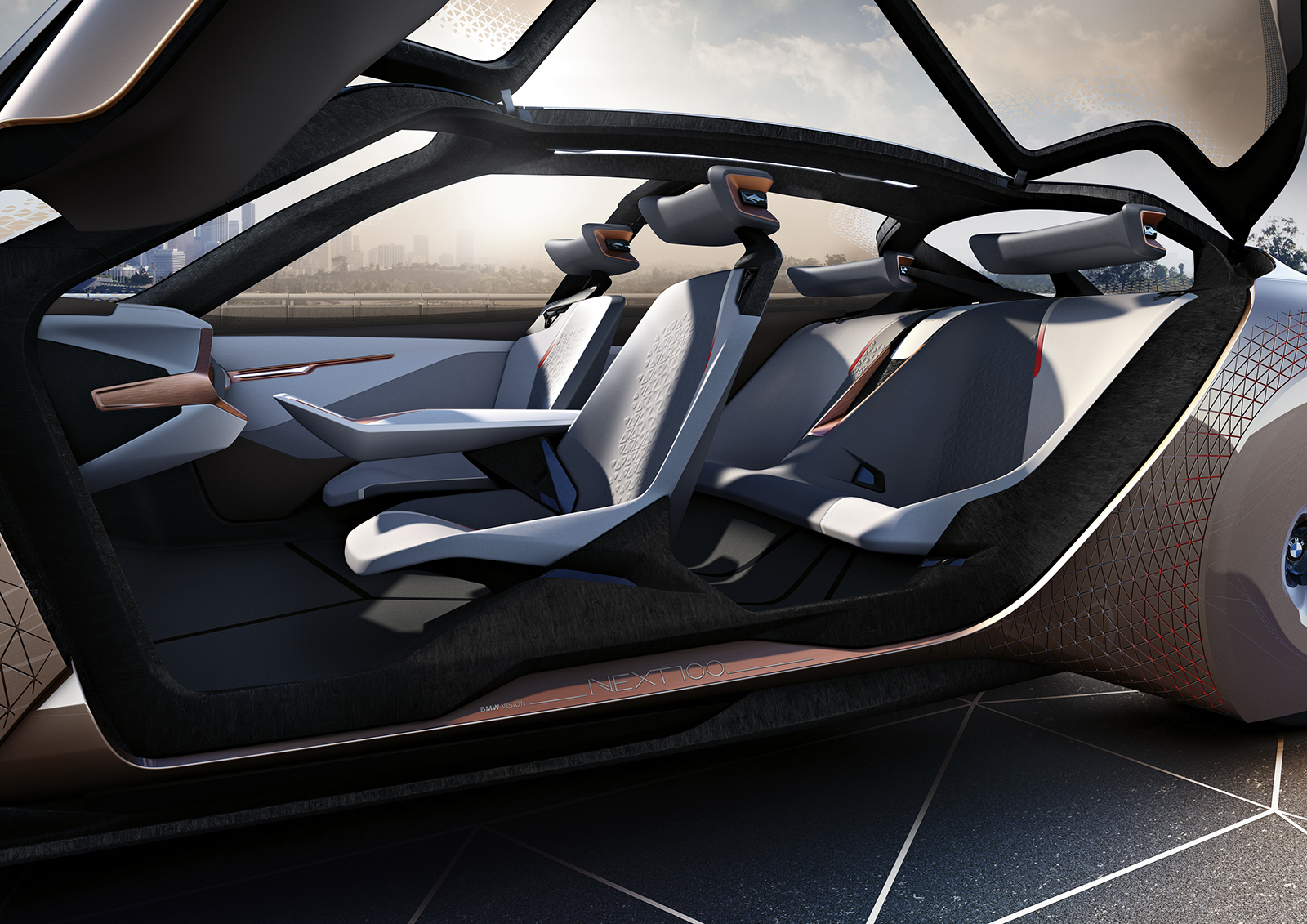 Важное новшество — Alive Geometry («живая геометрия»). Оно представляет собой почти 800 подвижных треугольных модулей, расположенных на крыльях и приборной панели. Баварцы сообщают, что движения этих модулей по трём осям больше похожи на жесты — они выдвигаются, загораются красным и, как стая птиц, подсказывают водителю и другим участникам движения выбранное направление (эдакие скульптурные поворотники), предупреждают о препятствиях на пути. Теперь шоу-кар Vision Next 100 отправится в путешествие BMW Group World Tour. Он посетит Пекин, Лондон, а завершит турне на автошоу в Лос-Анджелесе (18–27 ноября).