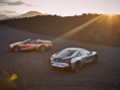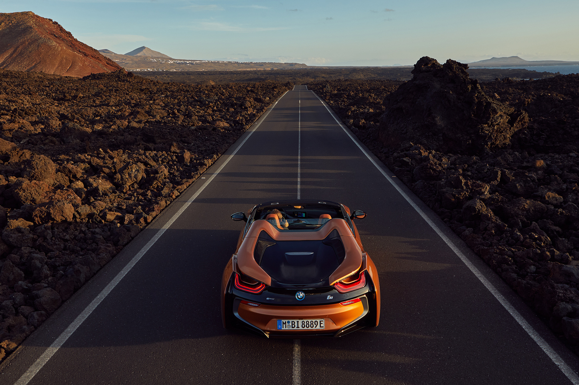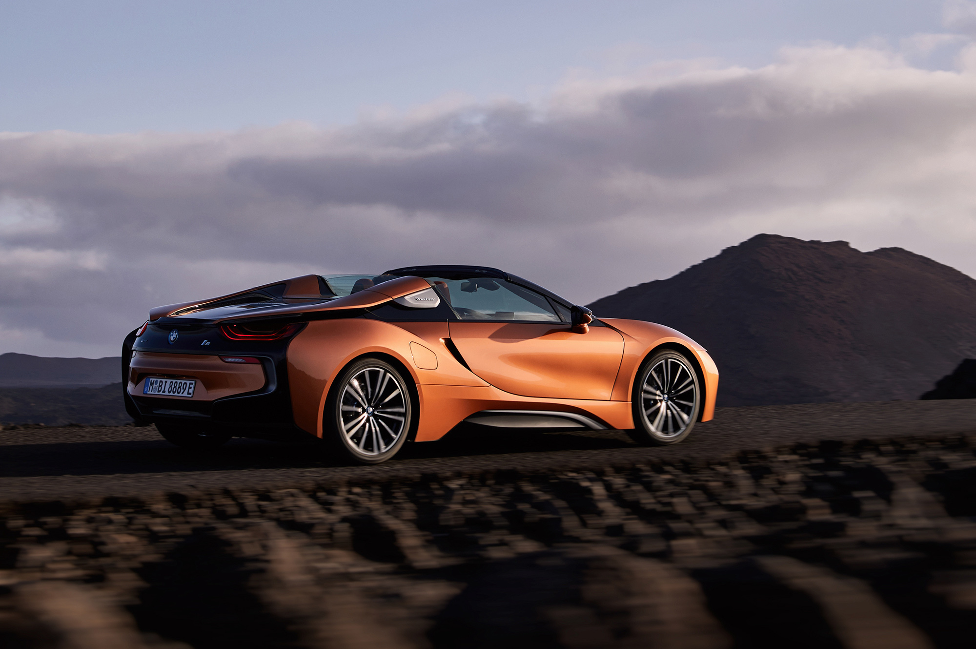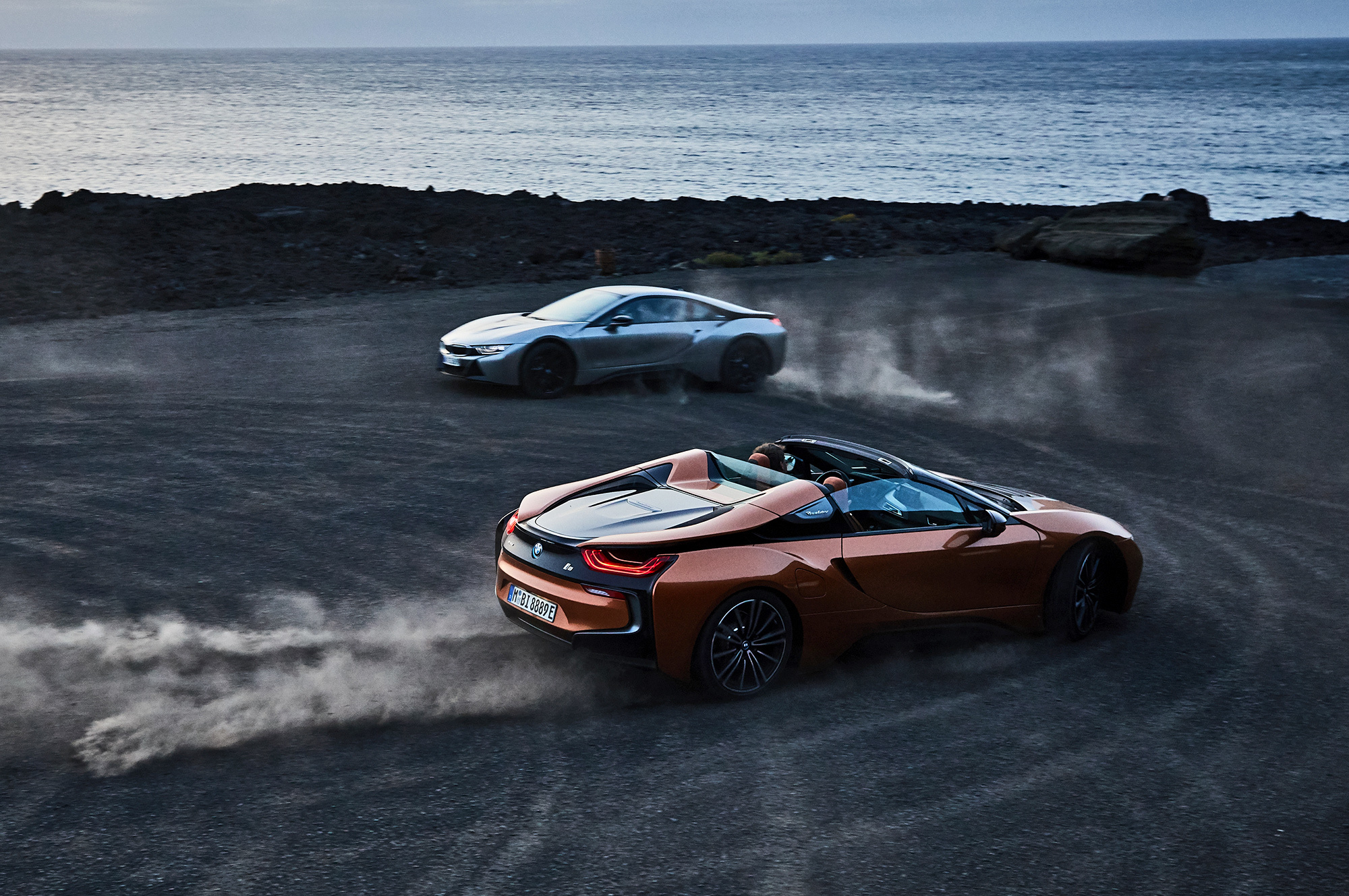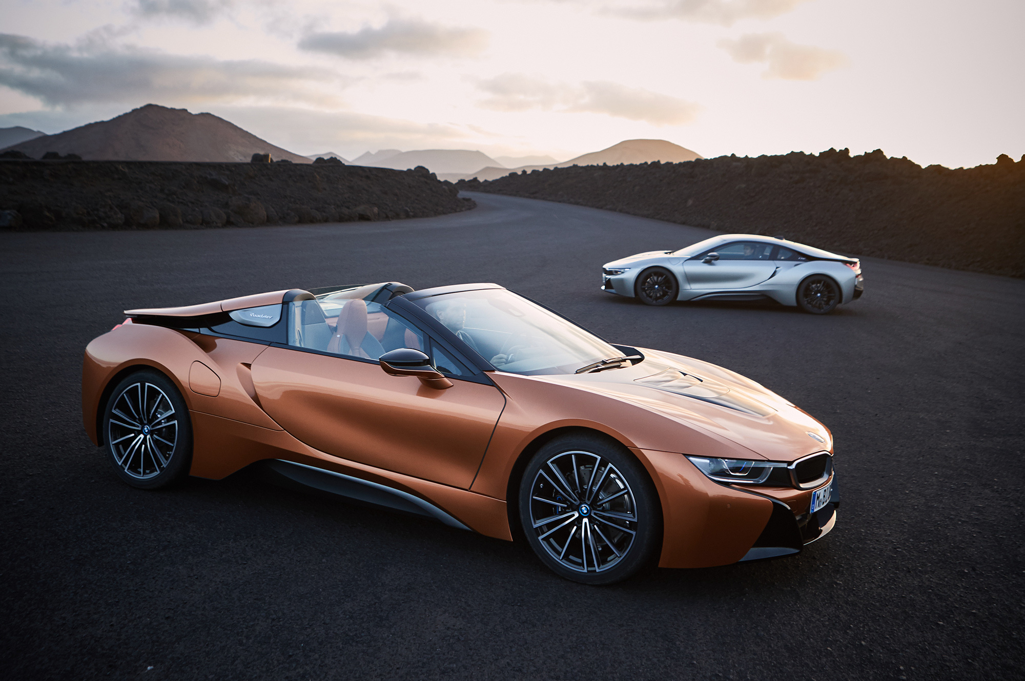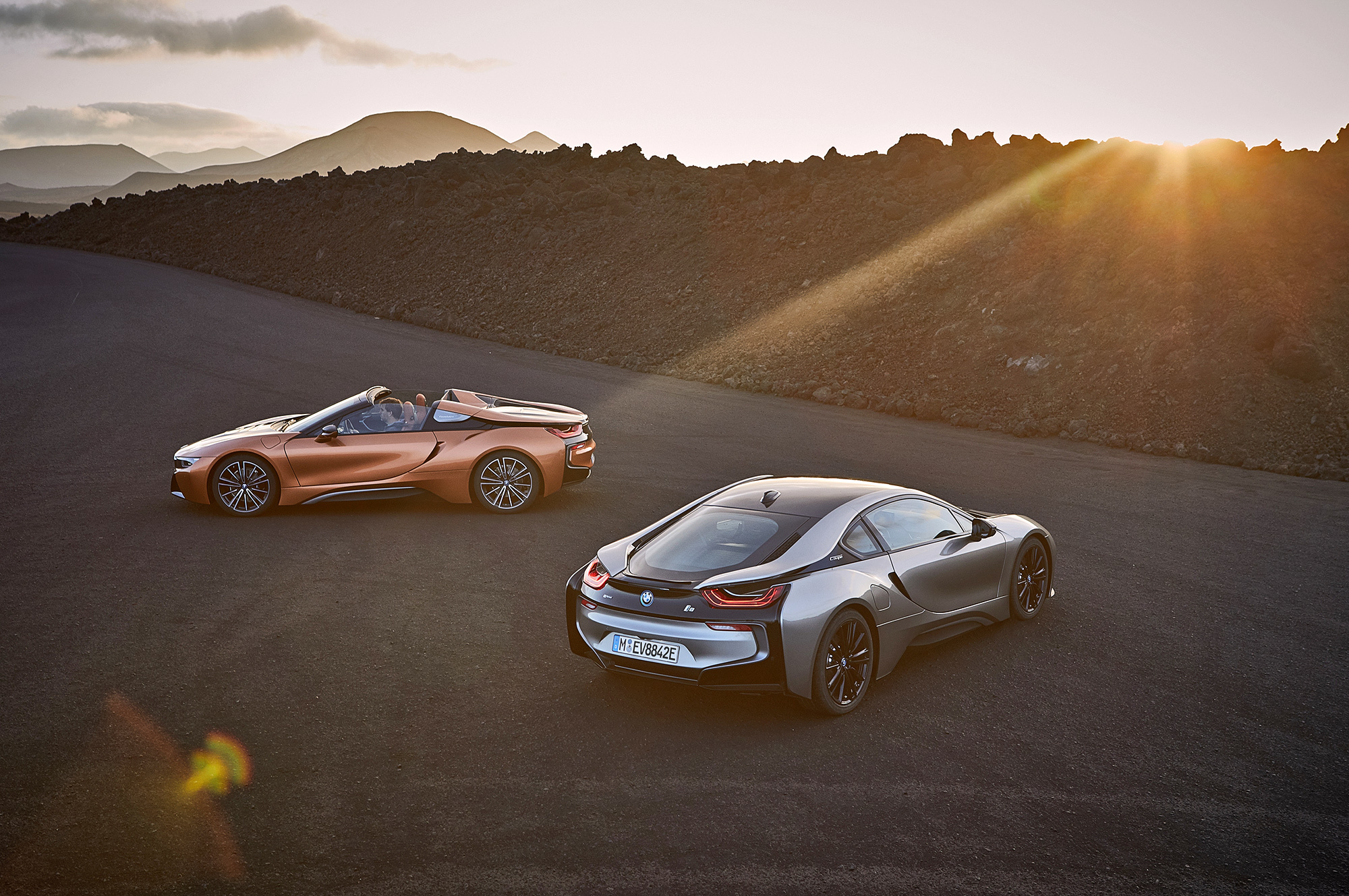 Пусть у BMW i8 ширина колёс, как у тривиального хэтчбека гольф-класса, а за сиденьями пыхтит трёхцилиндровый моторчик 1.5, мюнхенский гибрид стал настоящим шоу-стоппером. А теперь находиться в центре всеобщего внимания будет ещё легче ― в компанию к обновлённому купе немцы добавили одноимённый родстер. За исключением верхней части, у обоих гибридомобилей схожая внешность, и она отличается от дореформенного экстерьера закрытой двухдверки лишь деталями. Например, у купе и открытой версии на задних стойках есть шильдики coupe и roadster, чего раньше на i8 не было. Плюс изменился рисунок колёс.