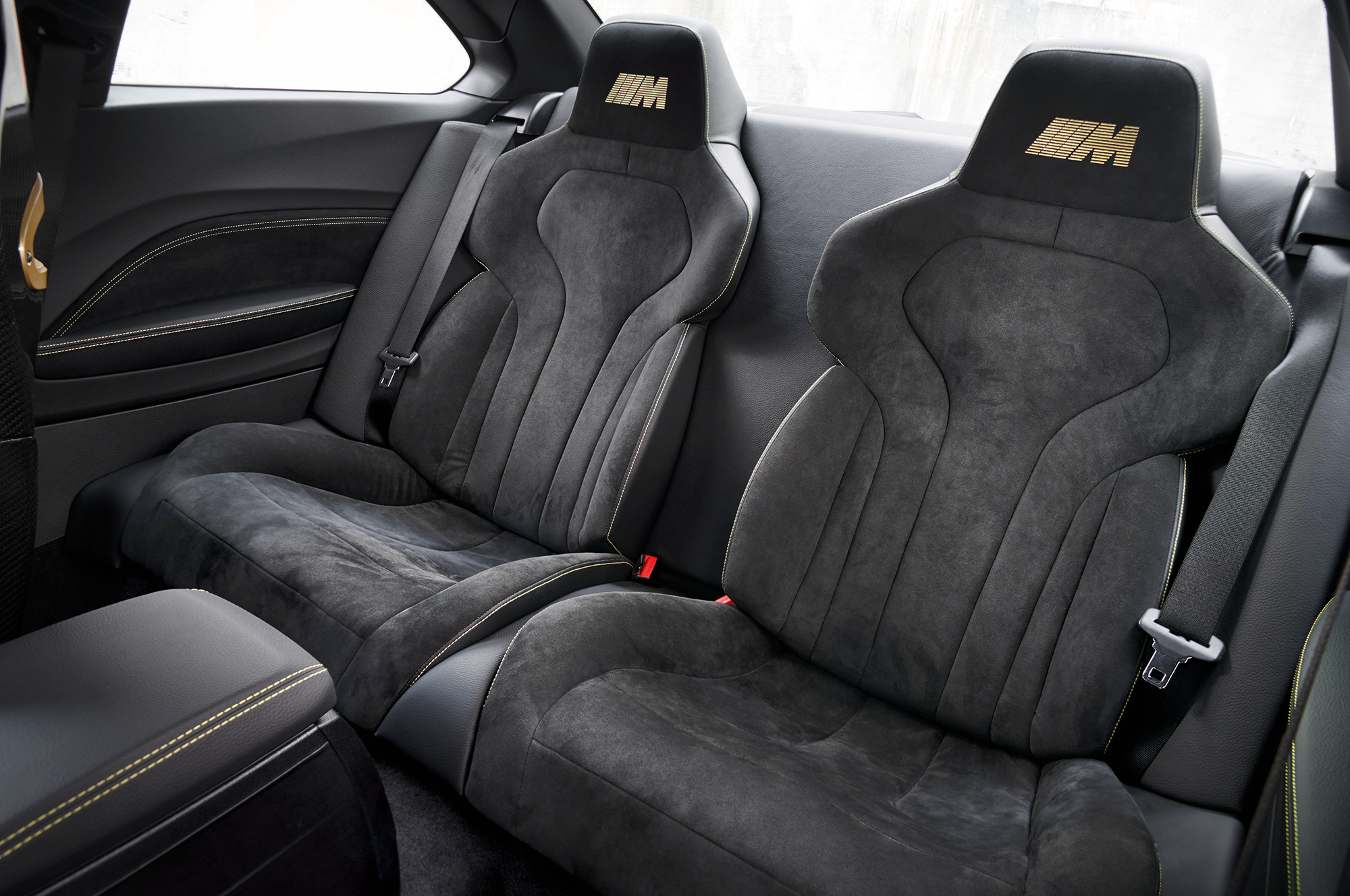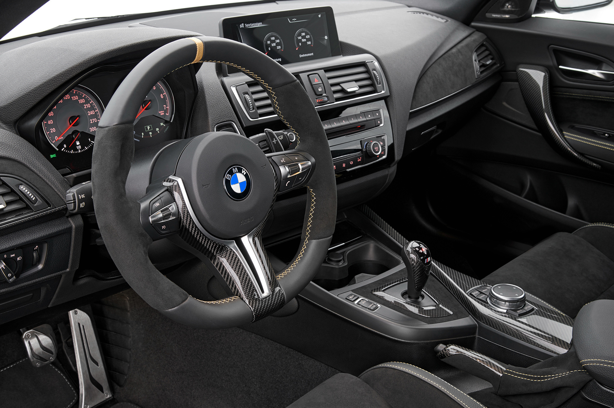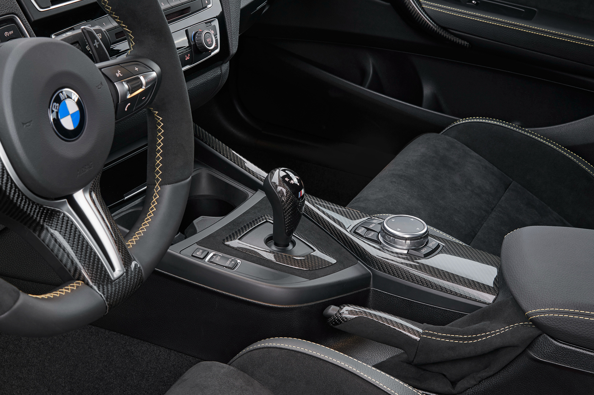 Много углепластика и в салоне. Из него сделаны декоративные вставки на руле, передней панели, центральном тоннеле, рычаге коробки передач и ручного тормоза, дверях и порогах. Композитными также являются основания новых передних спортивных кресел-ковшей, которые легче базовых на девять килограммов. Ещё 13 кг помогли срезать два раздельных задних сиденья вместо более громоздкого дивана. И не забывайте про менее тяжёлый аккумулятор, с которым двухдверка похудеет ещё на 14 кг. А чтобы эффект от облегчения купе BMW M2 Competition был максимальный, нужно докупить винтовую подвеску M Performance (она же KW). Клиренс уменьшится на 20 мм, а амортизаторы обзаведутся двенадцатью настройками на сжатие и шестнадцатью — на отбой.