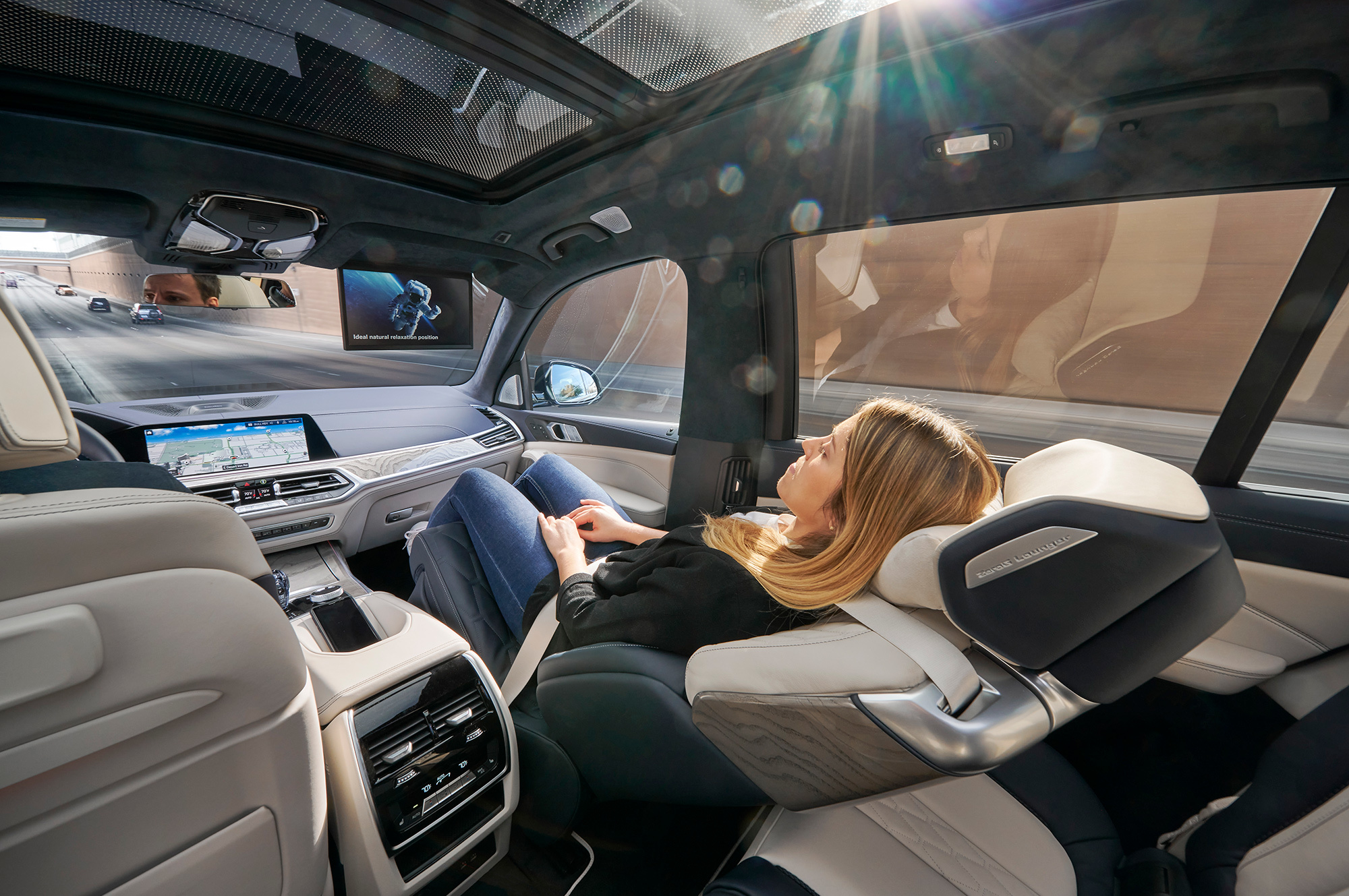 Баварцы провели на шоу CES три премьеры. С концептом BMW i3 Urban Suite мы уже познакомились. Теперь самое время взглянуть на интерьерную установку BMW i Interaction Ease и кресло-шезлонг ZeroG Lounger для кроссовера BMW X7. С роскошного сиденья и начнём, ведь оно станет серийным «в ближайшие несколько лет». Спинку можно откинуть назад на 40 или 60 градусов во время движения, не жертвуя безопасностью: в шезлонг интегрированы ремень и особая подушка в виде кокона. Энергия удара эффективно рассеивается через направляющие.