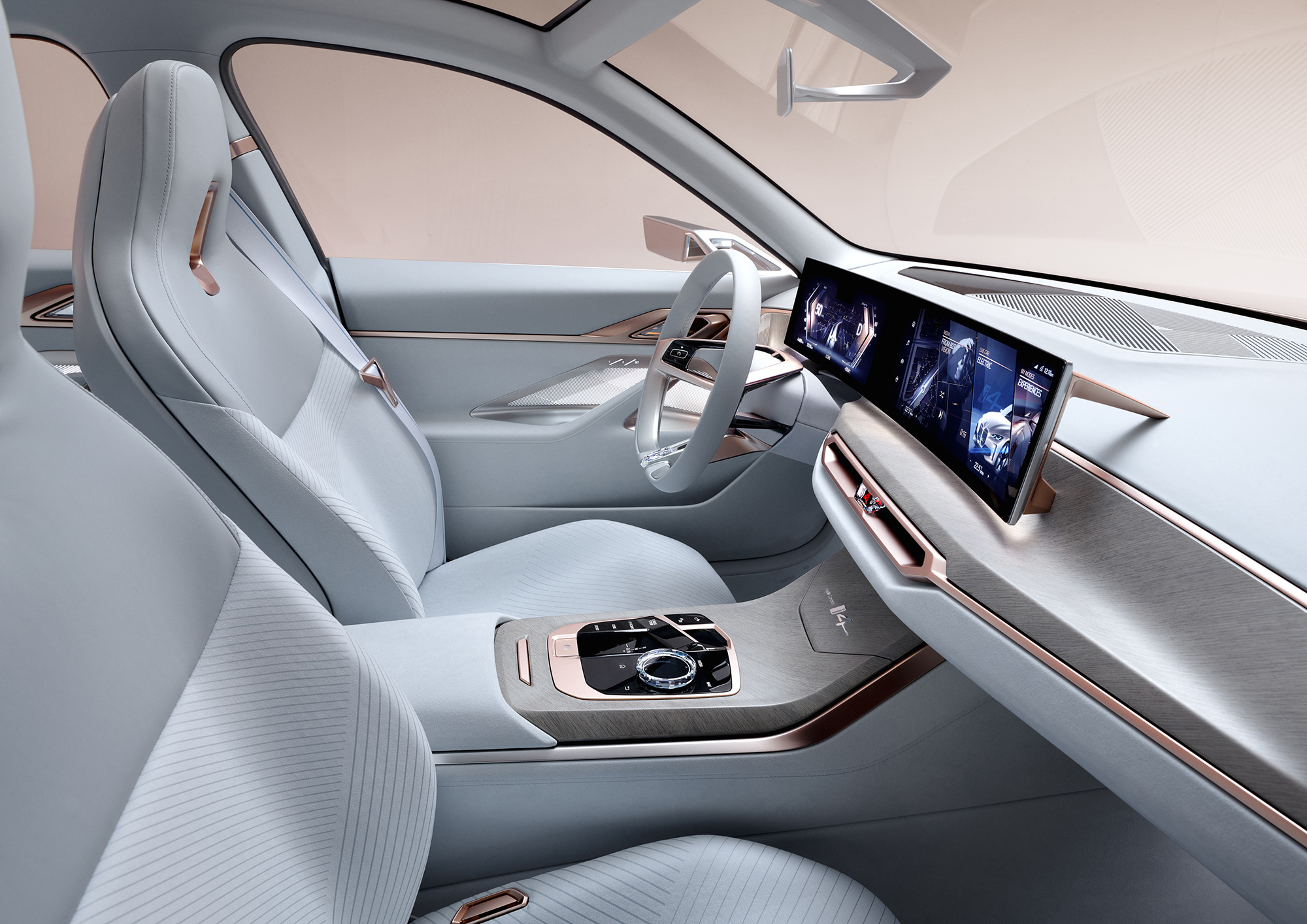 Комбинированная отделка тканью и натуральной кожей прорежена акцентами с оттенками розового золота и бронзы. Дизайнеры говорят, что минимизировали количество швов и постарались сделать бортовую электронику «менее автомобильной». Сиденья не назовёшь спортивными даже в кавычках, хотя интегрированные подголовники со сквозными вырезами должны напоминать именно о спортивных моделях BMW.