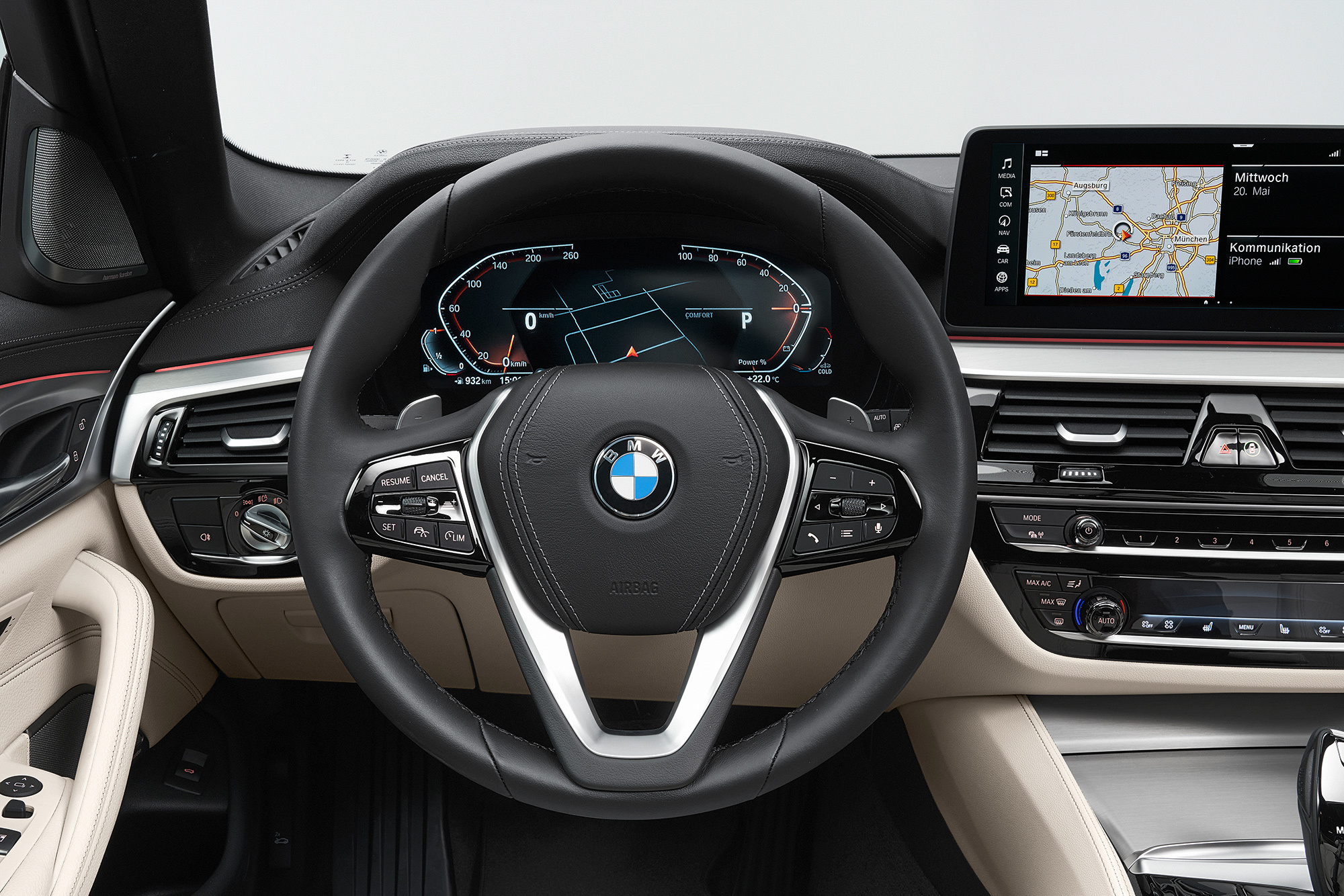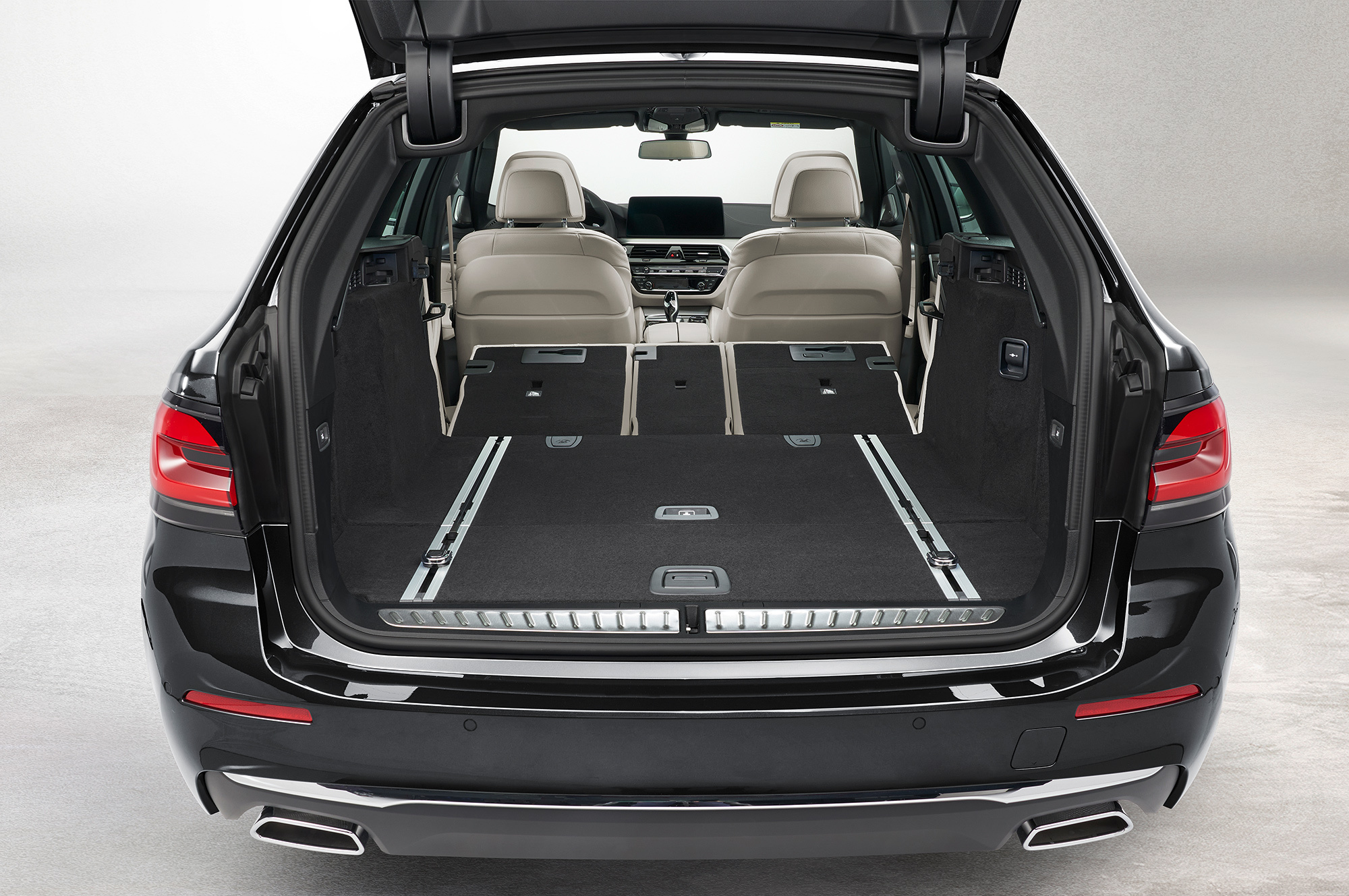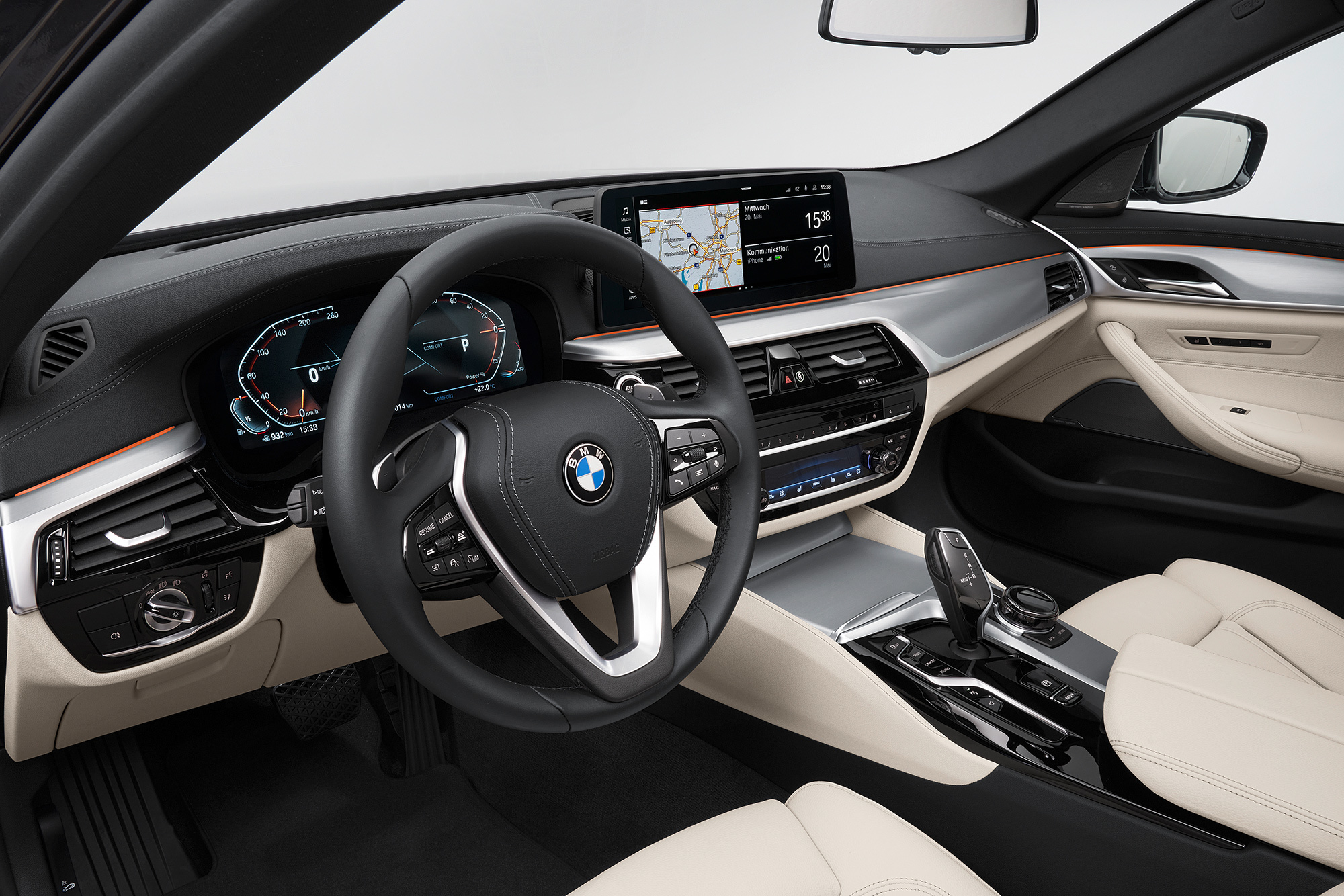 С внешностью обновлённой BMW пятой серии мы знакомы. Изменений снаружи много. Иные теперь решётки радиатора с гранёными планками, светодиодные фары, которые могут быть матричными и лазерными, и фонари с другим диодным рисунком, а трапециевидные патрубки положены теперь всем «пятёркам». Не остались без внимания и бамперы: передний теперь с новой конфигурацией воздухозаборников и декоративными элементами, а у заднего — переделанный диффузор. Плюс свежие цвета кузова и легкосплавные колёса в гамме. В салоне изменились руль, сиденья, мультимедийная система и варианты оформления.