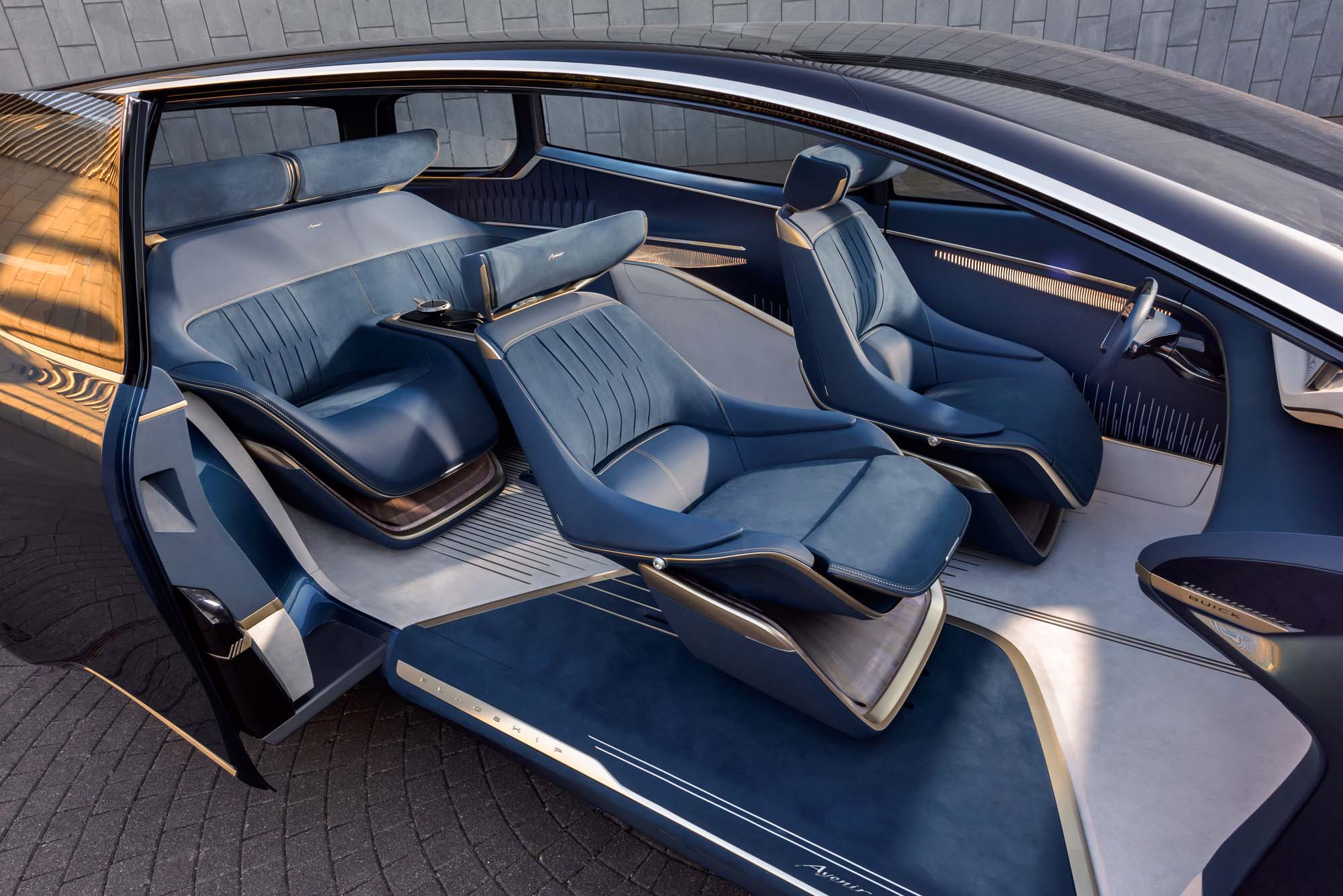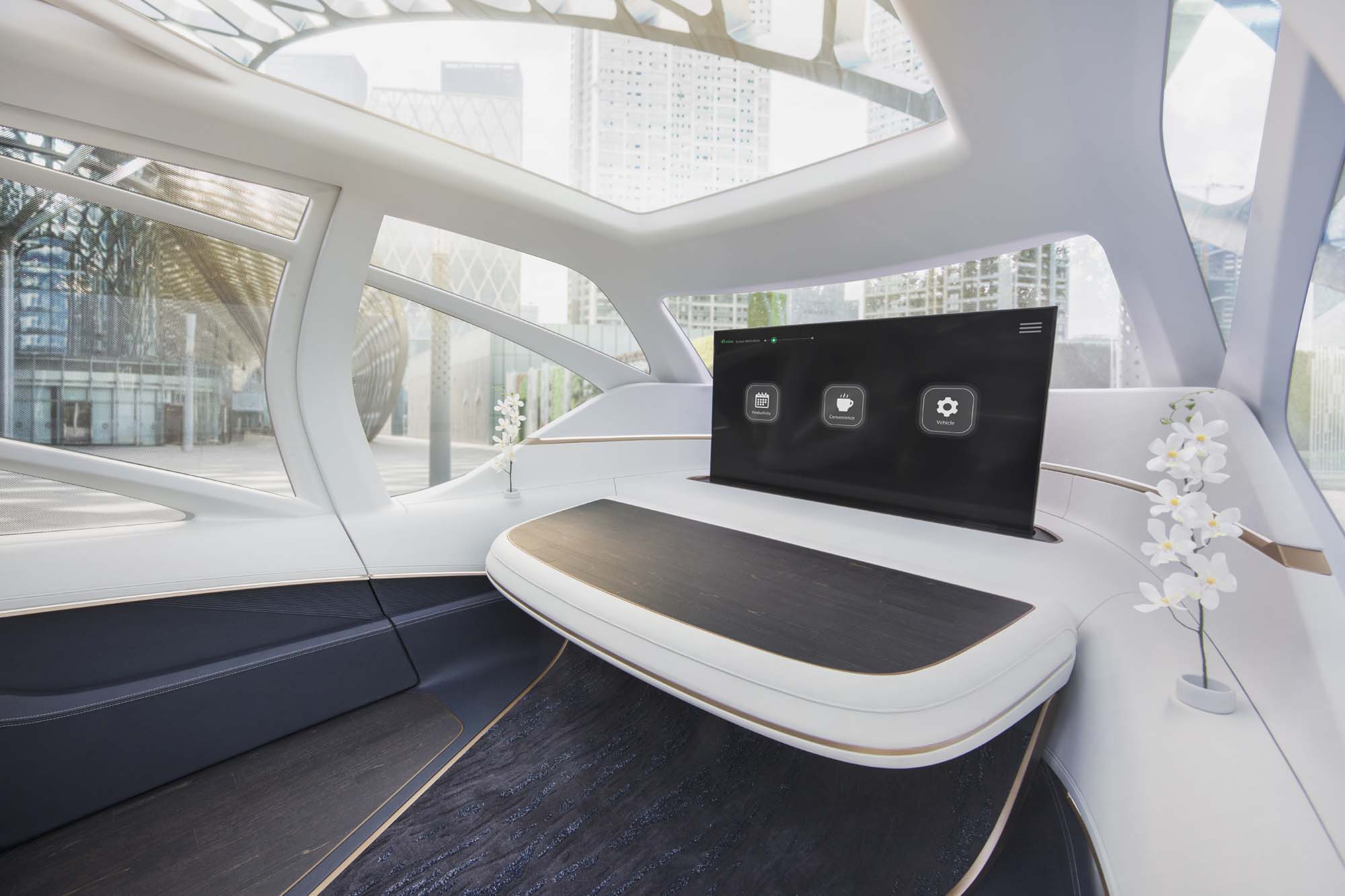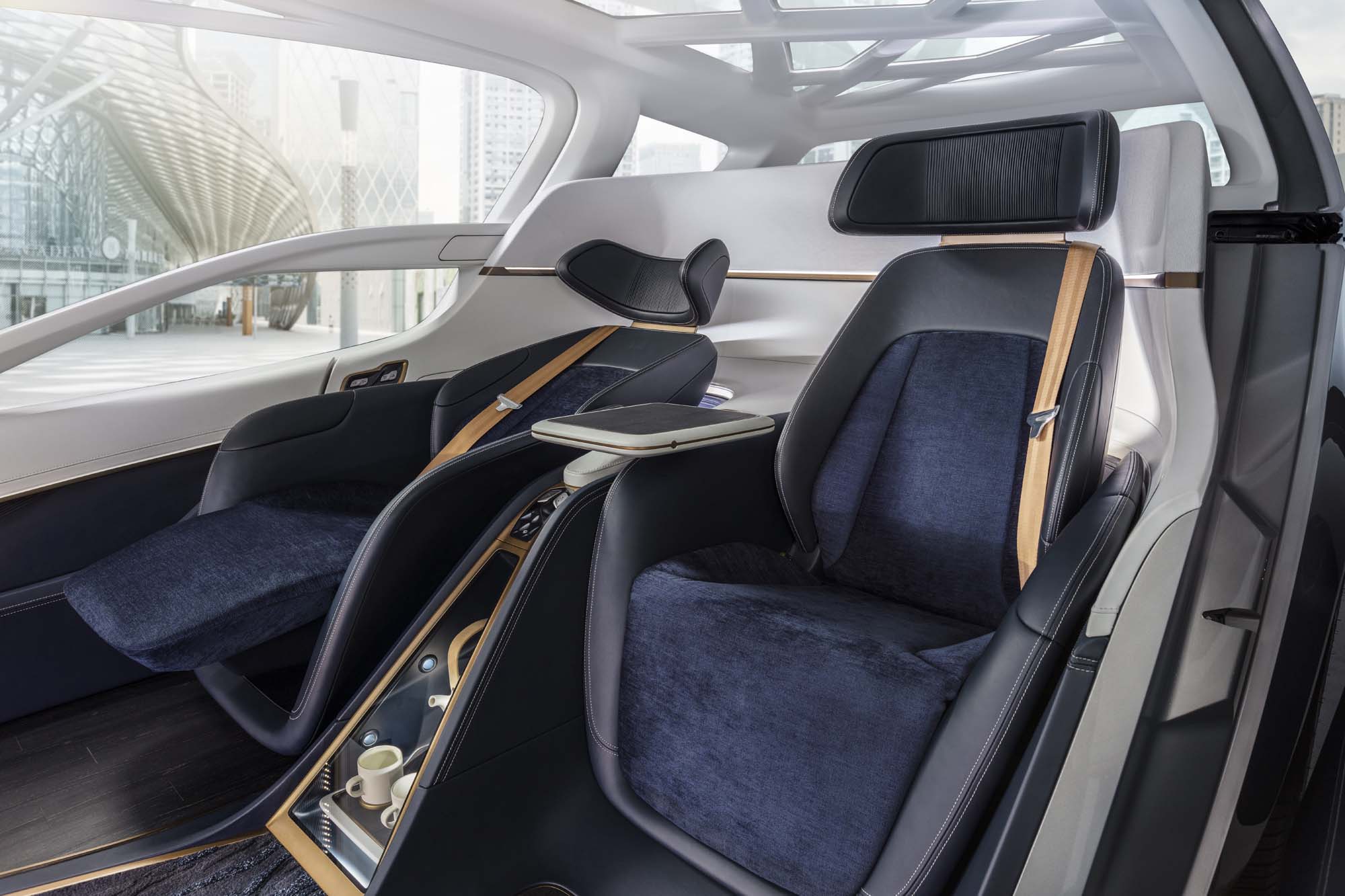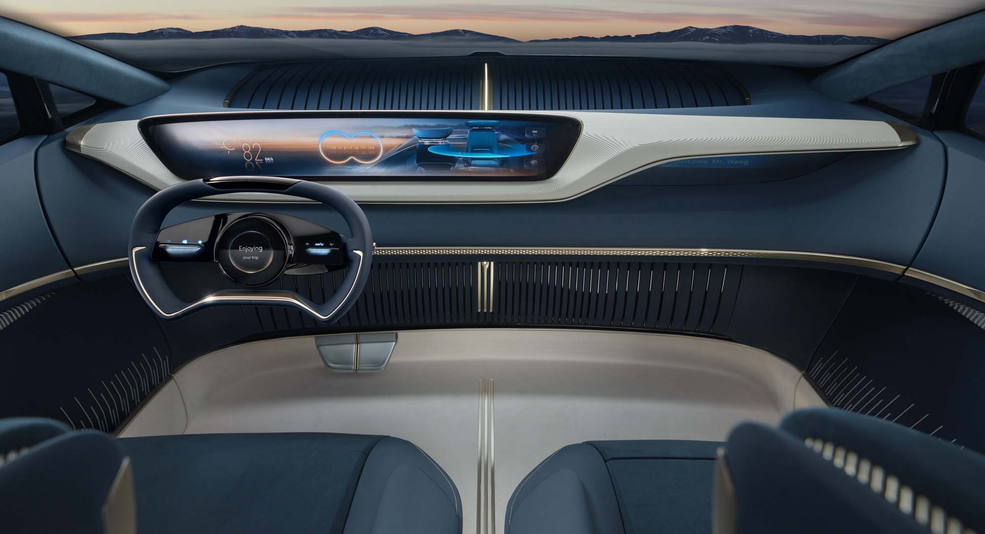 Наружное освещение на светодиодах демонстрирует различную анимированную графику, приглашая в салон с огромной площадью остекления и трансформируемой «мебелью», отделанной с применением натуральных материалов. Автомобиль понимает голосовые команды и отслеживает вгляд пользователей, предлагая благодаря системе искусственного интеллекта различные функции информационно-развлекательной системы. Связь с внешним миром, ради работы или отдыха, возложена на 50-дюймовый выдвижной экран.