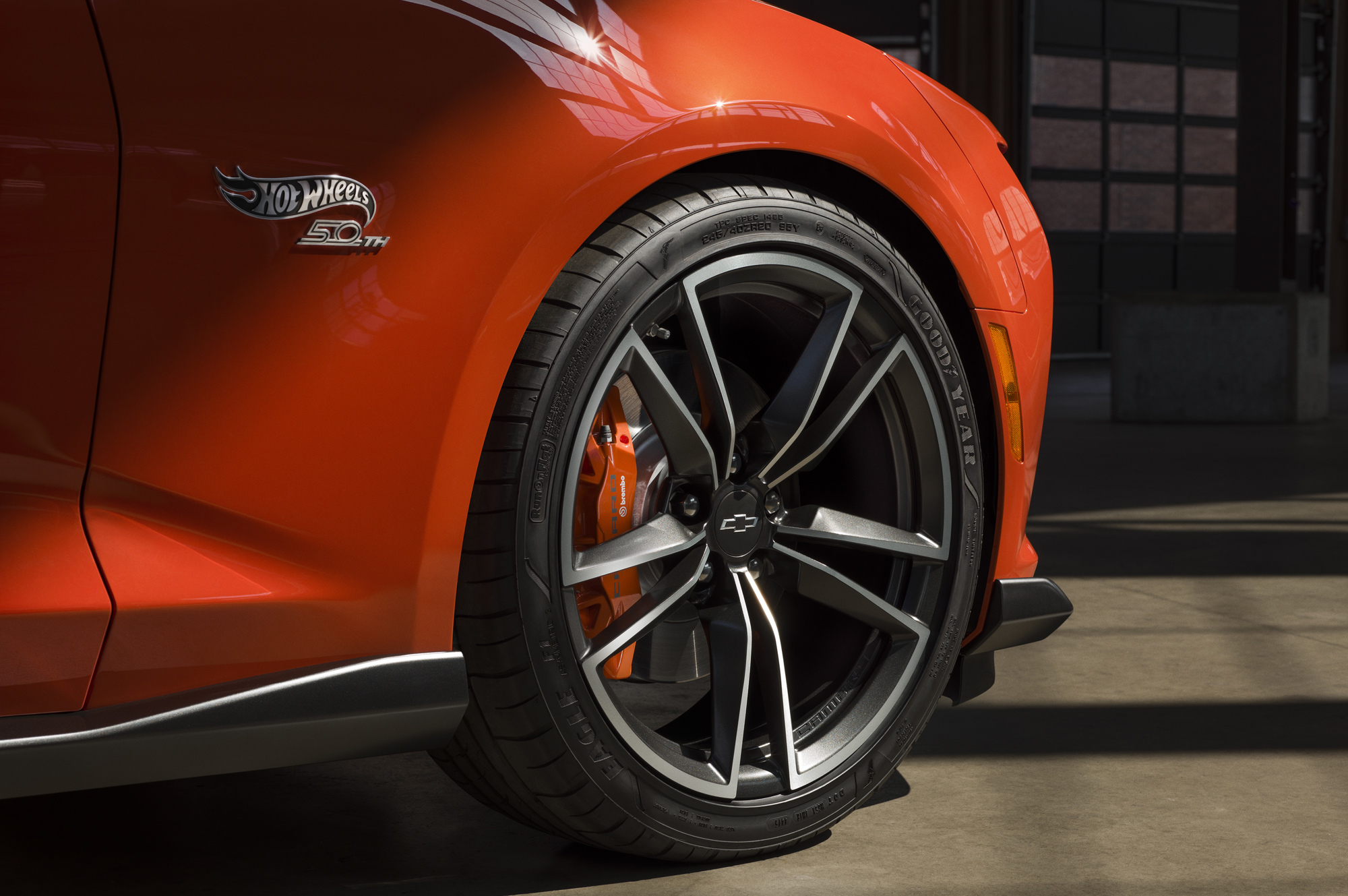 Юбилейная серия выделяется сатиново-графитными полосами на кузове с акцентами «серебряный лёд», 20-дюймовыми коваными алюминиевыми дисками в такой же окраске с фрезерованными гранями и уникальными центральными крышками, беджиками 50th Anniversary Hot Wheels на крыльях, оригинальной решёткой радиатора с вставками Galvano Chrome, оранжевыми тормозными суппортами и тонированными фонарями, чёрной панелью между фонарями с эмблемой Hot Wheels, чёрными «бабочками» Chevrolet.