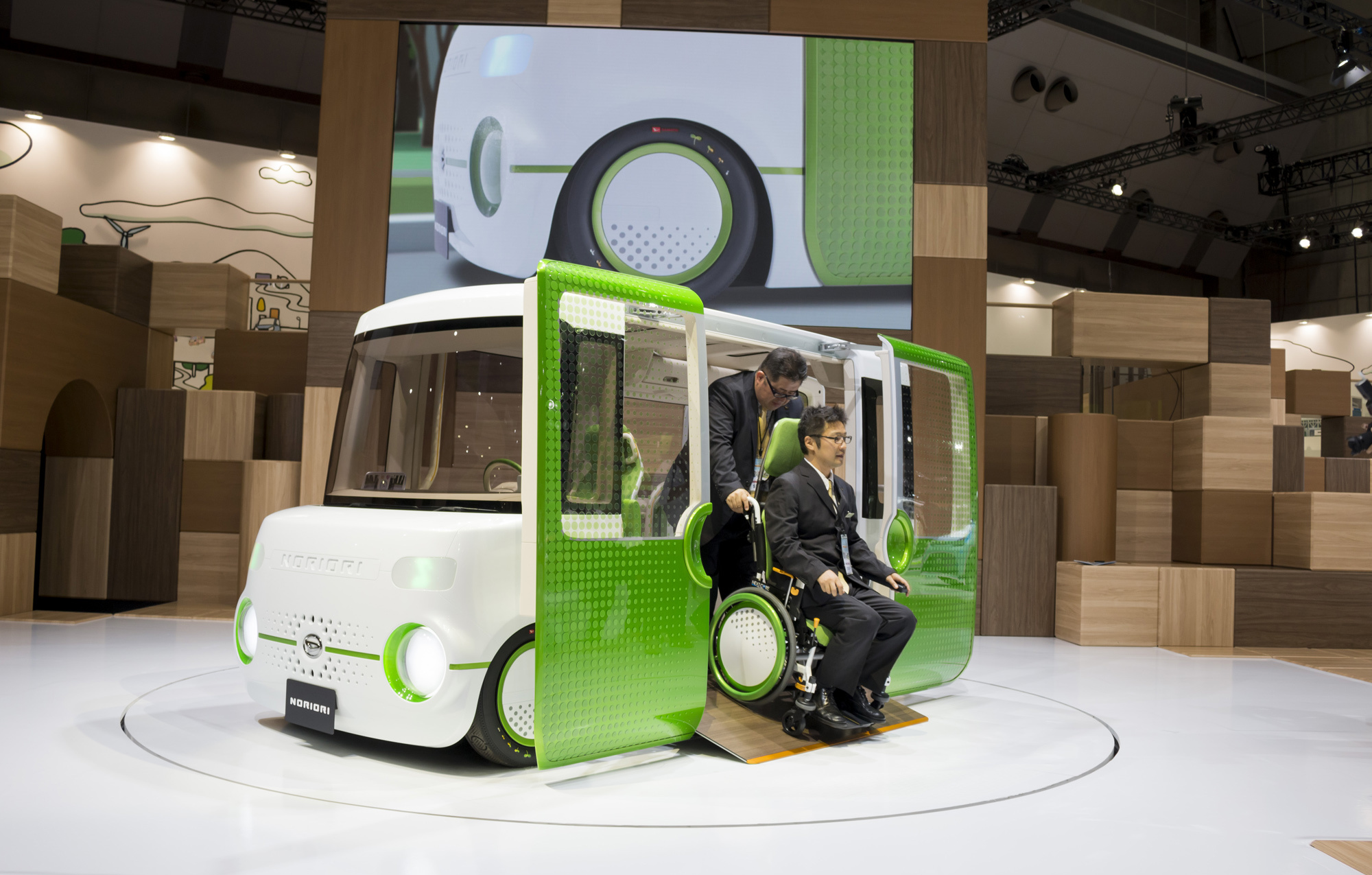 Концепту Nori Ori конструкторы подарили раздвижные дверцы сбоку и огромную дверь сзади. В первом случае имеется ещё выдвижной трап, а во втором — приличных размеров подъёмник. В результате с обеих сторон можно заехать в машину на инвалидной коляске, причём два таких кресла одновременно помещаются в салоне без складывания.