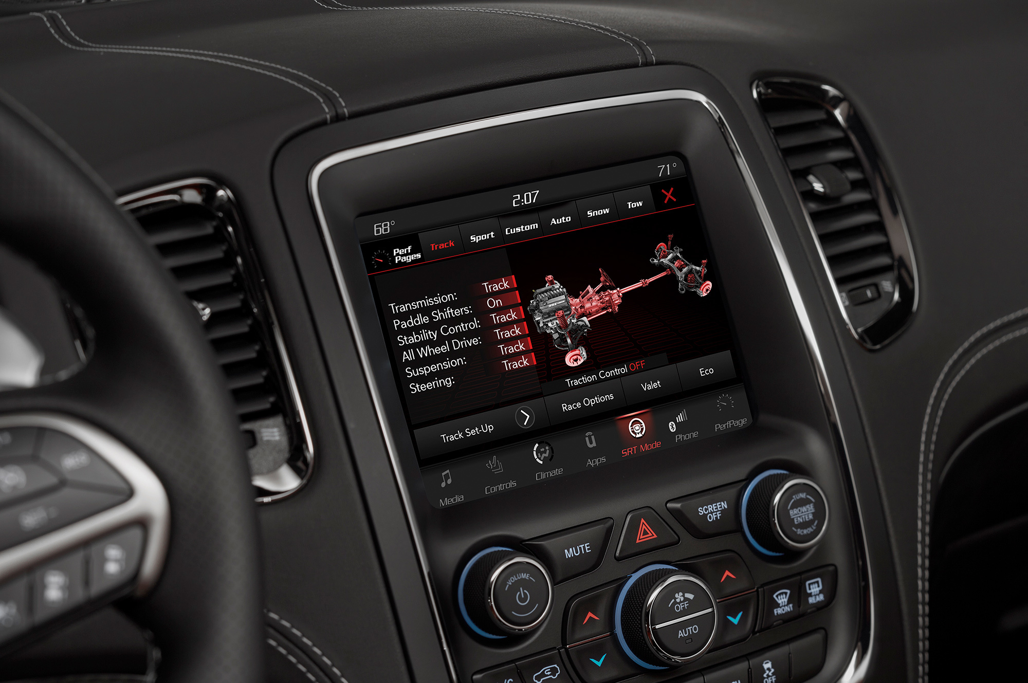 В паре с двигателем работает восьмиступенчатый «автомат», программа работы которого была изменена. В частности, сокращено время переключения. В режиме движения Track (всего их семь — Auto, Sport, Track, Snow, Tow, Valet и ECO) «гидромеханика» меняет ступени за 160 мс. В нём же полноприводная система отправляет на заднюю ось до 70% тяги (в «Спорте» — до 65%, а в режиме «Снег», например, делит тягу в пропорции 50:50). Питер Джейкобсон, менеджер проекта, сообщил также, что у Durango SRT поворачиваемость нейтральная, а под сброс газа — небольшая избыточная.