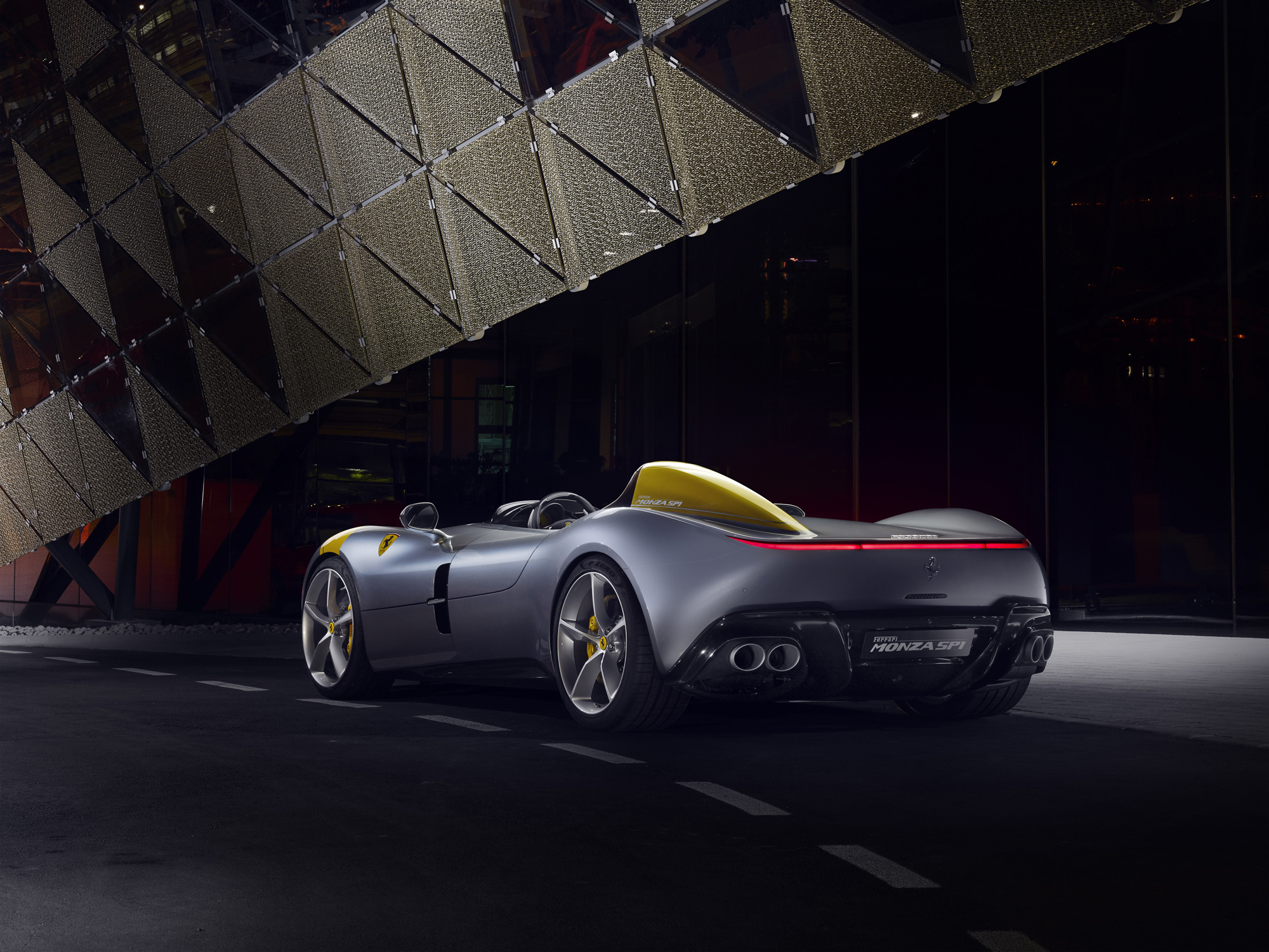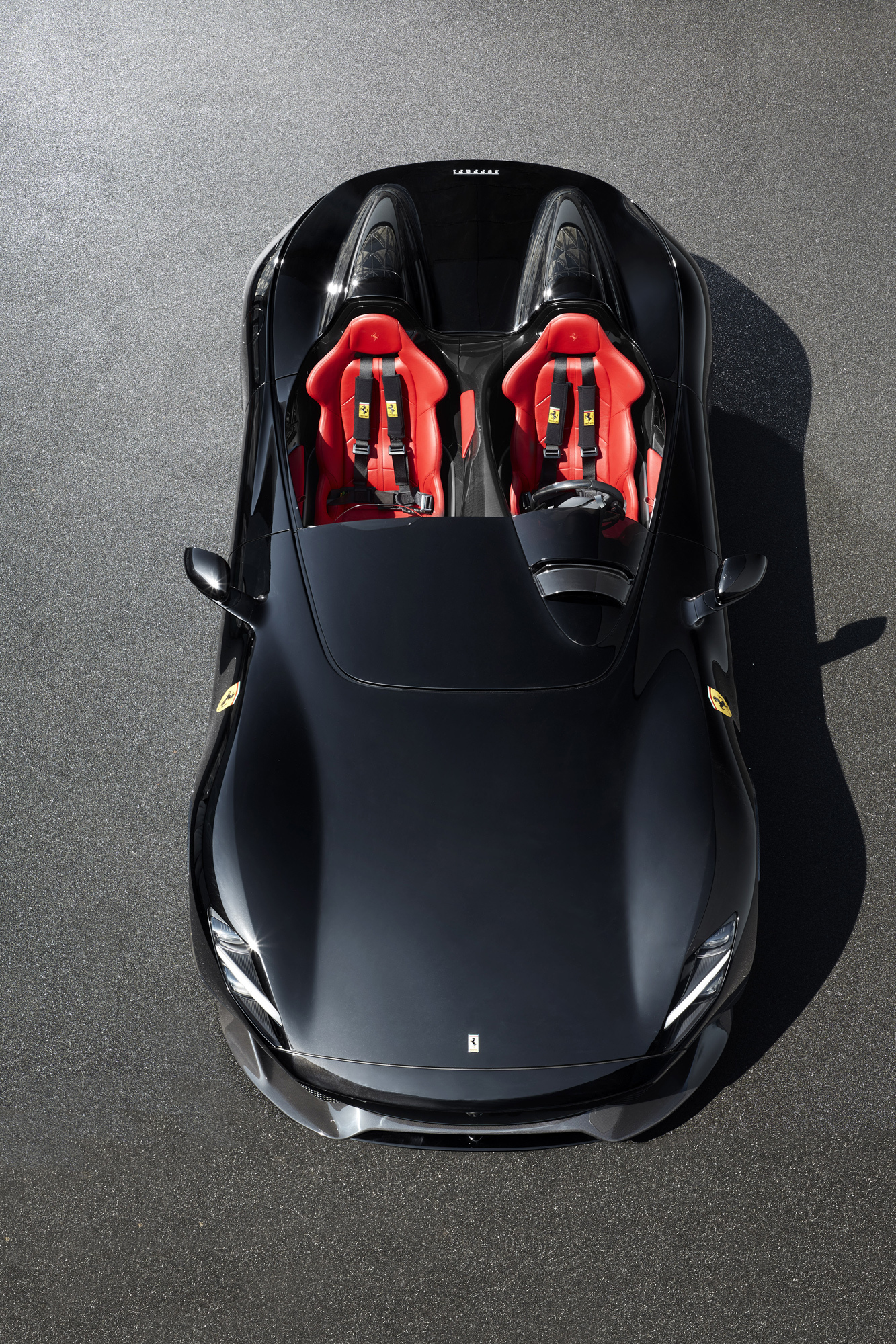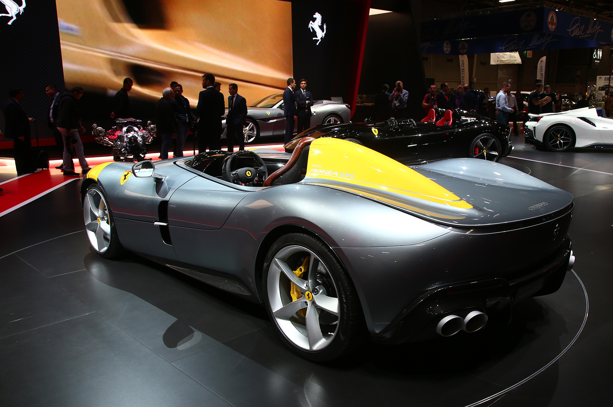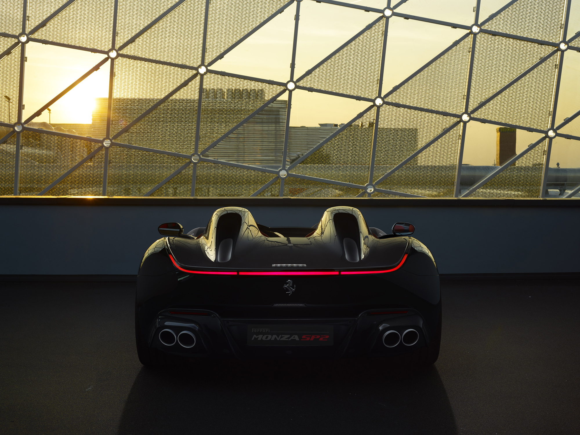 Удивительно, но большой экономии массы удаление крыши не принесло, что косвенно говорит о мерах по усилению жёсткости открытого кузова. Если сухая масса 812-й с «лёгкими» опциями равна 1525 кг, то у Монцы SP1 она составляет 1500 кг, а у SP2 — 1520 кг. Однако Монцы ещё и немного мощнее прародителя. Их «атмосферник» V12 6.5 развивает 810 л.с. и 719 Н•м против 800 л.с. и 718 Н•м у исходника. Весь кузов, к слову, выполнен из углепластика, он же использован в отделке интерьера, в котором оказалось лишь немного элементов от 812-й (скажем, комбинация приборов и дефлекторы вентиляции).