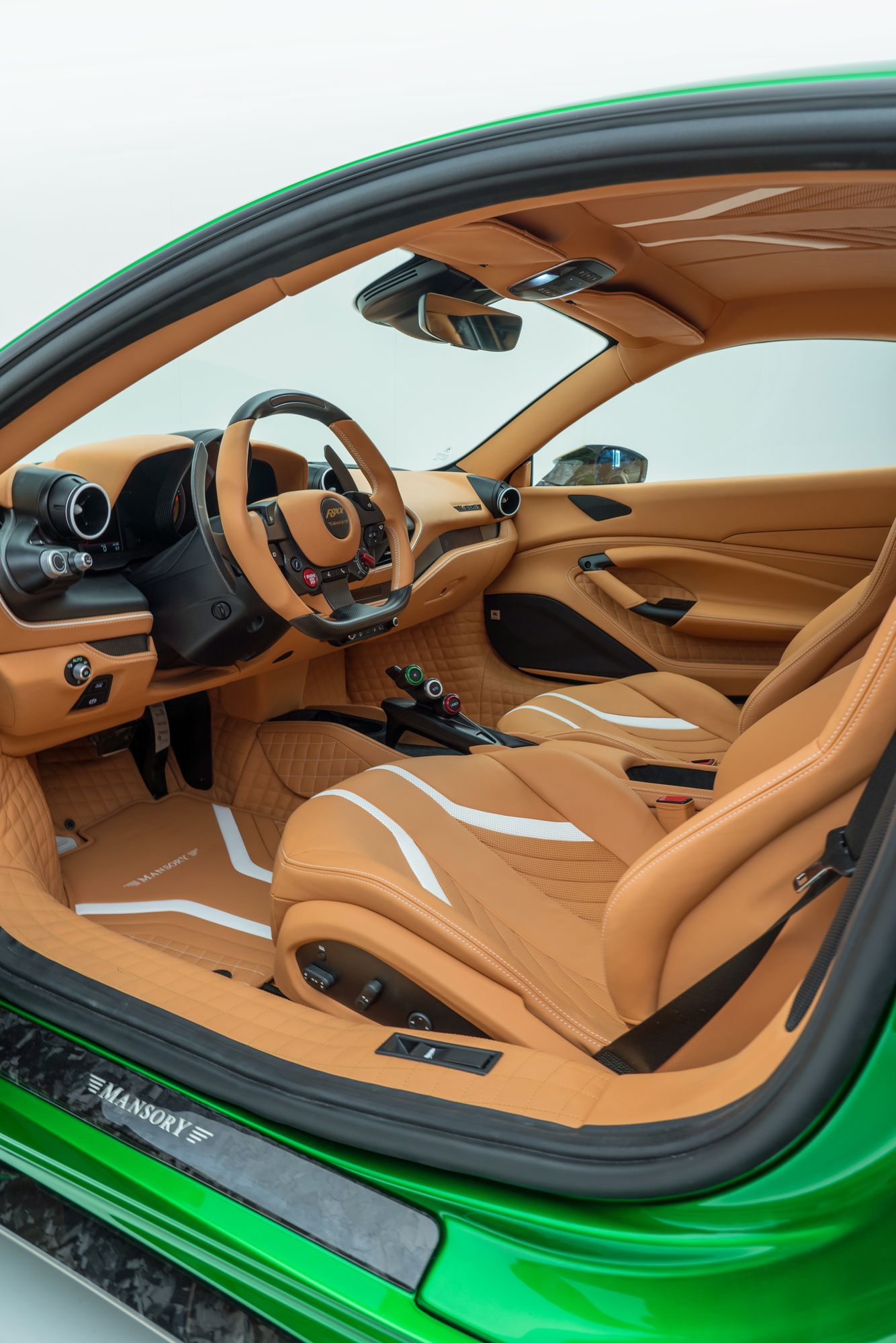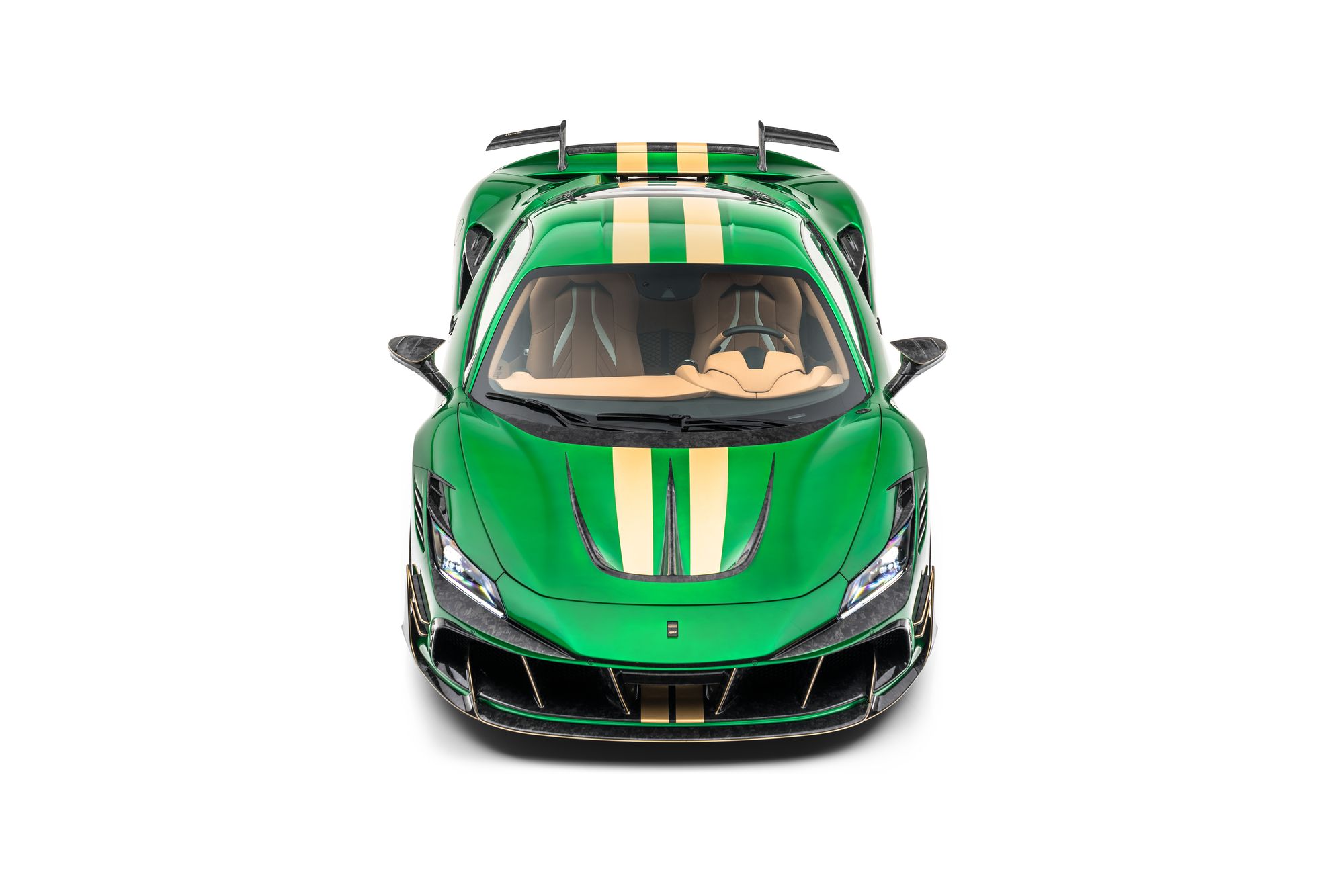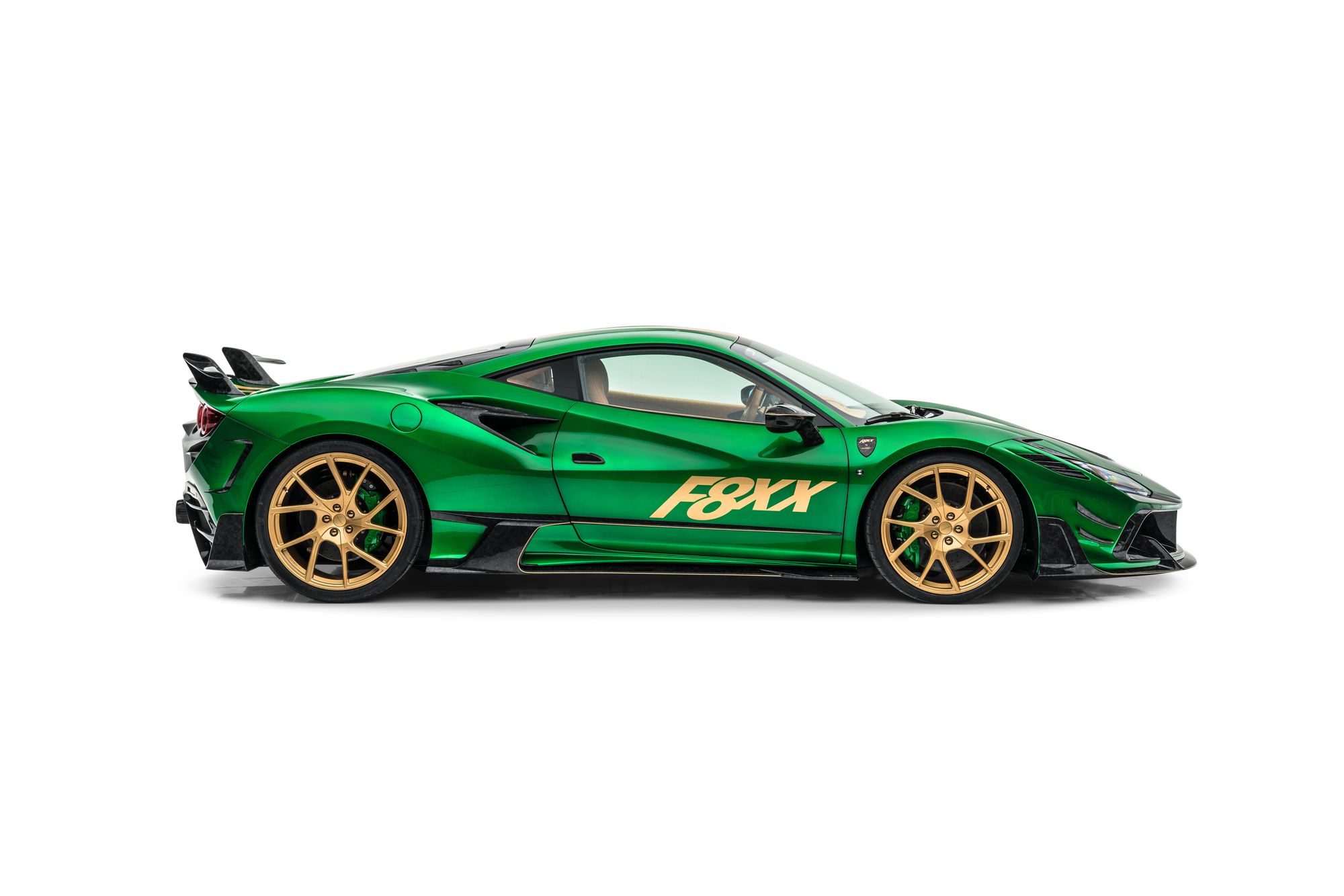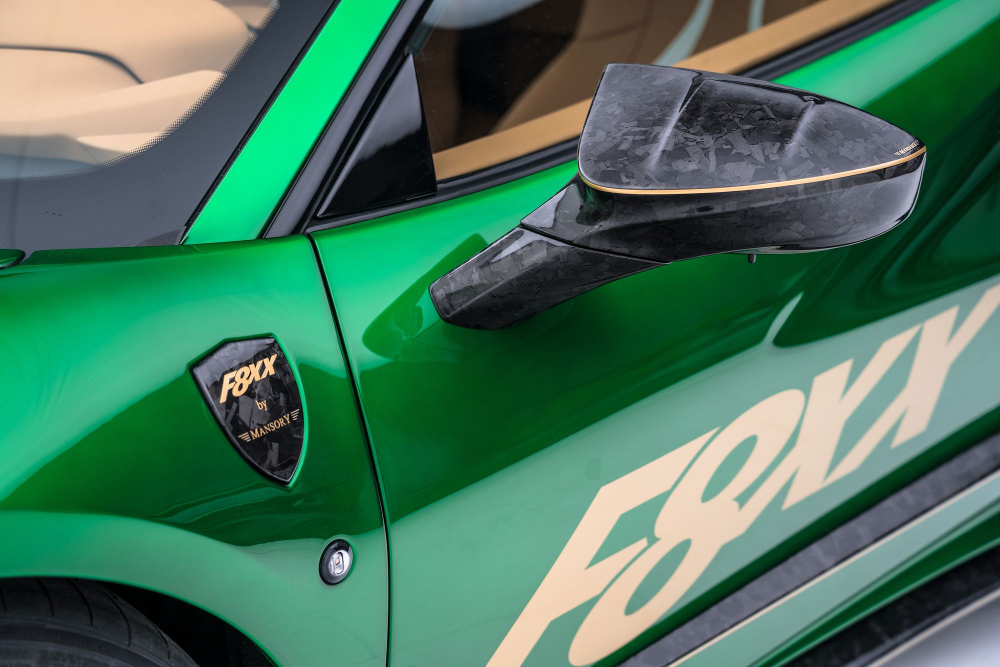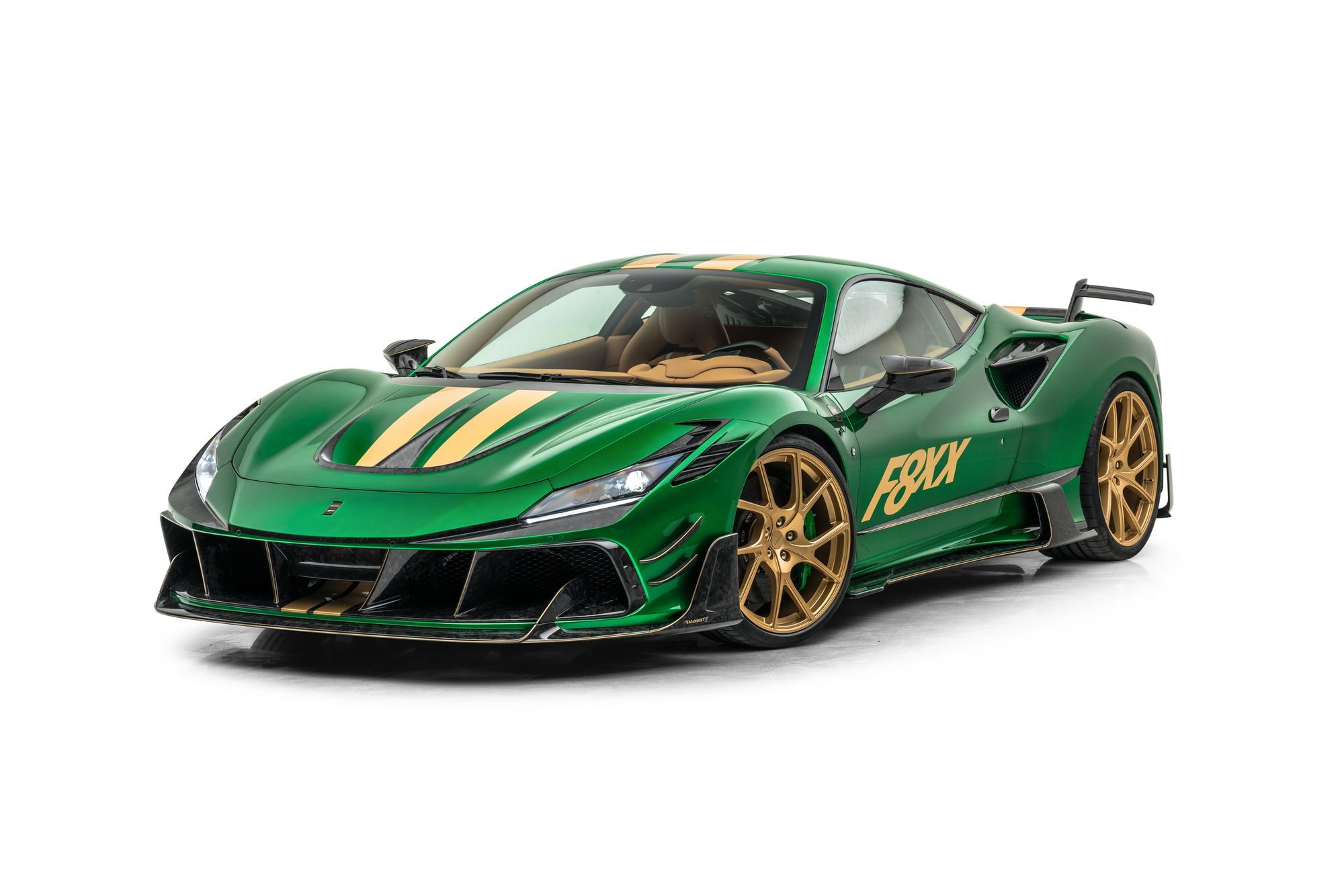 Очередная работа от Mansory не выглядит чем-то особенным. Как и прочие автомобили, выехавшие из ворот ателье, купе F8XX на базе Ferrari F8 Tributo получилось пёстрым. Кузов окрашен в яркий цвет Catania Green, а полоски, надписи на дверях и кованые колёса — в золотистый. Не забыли и о диковатом аэродинамическом обвесе, каждый элемент которого выполнен из углеволокна. Однако специалисты Mansory сделали двухдверку F8XX исключительной в другом плане — техническом. Это самый мощный спорткар Mansory, построенный на базе среднемоторной модели Ferrari.