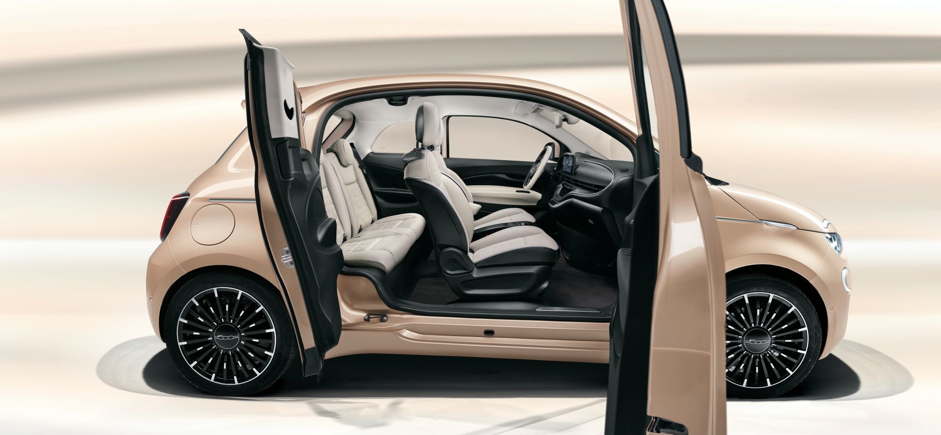 Третье поколение хэтчбека Fiat 500 дебютировало в марте этого года, подтвердив полный переход модели на электротягу. Тогда новинка явилась миру исключительно в варианте со складной мягкой крышей, а спустя три месяца был раскрыт и обычный трёхдверный хэтчбек. При этом начинка осталась безальтернативной: электромотор мощностью 120 л.с. и литиево-ионная батарея ёмкостью 42 кВт•ч. Запас хода — 320 км по циклу WLTP. Теперь же представленный Fiat 500 3+1 предложит не только новые силовые агрегаты, но и дополнительную дверь, напоминающую такие автомобили, как Mazda RX-8, BMW i3 или, например, Mini Clubman первого поколения.