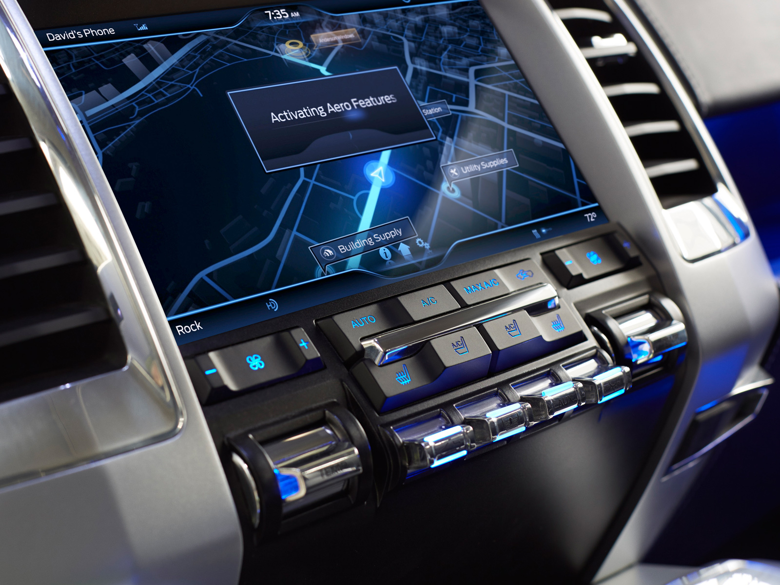 Хорош Atlas, ничего не скажешь! Выглядит мощно, внушительно, по-американски в лучшем смысле этого понятия. Но создатели предлагают обратить большее внимание на другие вещи. Например, на решётку радиатора с активными жалюзи, которые для лучшей аэродинамики закрываются при движении на постоянной высокой скорости. Электрорегулируемые закрылки установлены в колёсных дисках между спицами, электроприводом оснащён и передний спойлер, выдвигающийся на скорости для оптимизации воздушных потоков под днищем. И, конечно же, Ford Atlas довольствуется турбомотором EcoBoost нового поколения с системой start/stop.