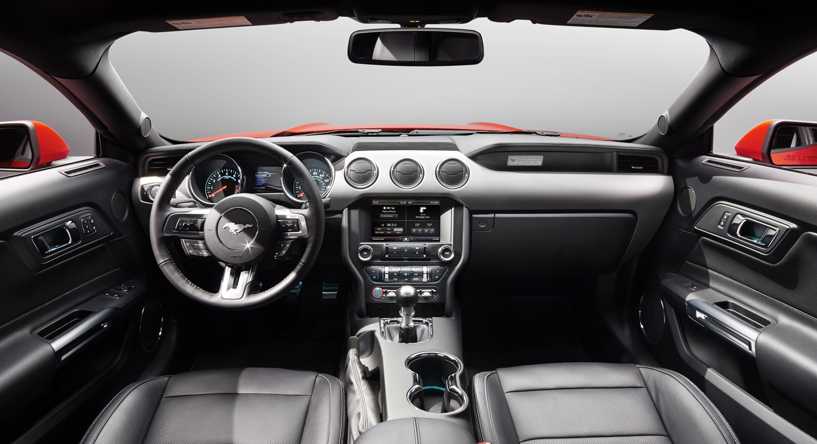 На Мустанге появились бесключевой доступ, запуск двигателя кнопкой, коммуникационная и мультимедийная система SYNC с голосовым управлением, программируемый «подростковый» ключ MyKey (он нужен, если родители передают машину детям, в этом случае можно произвольно программировать ряд функций, начиная от доступной максималки и заканчивая работой мультимедиа), мониторинг слепых зон, адаптивный «круиз», а ещё новая аудиосистема Shaker Pro. Кроме того, на передней панели поселилась кнопка Selectable Drive Modes, которая переключает режимы отклика мотора, работы «автомата», усилителя руля (теперь он электрический) и системы стабилизации.
