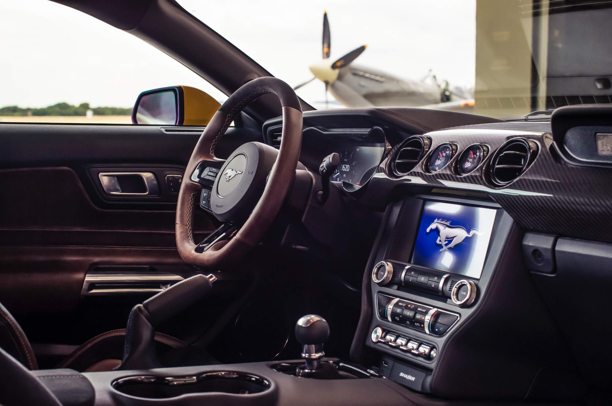 Составные кованые колёсные диски RTR Aero 7 дополнены шинами Nitto NT555 размерностью 285/30 R20 спереди и 305/30 R20 сзади. Внутри Мустанга установлены сиденья Recaro с вышитым логотипом Eagle Squadron, рукоятка переключения передач из металла, выплавленного от деталей истребителя F-35 Lightning и памятная табличка из алюминия, взятого от Спитфайера. Постройка этого Мустанга также была приурочена к столетию Королевских ВВС Великобритании, образованных в апреле 1918 года. И не случайно Eagle Squadron Mustang, помимо демонстрации в Ошкоше и на Woodward Dream Cruise в Детройте, успел побывать и на Фестивале скорости в Гудвуде.