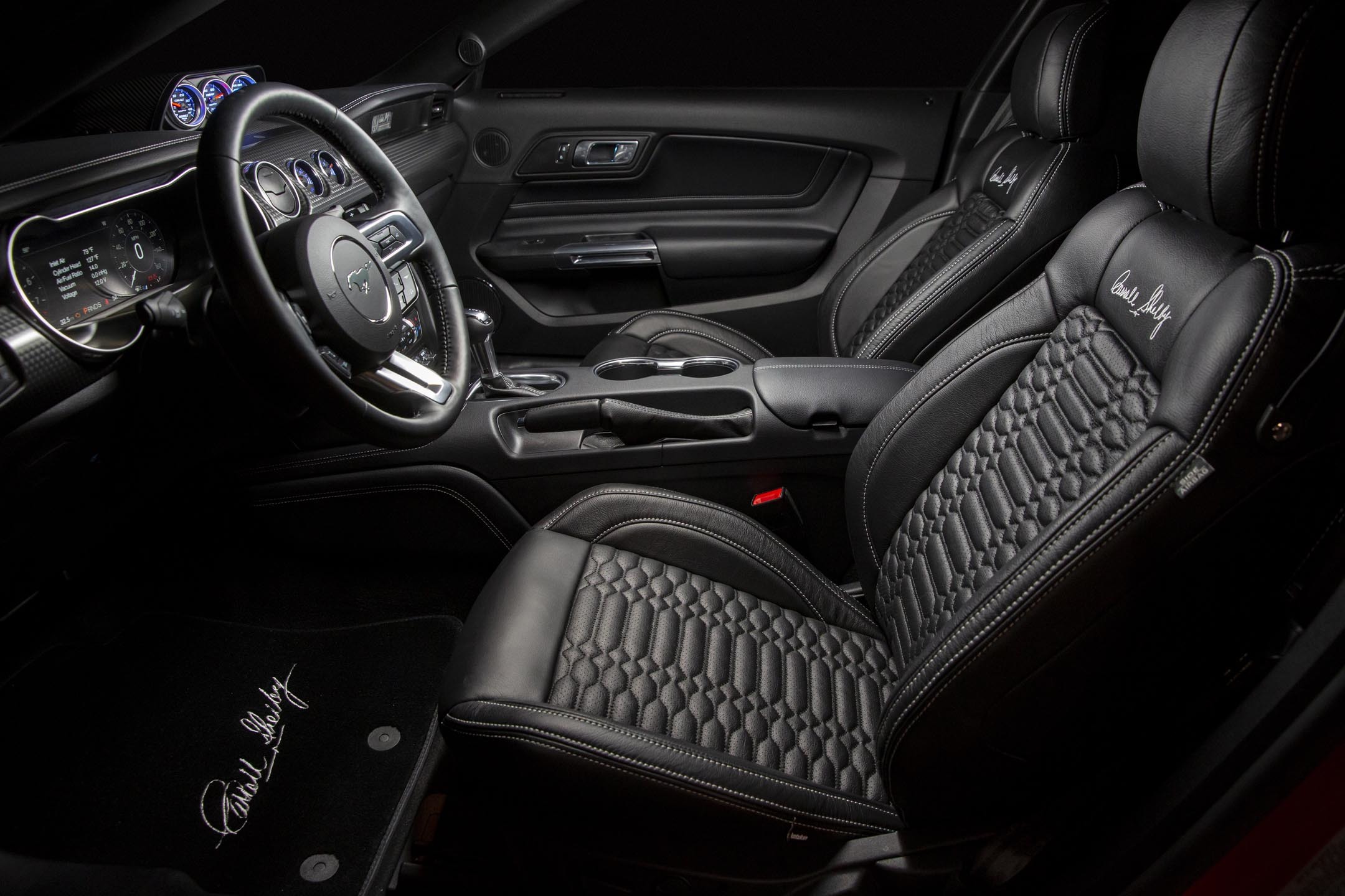 Двигатель V8 5.0 Coyote выдаёт 836 л.с. (против исходной 441 силы) за счёт нагнетателей Whipple, новых систем выпуска и охлаждения. Есть выбор между шестиступенчатой «механикой» и десятидиапазонным «автоматом». Тираж ограничен 50 экземплярами для Северной Америки. Цены начинаются со $127 795 (8,14 млн рублей). Вот что такое издание Carroll Shelby Signature Series, которое в соответствии с названием включает автографы Кэрролла Шелби на сиденьях и многочисленных памятных табличках.