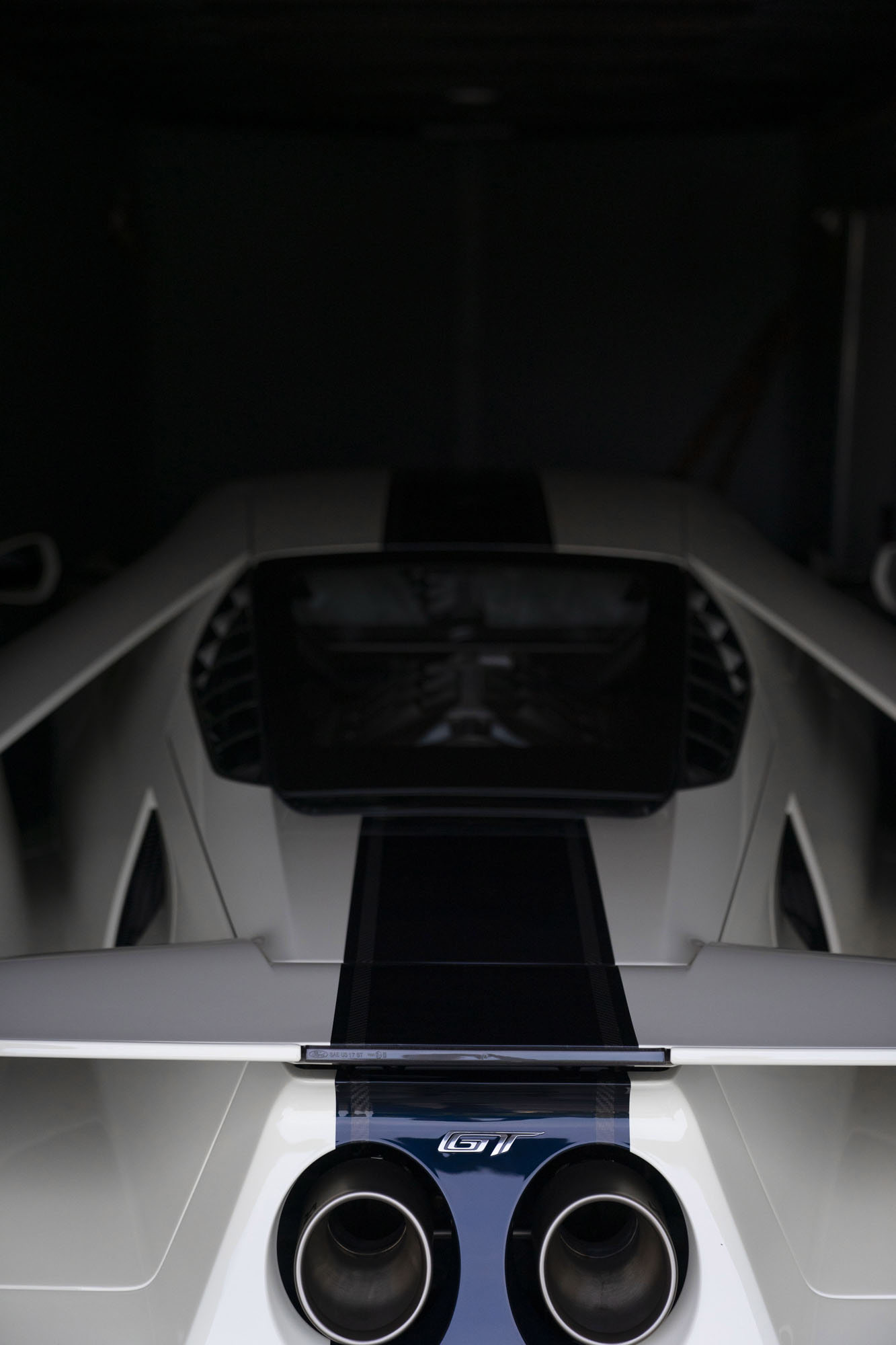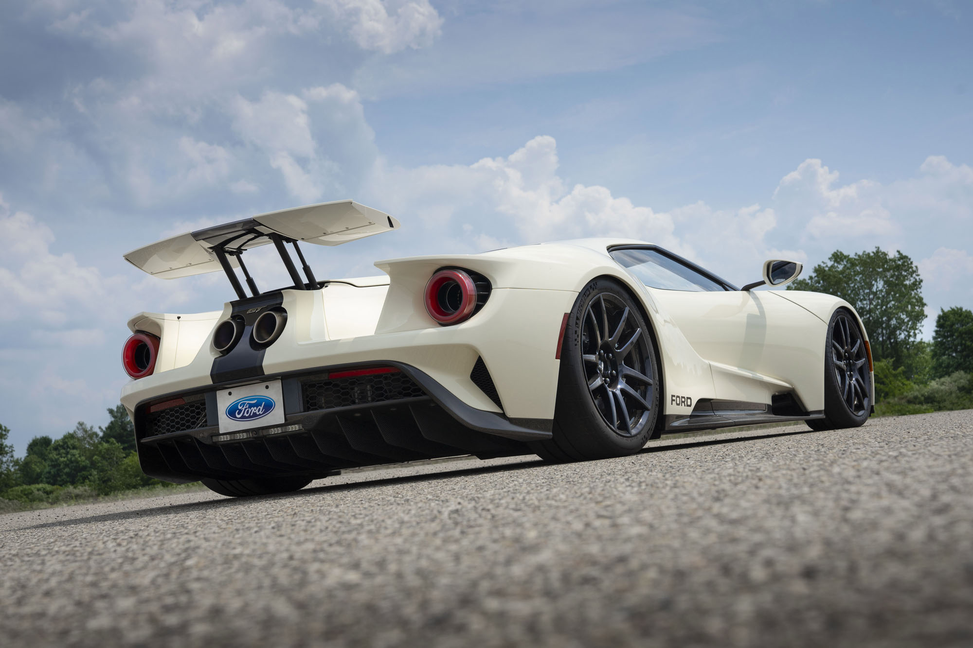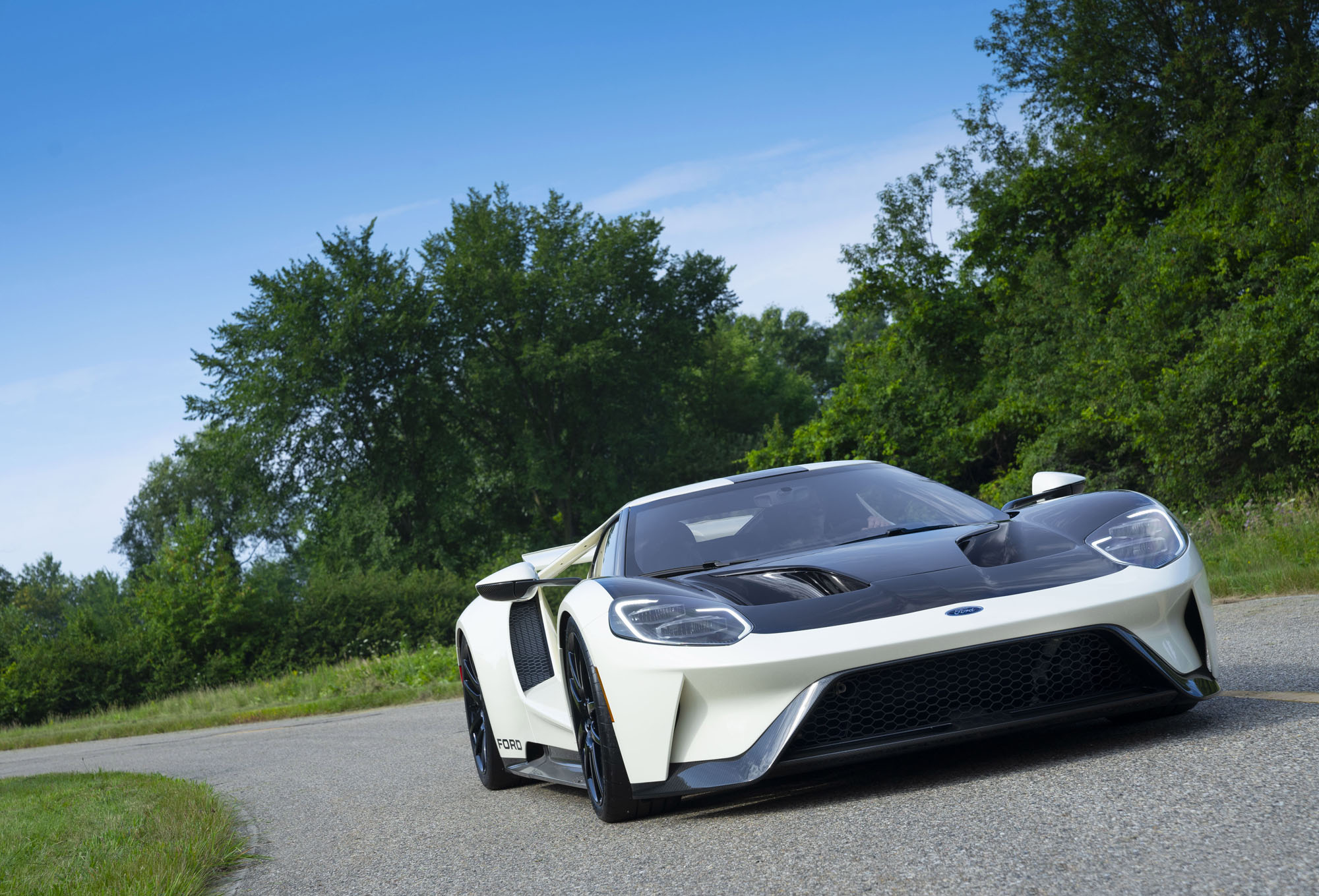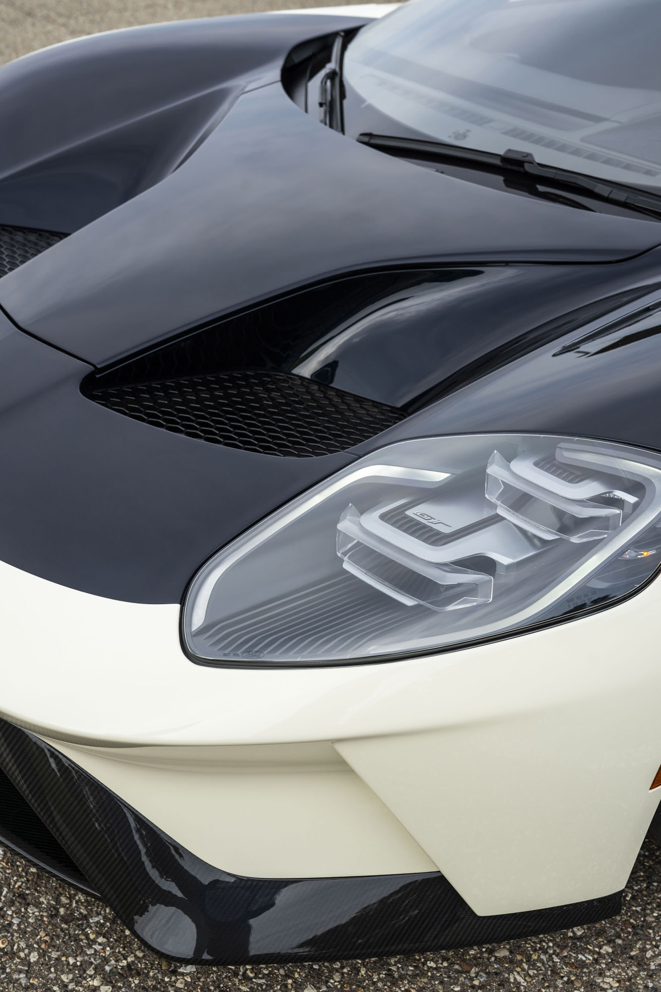 О силовой установке специальной серии компания ничего не сказала, значит, предполагаем обычный для GT набор: наддувный агрегат V6 3.5 EcoBoost (669 л.с., 746 Н•м), совмещённый с семиступенчатым «роботом» (привод задний). Зато над внешностью фордовцы поработали. Начинается всё с белой краски кузова Wimbledon White, а также тёмно-синей, почти чёрной графики Antimatter Blue. Они дополнены углепластиковыми колёсными дисками (20 дюймов) в таком же цвете и элементами в видимом углепластике под глянцевым лаком (крепления зеркал, сплиттер, пороги, жалюзи двигателя и диффузор). Тормозные суппорты Brembo окрашены серебристым лаком с чёрным рисунком.