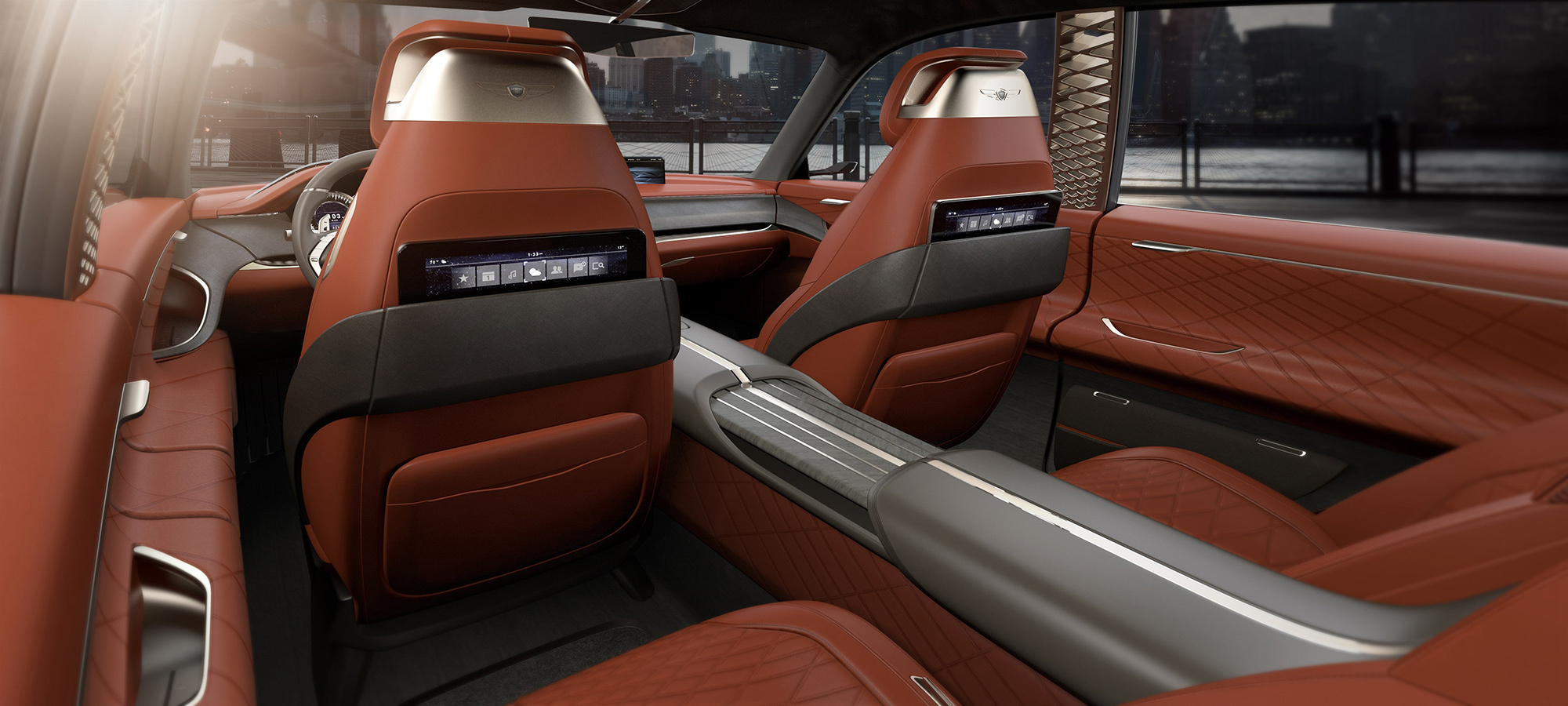 Интерьер приближен к реальности больше, чем экстерьер. Салон отделан привычными нам натуральной кожей, искусственной замшей, настоящим деревом и алюминием. Перед глазами водителя расположилась виртуальная панель приборов, а под правой ладонью ― сенсорная шайба-контроллер мультимедийной системы с тремя отдельными клавишами. Самый необычный элемент ― широкоформатный дисплей диагональю 22 дюйма. А что касается техники, то Genesis GV80 ― концепт на водородных топливных элементах, чьи аккумуляторы можно заряжать от розетки. Но в серию пойдут версии с бензиновым наддувным V6 и с четырёхцилиндровым турбодизелем, разработка которого уже ведётся.