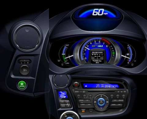 Каждый раз, когда, садясь за руль Инсайта, вы нажимаете зелёную кнопку ECON, система Ecological Drive Assist берёт под контроль силовую установку и вспомогательное оборудование. Она увеличивает интервалы между включениями ДВС при остановках, дольше подзаряжает батареи при рекуперативном торможении и не позволяет кондиционеру тратить лишнего. Кроме того, электроника ещё и следит за вашими действиями.