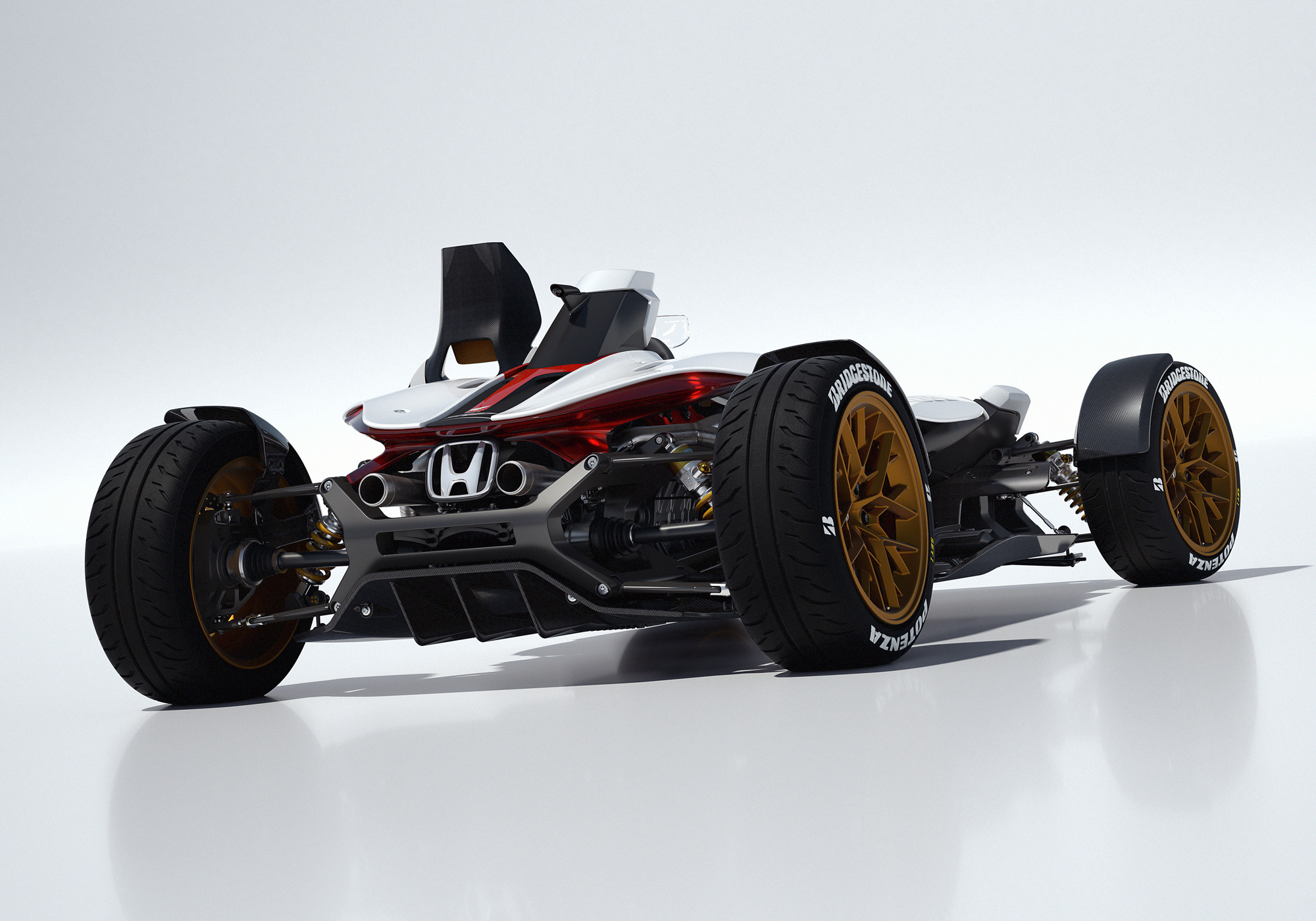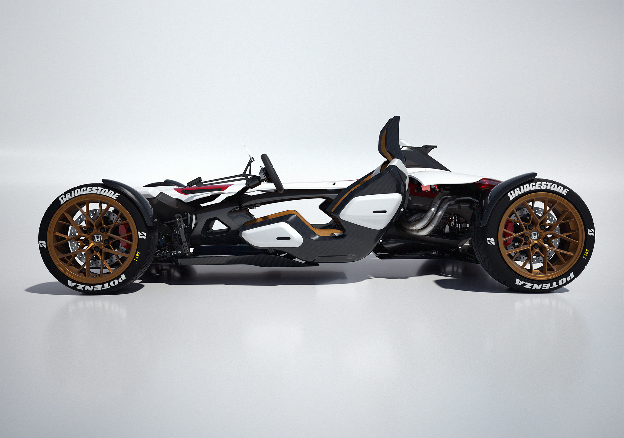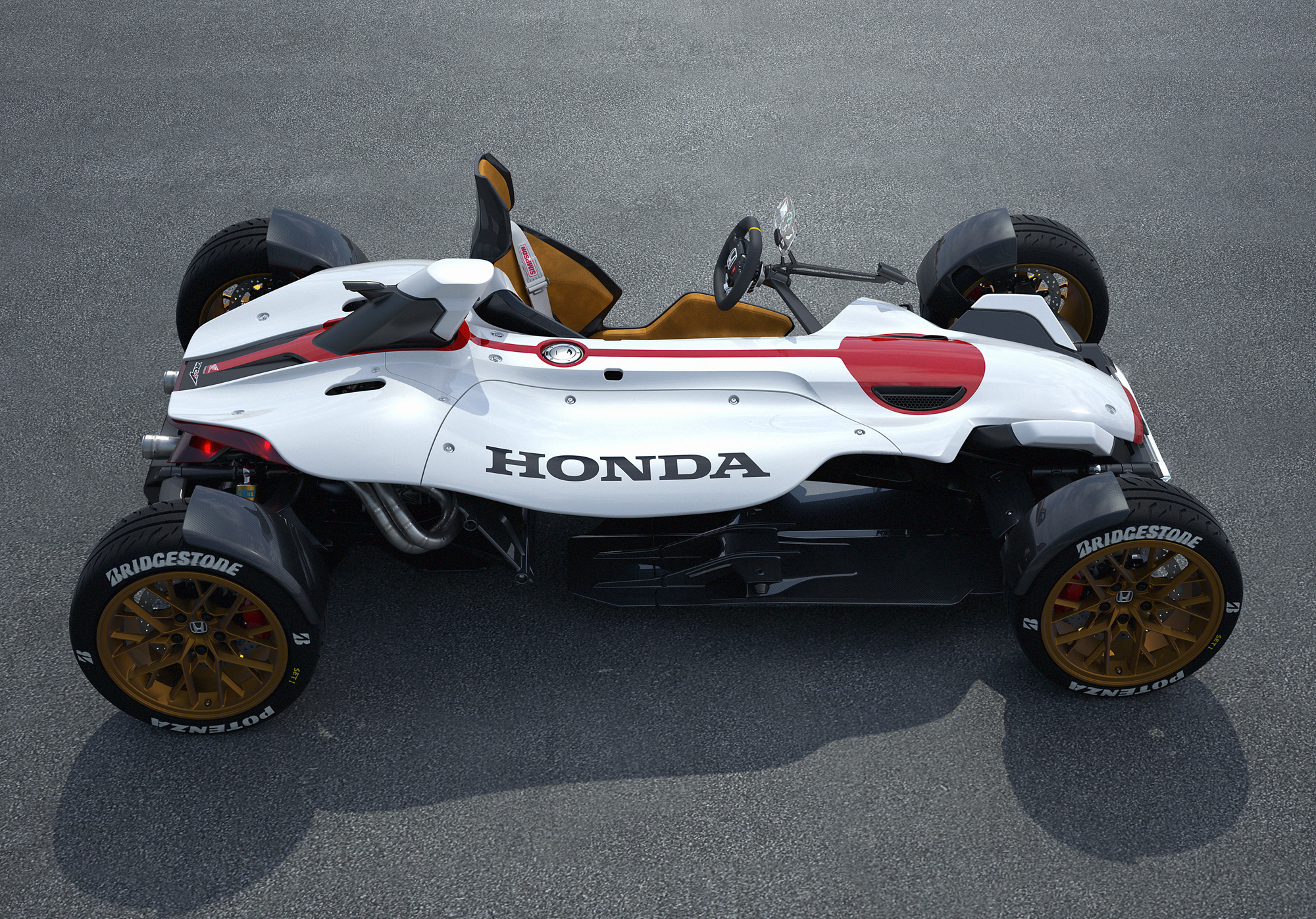 Обещанный несколько дней назад гибрид автомобиля и мотоцикла Honda Project 2&4 оказался трек-каром без кабины с «плавающим» в считанных сантиметрах над асфальтом (для полноты ощущений) креслом пилота. Мотор V4 1.0 от гоночного мотоцикла RC213V на концепте развивает более 215 л.с. при 13 000 об/мин и 118 Н•м при 10 500 об/мин. По сравнению с версией для чемпионата MotoGP он дефорсирован на 15 «лошадей», зато больше приспособлен для обычных дорог. На колёса тяга передаётся через шестиступенчатый «робот» DCT.