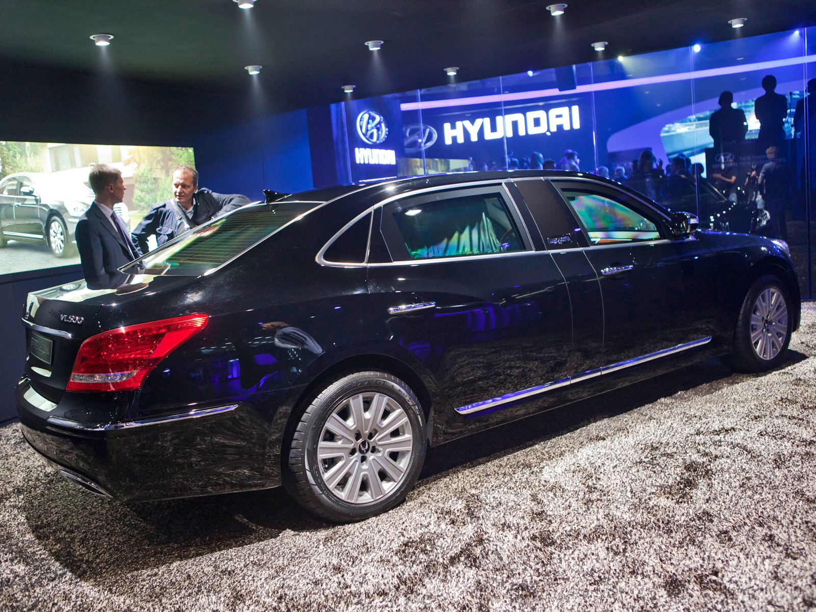 Роскошный автомобиль Hyundai Equus Limousine Security прибыл на Московский международный автосалон. Защищённая от пуль и взрывных устройств четырёхдверка внешне практически не отличается от обычной удлинённой версии Экуса. От «носа» до «хвоста» тут насчитываются всё те же 5460 мм. А вот снаряжённая масса заметно подросла: с 2125 до 3840 килограммов. Таскает потяжелевший седан V-образная «восьмёрка» серии Tau объёмом пять литров. Здесь она развивает 430 л.с., в то время как на небронированном аналоге — только 400 «лошадок».