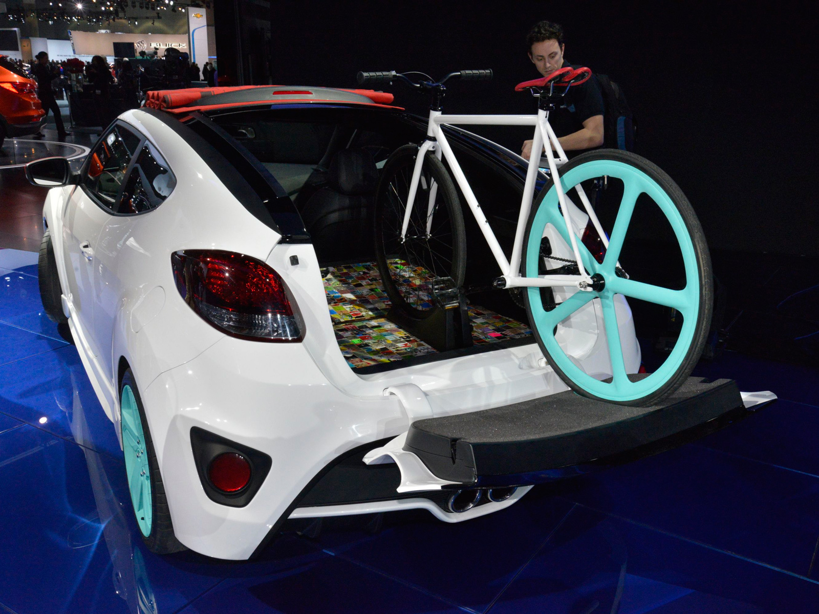 Ещё одним любопытным элементом шоу-кара является оформление багажного отсека. Его пол, а также задняя часть спинок задних сидений, покрыты плиткой из нескольких сотен небольших кусочков старых скейтов. Таков конёк фирмы Art of Board, которая из старых роликовых досок выкраивает пёстрые, прочные и долговечные покрытия для мебели и декоративных элементов интерьера.