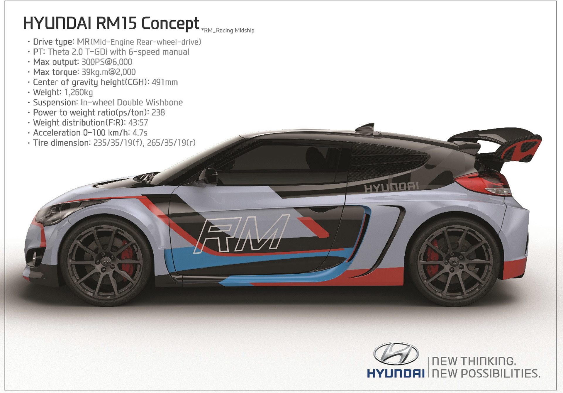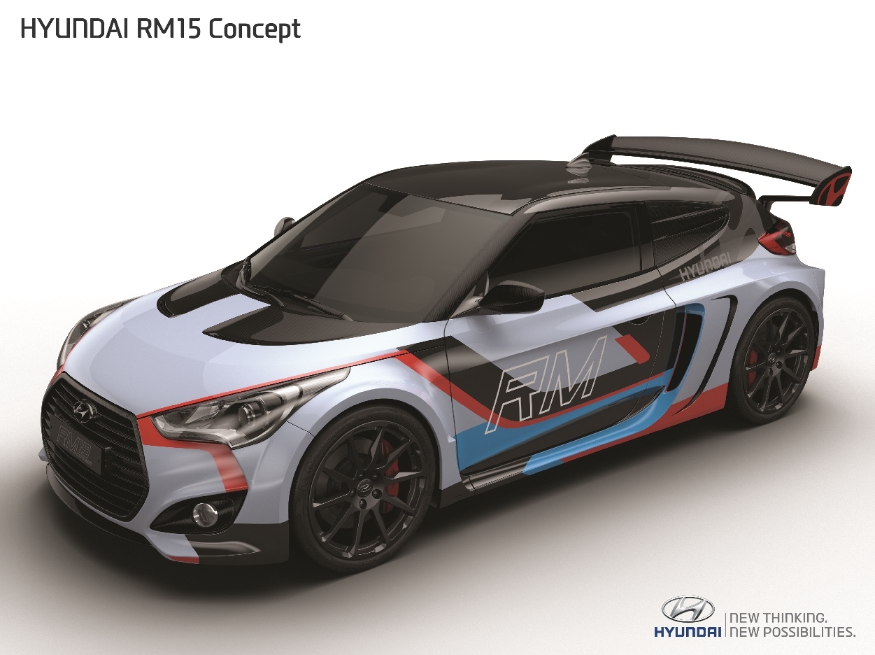 Заменив стальные элементы на облегчённые материалы, инженеры из подразделения Hyundai High Performance Vehicle Development Centre сбросили монструозному Велостеру 195 кило (теперь он весит 1260 кг — 238 л.с. на тонну). Жёсткость кузова на кручение — 38 700 Н•м/град. Развесовка нынче 43:57 (перед/зад), центр тяжести находится в 491 мм от земли. До 100 км/ч Hyundai RM15 разгоняется за 4,7 с!
