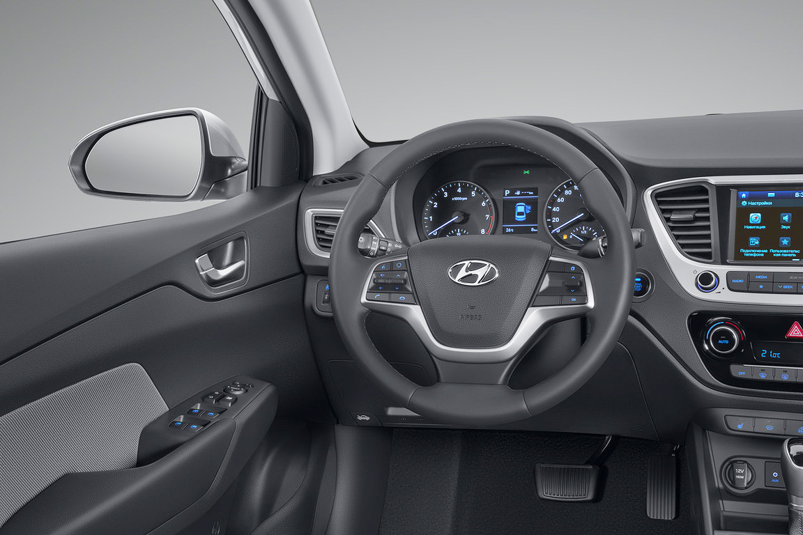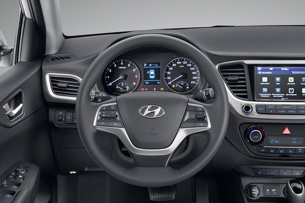 В варианте Comfort — задние электростеклоподъёмники с подсветкой кнопок, регулировка рулевой колонки по вылету, возможность подключения смартфона по протоколу Bluetooth, панель приборов Supervision и кожаная отделка руля. С двигателем 1.4 такой Solaris стоит 744 900 рублей с «механикой» и 784 900 с «автоматом». С мотором 1.6 соответственно — 769 900 и 809 900 рублей. Топ-комплектация Solaris 1.6 Elegance дополнена датчиками парковки и света, навигационной системой с информацией о пробках, климат-контролем, регулируемым по длине центральным подлокотником спереди — 859 900 рублей с «механикой» и 899 900 с «автоматом».