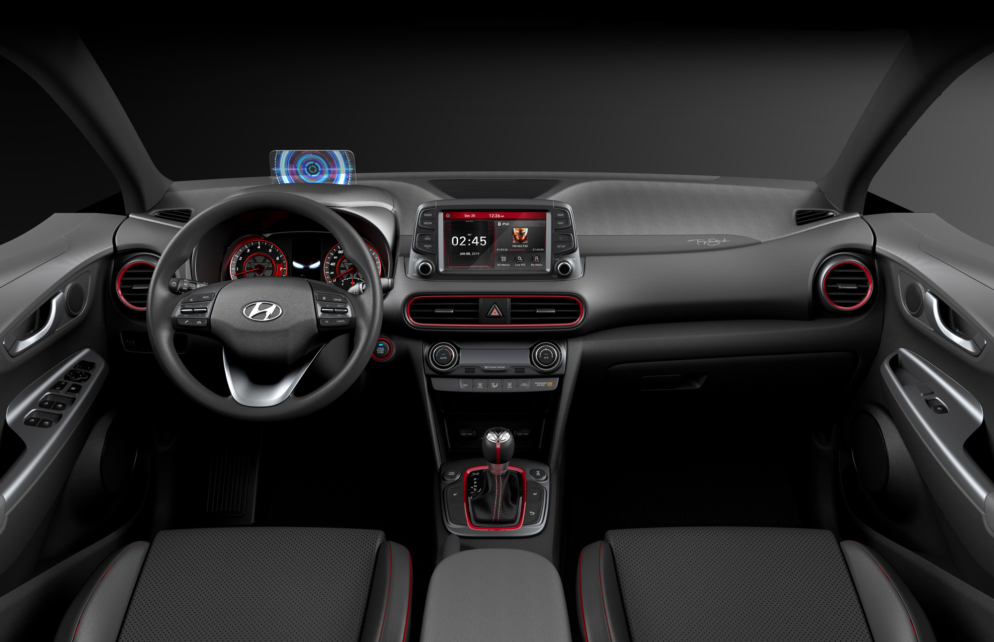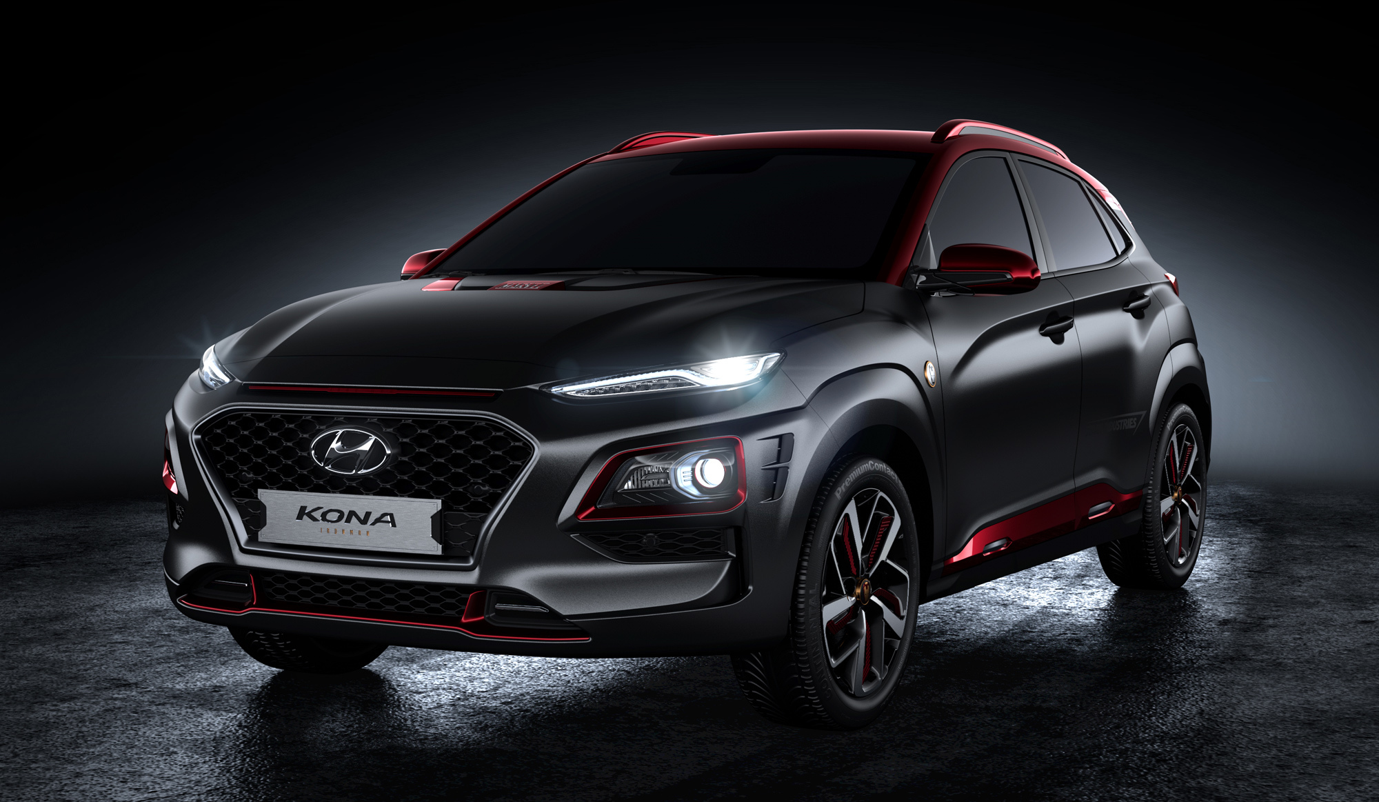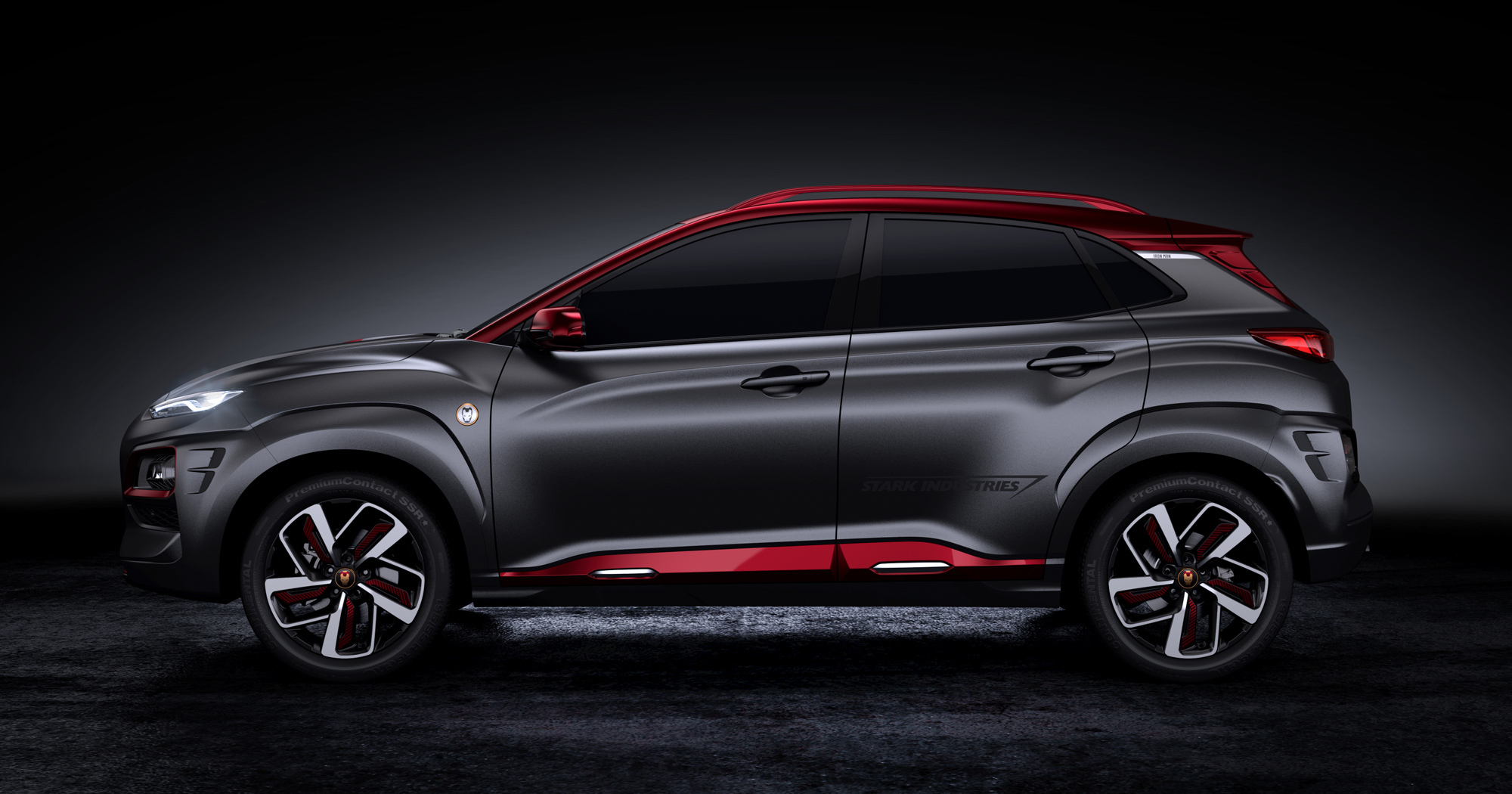 Узкая передняя оптика Коны в сочетании с шестиугольной решёткой, у которой слегка изогнуты боковые грани, даже в стандартном виде вызывает ассоциации со шлемом Железного человека и его «глазами». А в специальном издании разработчики постарались усилить этот эффект за счёт уникальных ходовых огней, а также красных акцентов и чуть перекроенного бампера. Решётка же окрашена в тёмный хром.