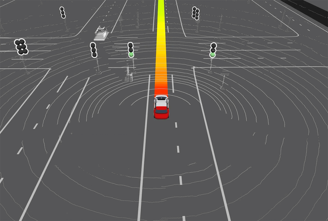В решётку радиатора интегрированы камера и лидар, сканирующий пространство непосредственно перед машиной. Он установлен под небольшим наклоном и способен в том числе оценивать качество поверхности, а крепление разработано с учётом требований пешеходной безопасности. Таким образом, препятствия по ходу движения попадают под четыре лазерных луча разом, что значительно повышает точность распознавания вплоть до мельчайших объектов.