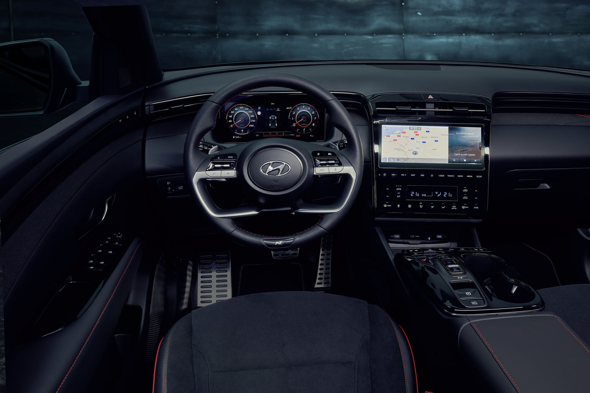 Адаптивная подвеска ECS специально для «эн-лайнов» с 48-вольтовой надбавкой получила изменённую программу управления. В нормальном режиме подвеска остаётся комфортной, но в спортивном значительно интенсивнее обычной гасит колебания, быстрее реагирует на движения кузова и рулевого колеса. Перенастроенное шасси лучше подавляет крены и обеспечивает иной уровень связи с водителем, чем в штатном исполнении. Руль здесь тоже немного тяжелее, чем на обычных Тусанах, и отчётливее возвращается в ноль.