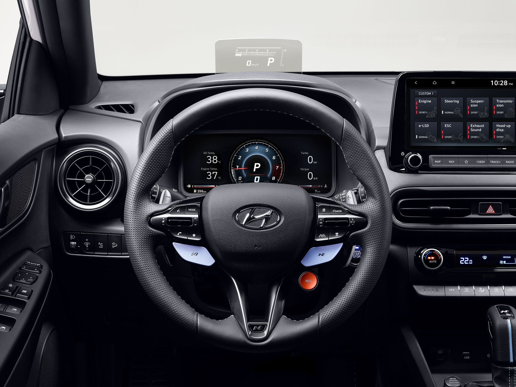 Kona N бывает только переднеприводной, но ведущая ось дополнена электронноуправляемой блокировкой дифференциала. От стандартной Коны «заряженная» отличается также усиленным дополнительными точками сварки кузовом, заниженной подвеской, перенастроенными адаптивными амортизаторами, электроусилителем и системой стабилизации. Кроме того, будут доступны пять ездовых сетапов (Eco, Normal, Sport, N и настраиваемый Custom) и лонч-контроль. А ведь ещё отдельно для преселективного «робота» есть свои режимы работы — базовый N Power Shift, трековый N Track Sense Shift и неистовый N Grin Shift, в котором на 20 с силовой агрегат выдаёт максимум своих возможностей.