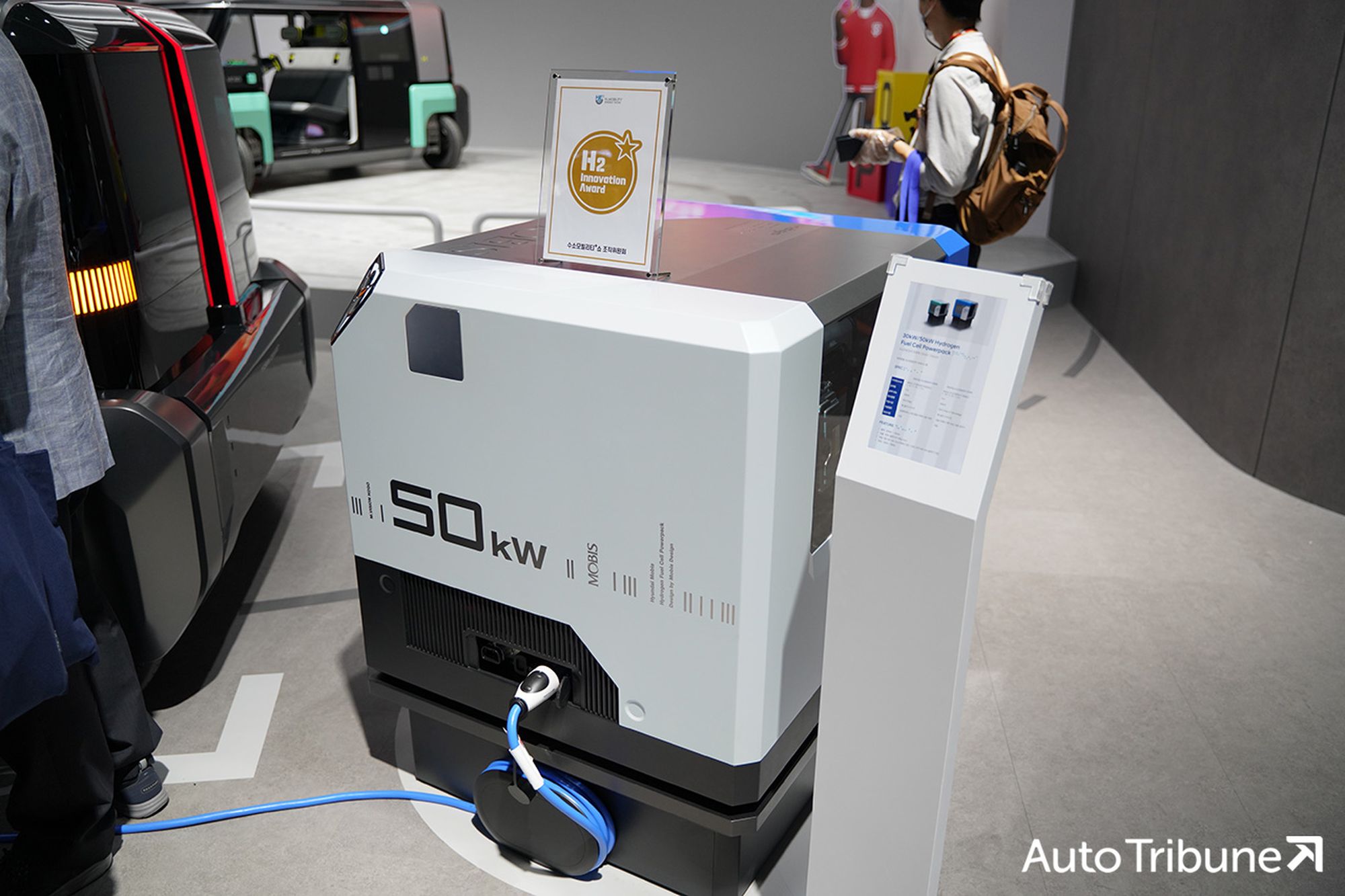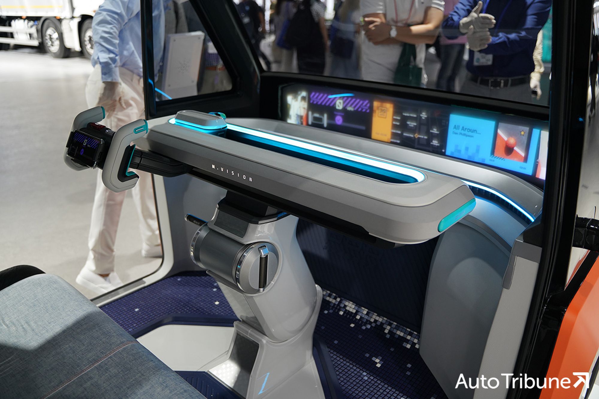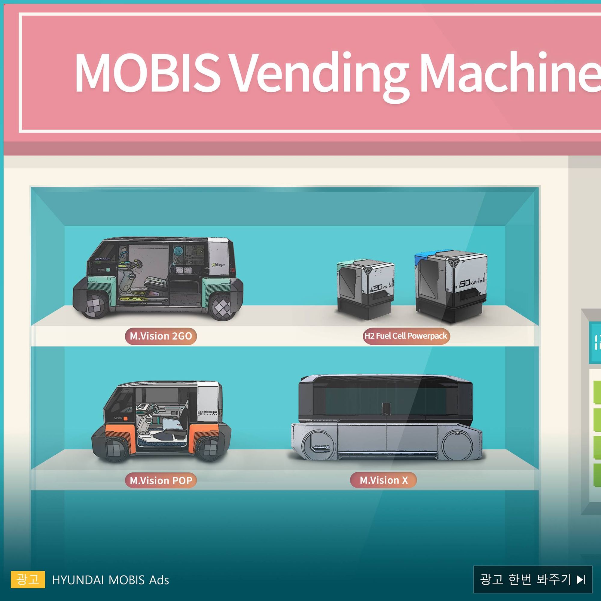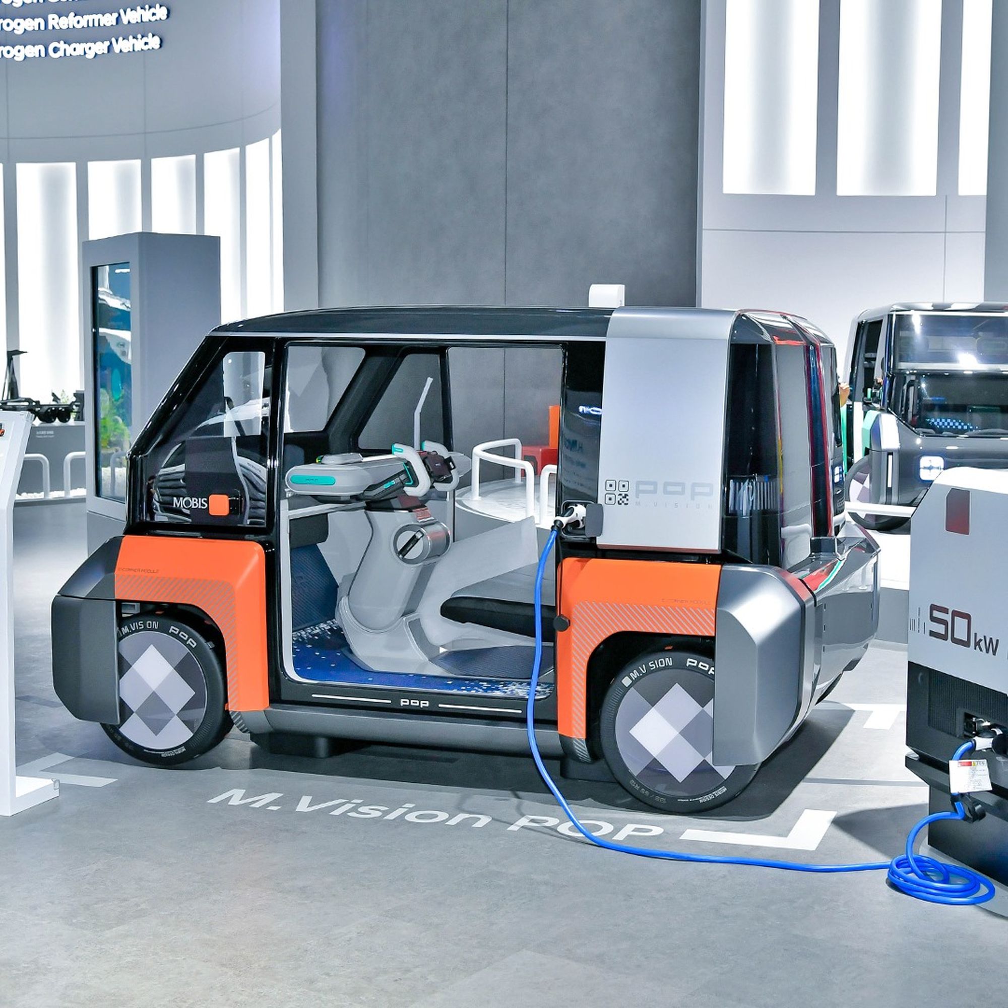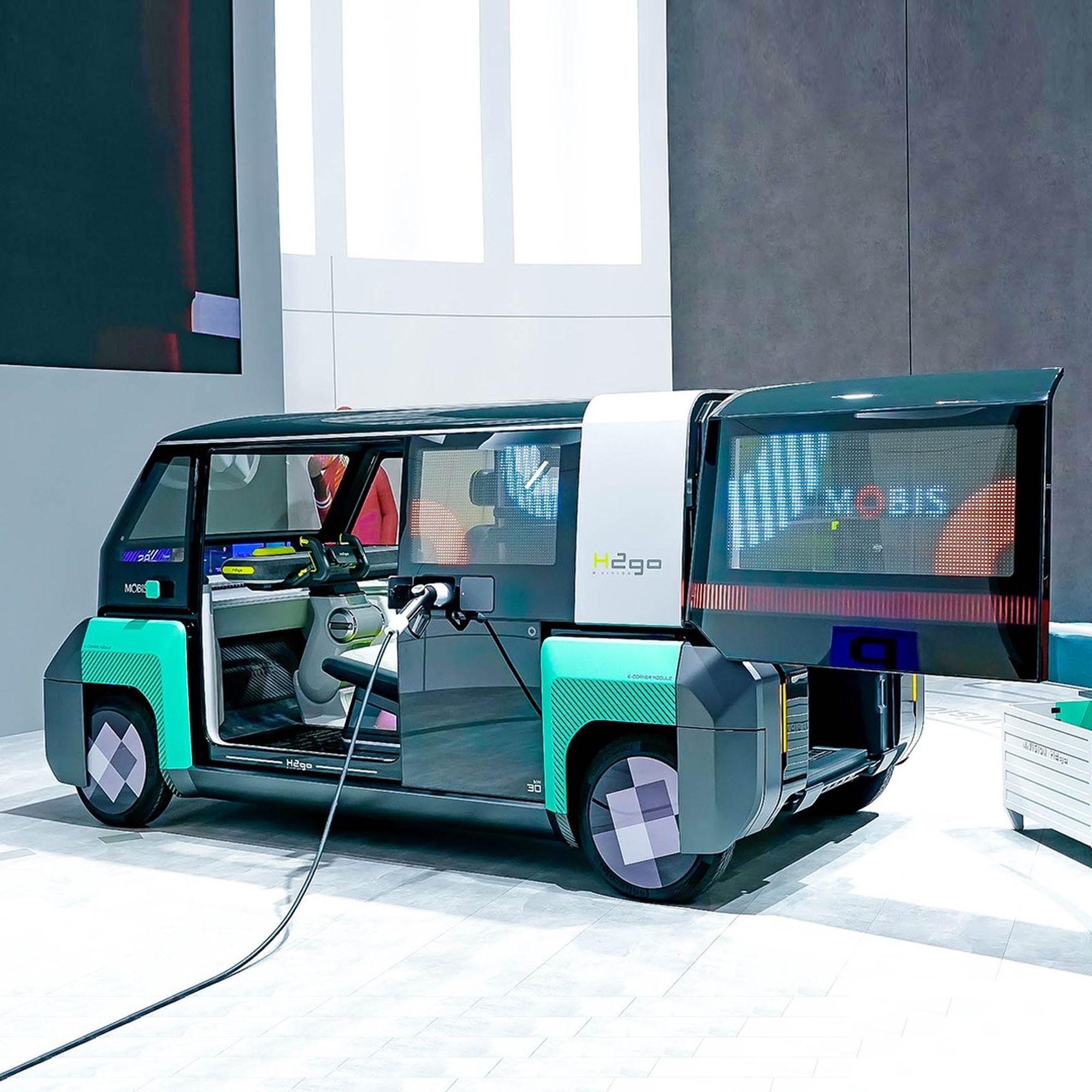 Серия концептов M.Vision («видение мобильности»), вобравшая в себя блоки топливных элементов на 30 и 50 кВт, пока адресована только южнокорейской публике и даже не упоминается в англоязычном пресс-релизе, то есть глобальная премьера ещё впереди. Среди интересных особенностей следует отметить внешние экраны, передающие сообщения другим участникам движения, скользящий влево-вправо штурвал, через который смартфон подключается к крупным дисплеям в основании лобового стекла, и автоматически распахивающуюся заднюю дверь.