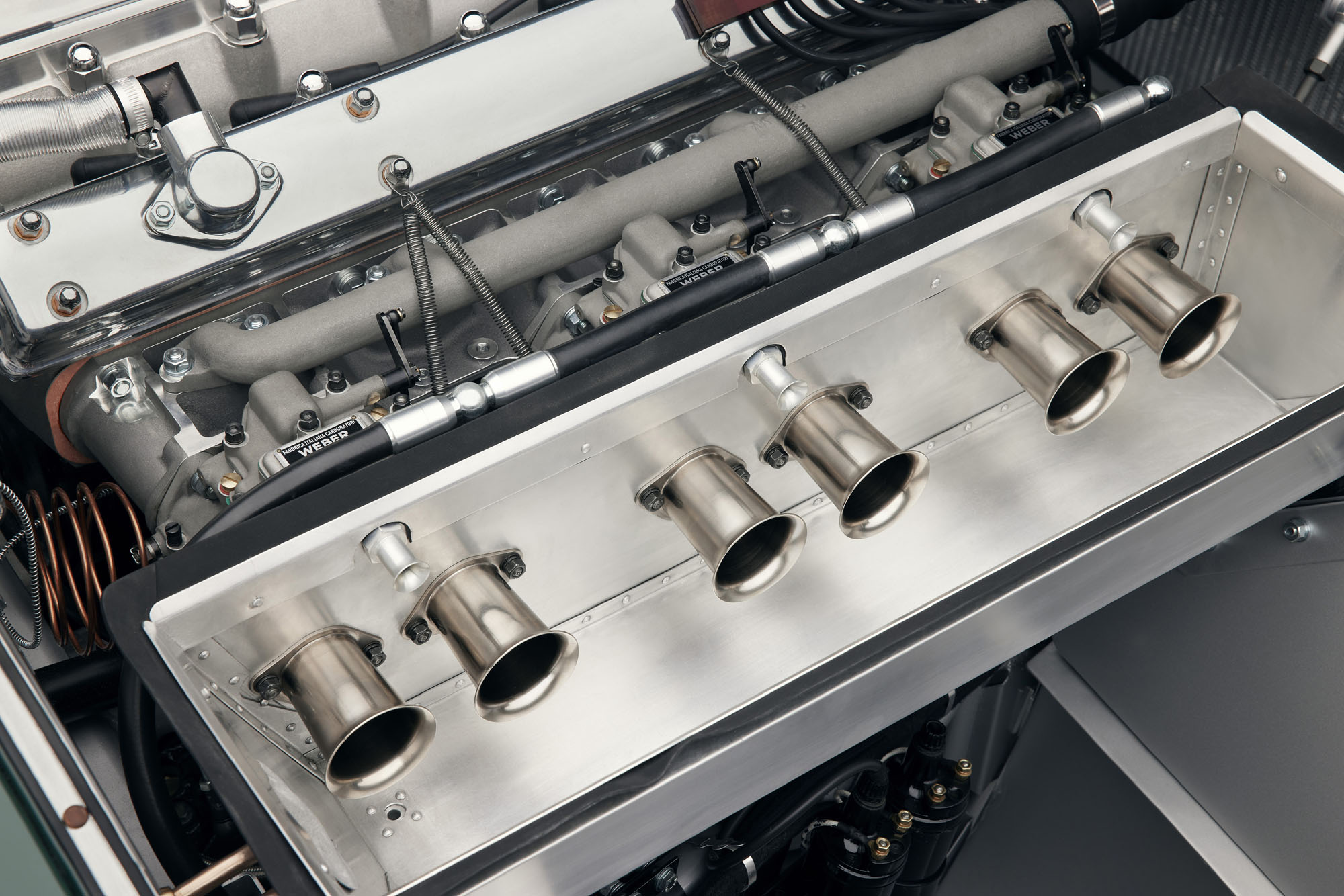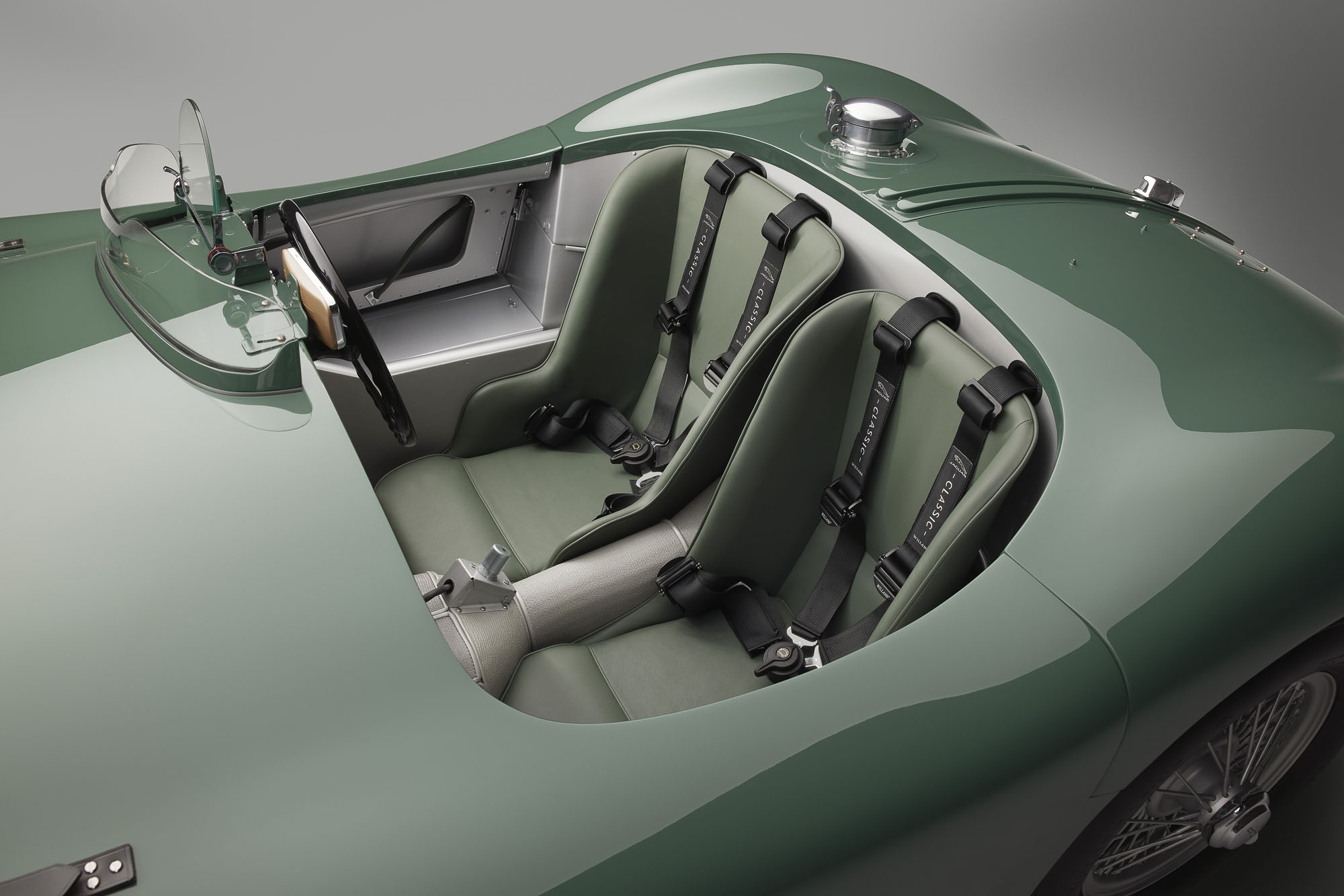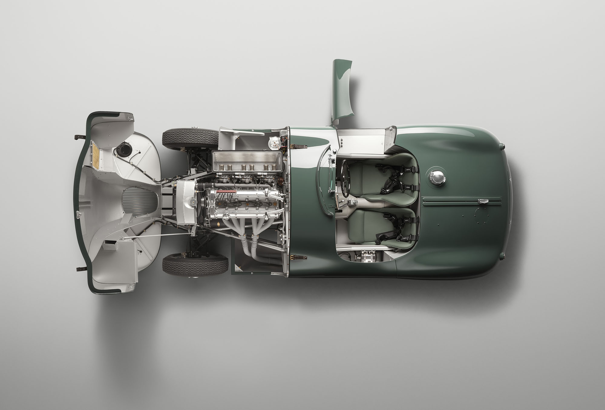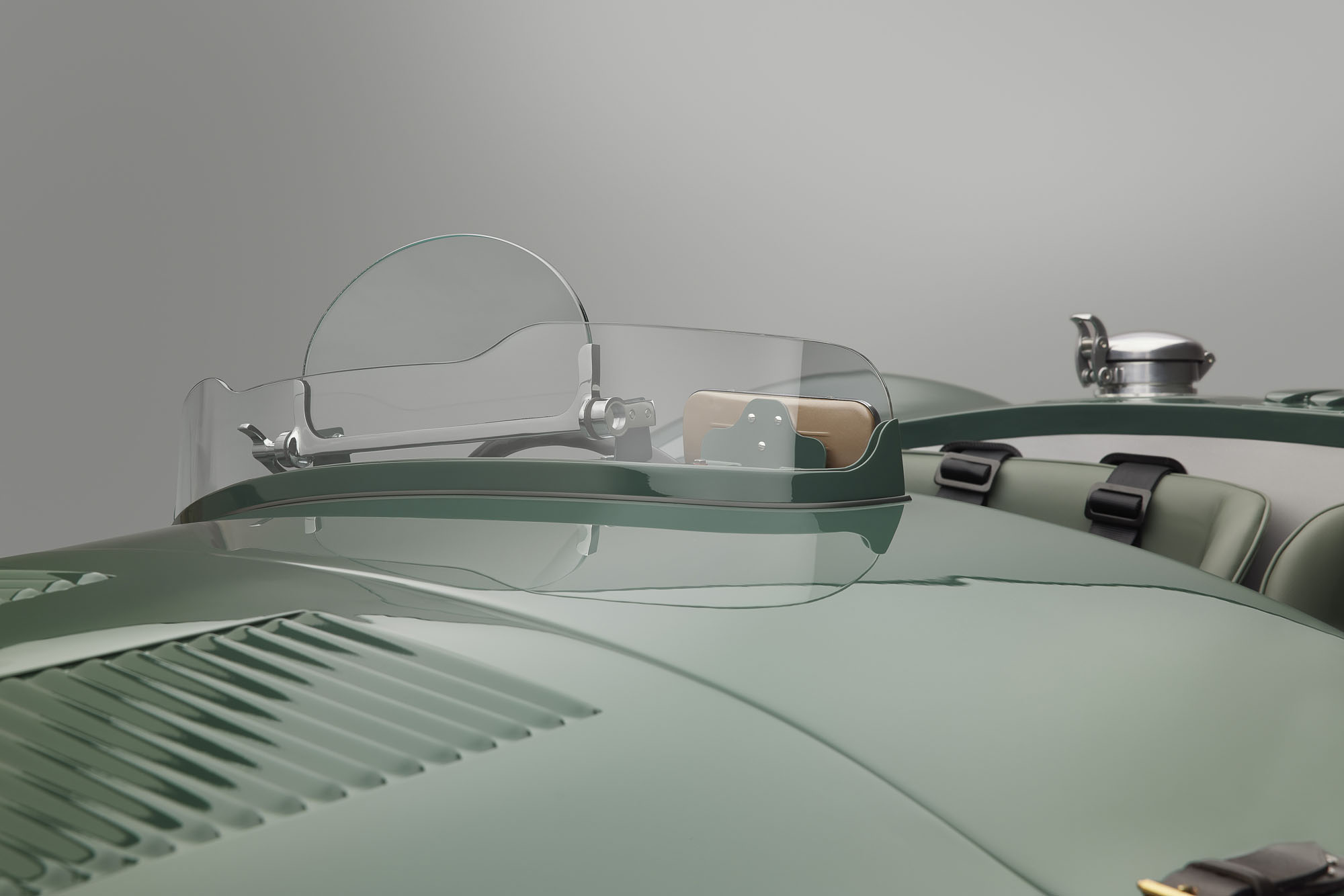 Специалисты собрали достаточно оригинальных компонентов, чтобы воспроизвести все детали машины без потерь. Тут и гидравлический насос Plessey тормозной системы, установленный на коробке передач, и миниатюрное лобовое стекло Brooklands с зеркалом заднего вида Lucas, часы Smiths и оригинальный тахометр, чья шкала идёт по нарастающей против часовой стрелки. В отделке передней и боковых панелей салона использованы последние сохранившиеся с пятидесятых годов образцы искусственной кожи Rexine.