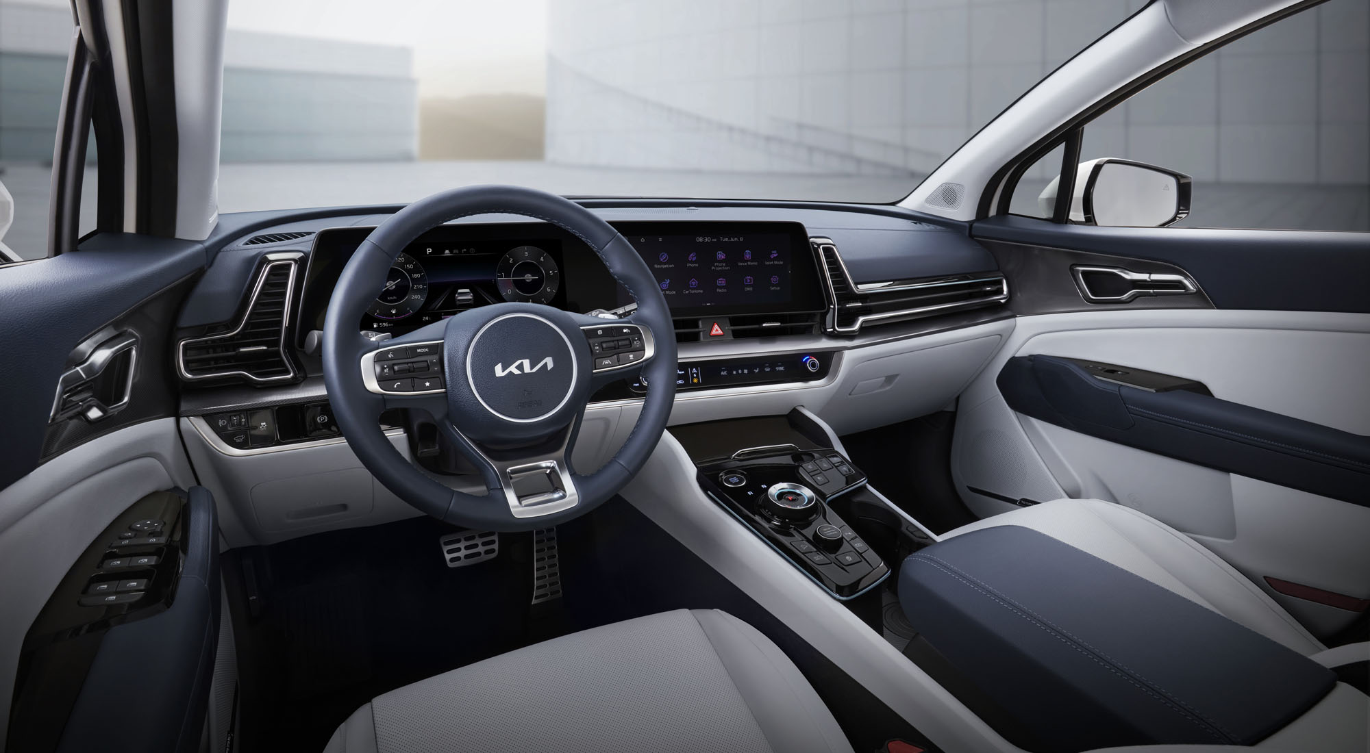 Над дизайном Спортейджа работала объединённая команда из Южной Кореи, Германии, США и Китая. Ей удалось не только кардинально переосмыслить внешность компактного паркетника, но и полностью поменять интерьер. Лаконичный и современный салон в первую очередь интересен изогнутым кластером из пары соединённых экранов, обрамлённых трёхмерными дефлекторами вентиляции. Второй визуально выделяющийся элемент убранства — приподнятая сенсорная панель управления на тоннеле с вращающимся контроллером трансмиссии и кнопками soft-touch.