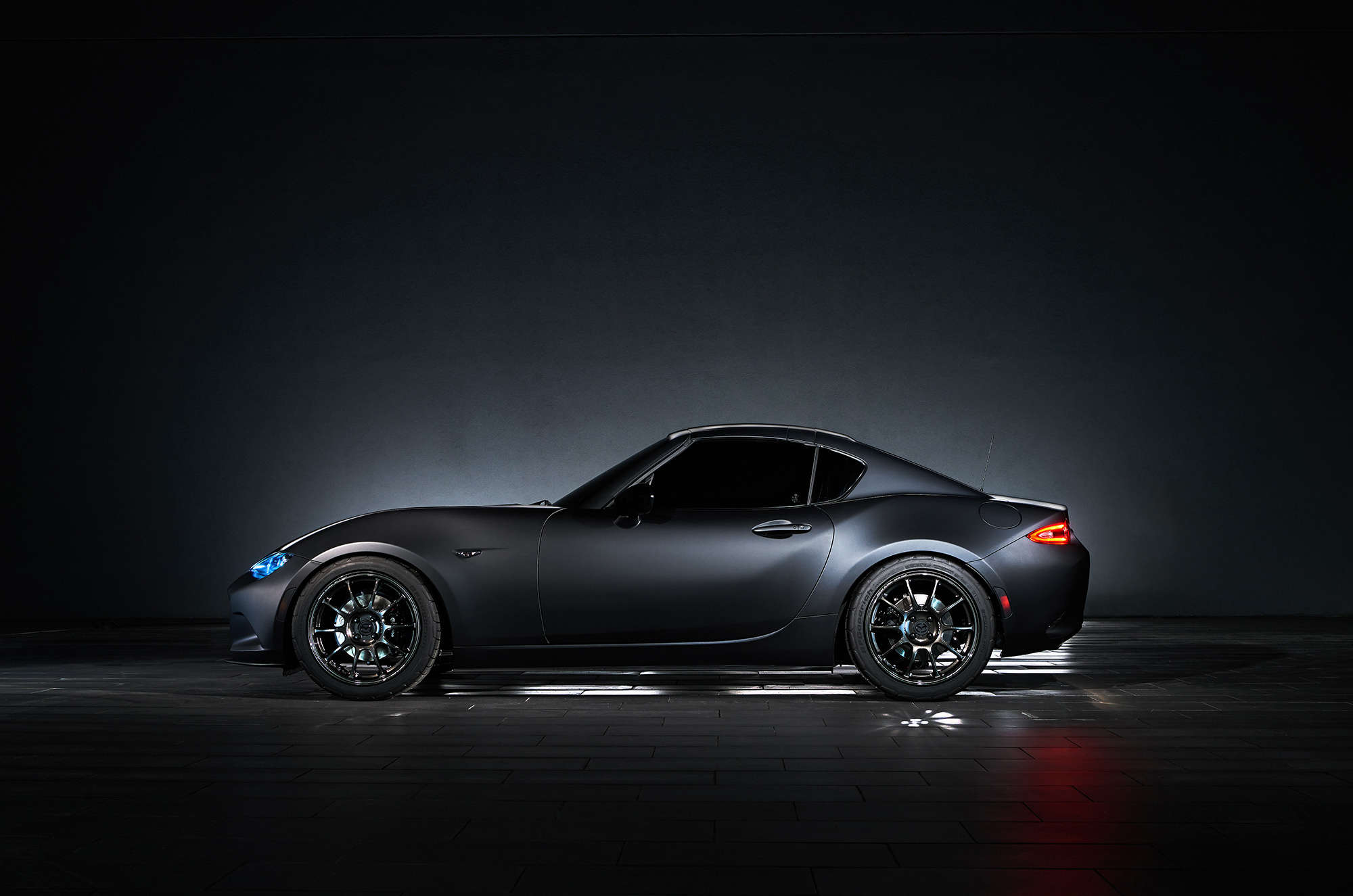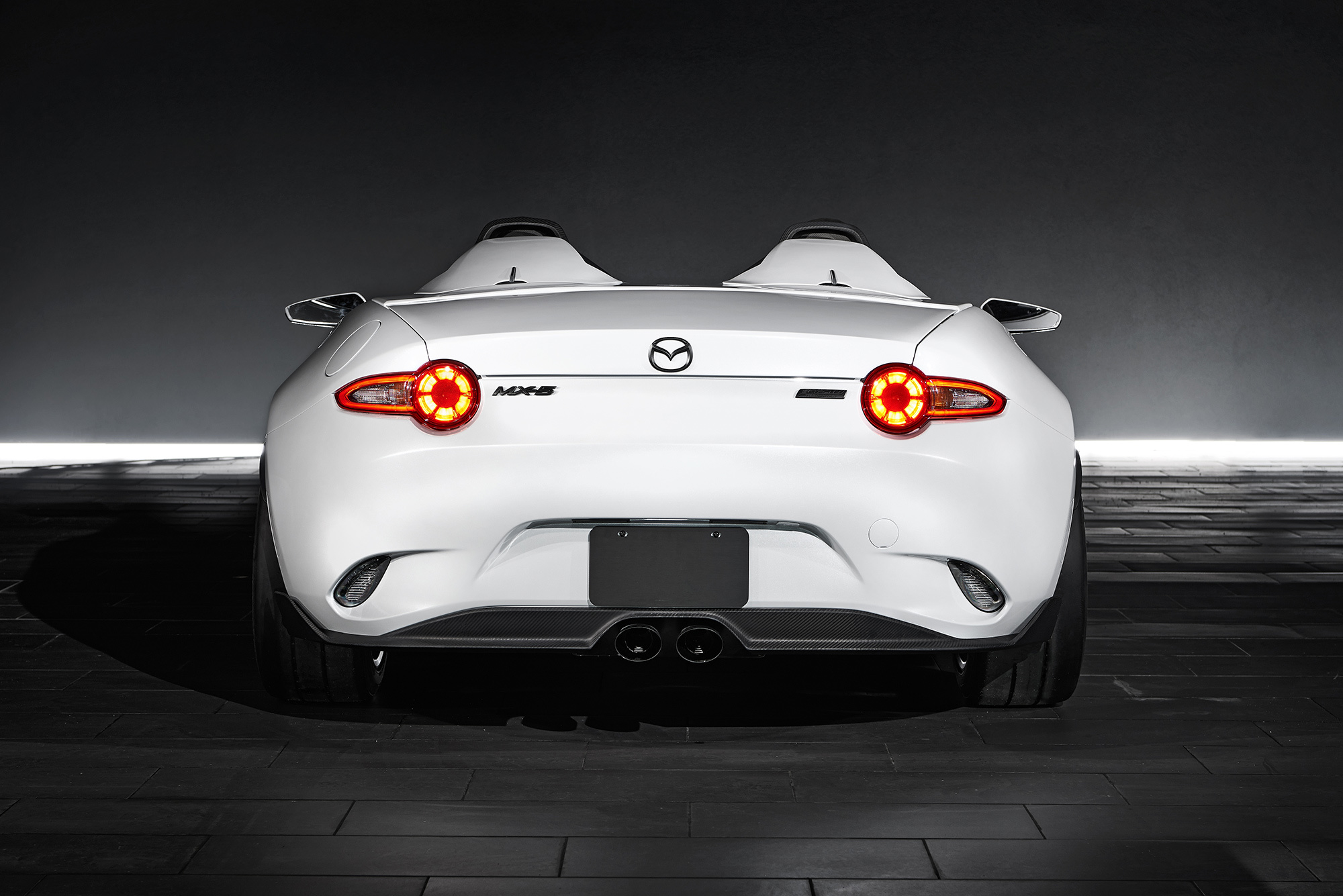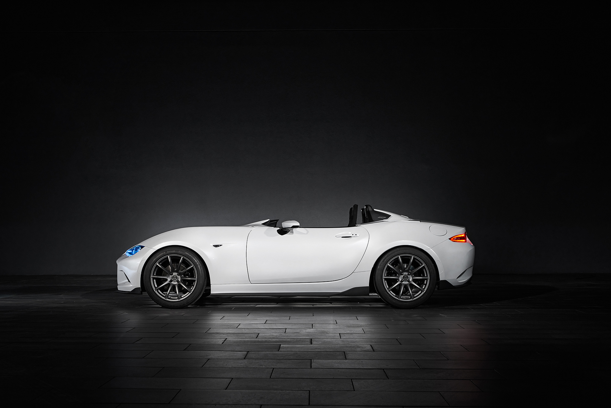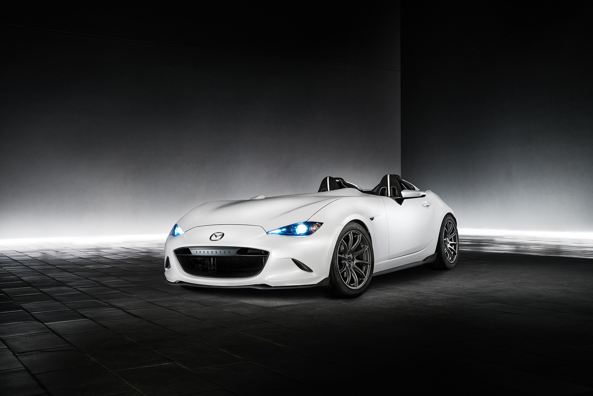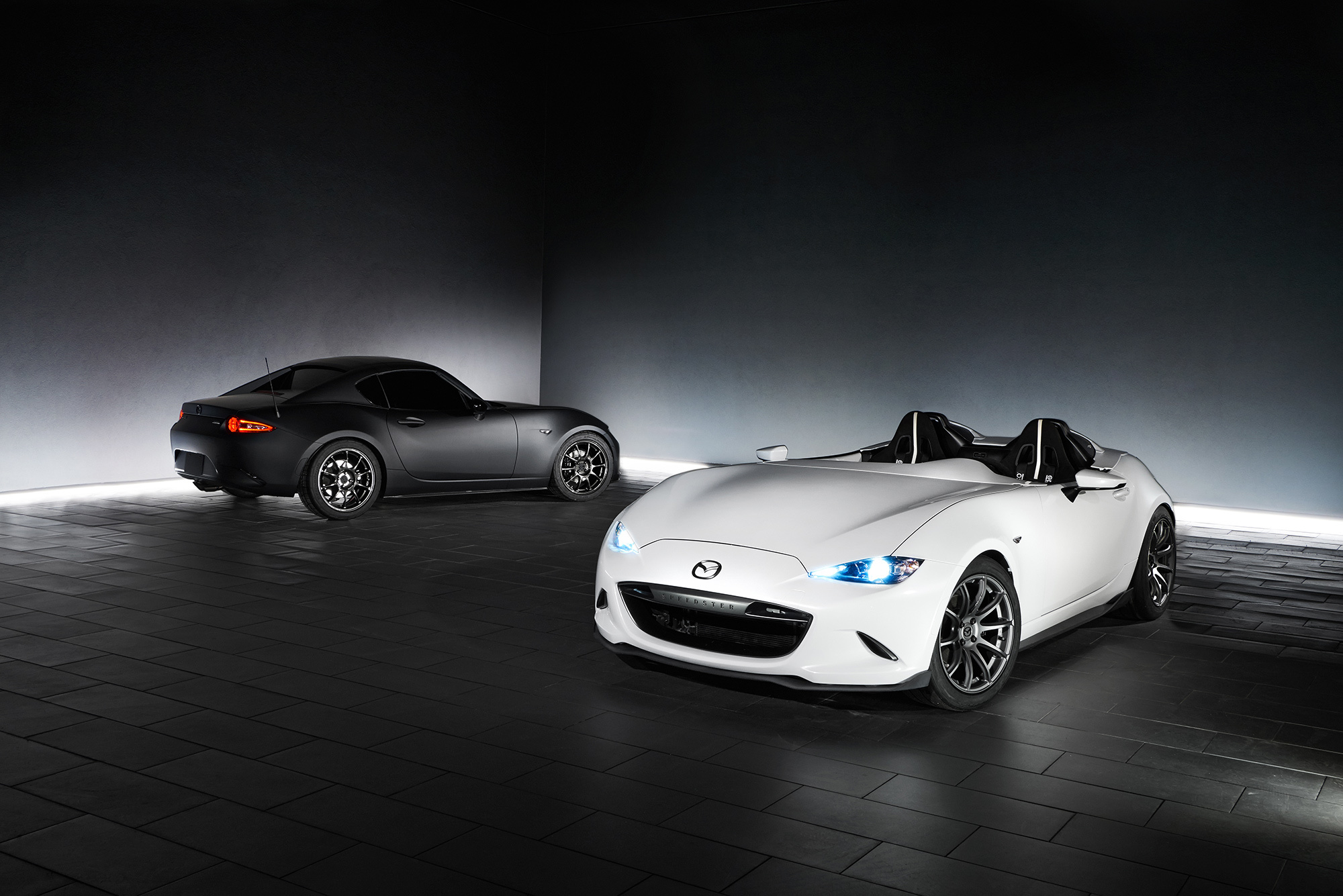 О новых концептуальных Маздах MX-5, подготовленных для шоу SEMA в Вегасе, мы уже вкратце рассказывали. Теперь появились подробности и дополнительные фото. Перед командой Кена Саварда стояли две разные задачи, поэтому тёмный шоу-кар MX-5 RF Kuro («уголь») анонсирует серийную машину со складным жёстким верхом, а белоснежный Speedster Evolution продолжает исследование на тему снижения веса. Снаряжённая масса Спидстера — 898 кг (против 975 кило у обычной машины), и Савард уверен, что это не предел.