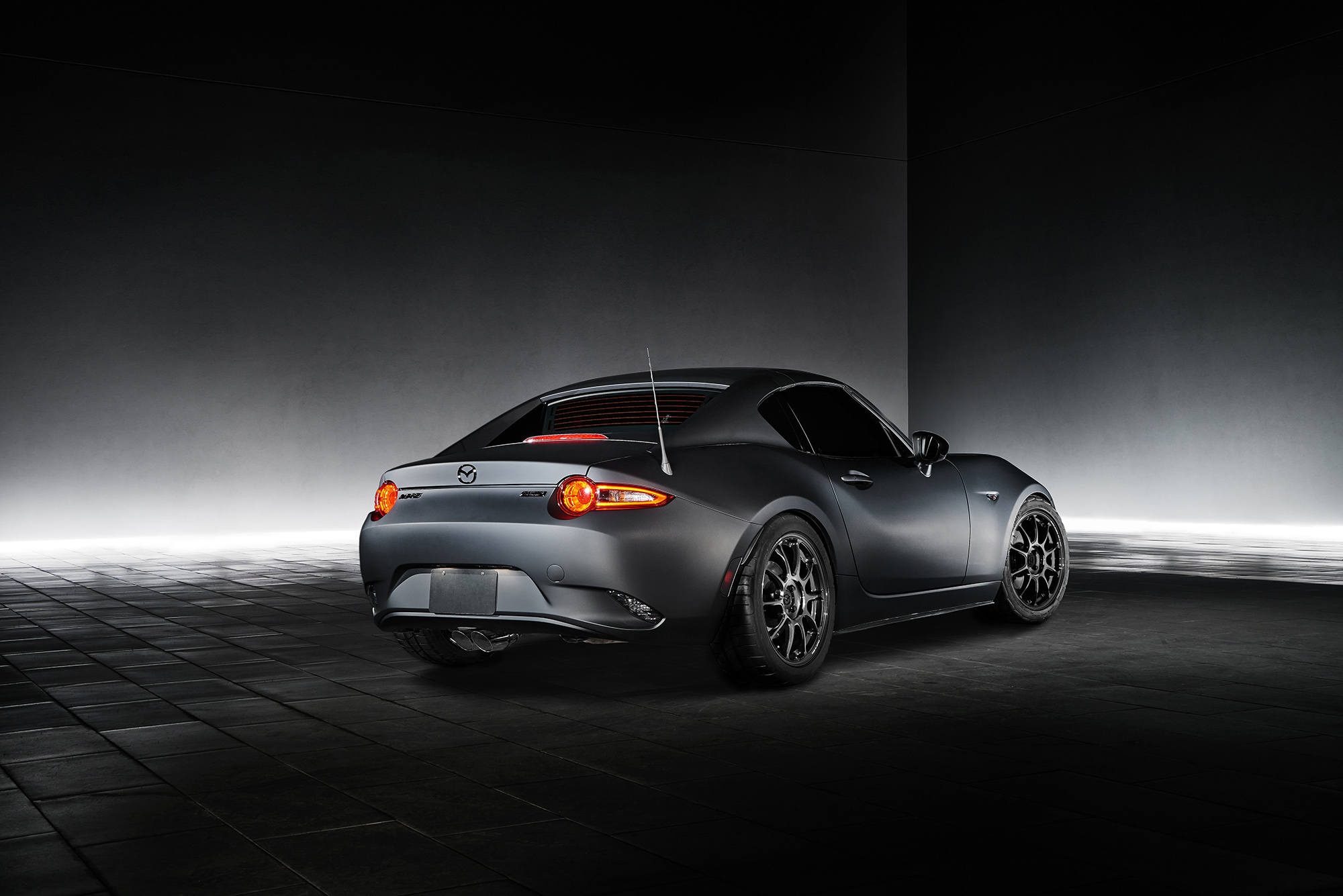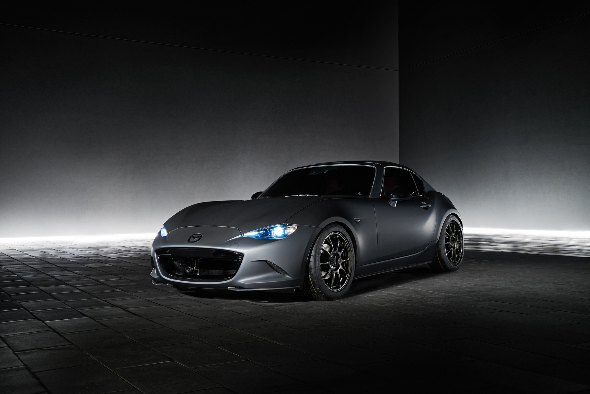 Чтобы избавиться от лишних килограммов, пришлось поменять передние тормоза Brembo на стоковые (в них легче суппорты и диски), отказаться от стандартной батареи (11 кг) в пользу аккумулятора Braille GreenLite G20 (два кило), поставить гоночную выхлопную систему, аэродинамический обвес из углеволокна и пойти на другие ухищрения. Что же касается серийной Мазды MX-5 RF, то она поступит в продажу в начале 2017 года. Напомним, что в России «эм-икс-пятая» не предлагается ни в каком виде и в обозримом будущем ждать её у нас не стоит. Высокая цена обнулила спрос.
