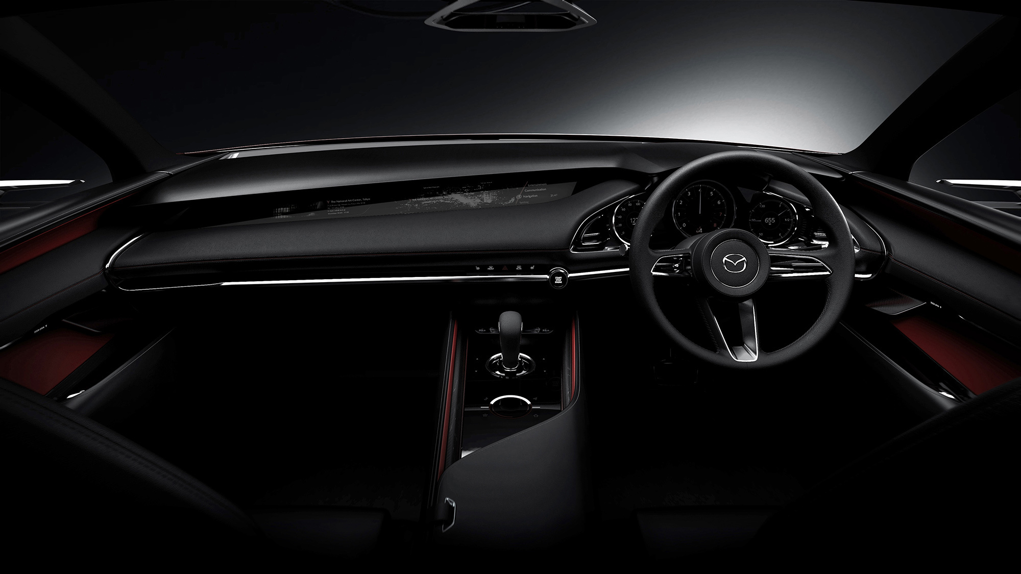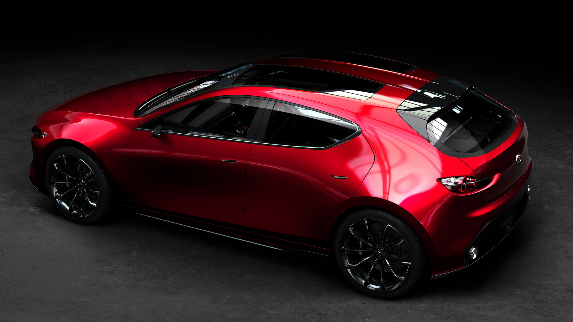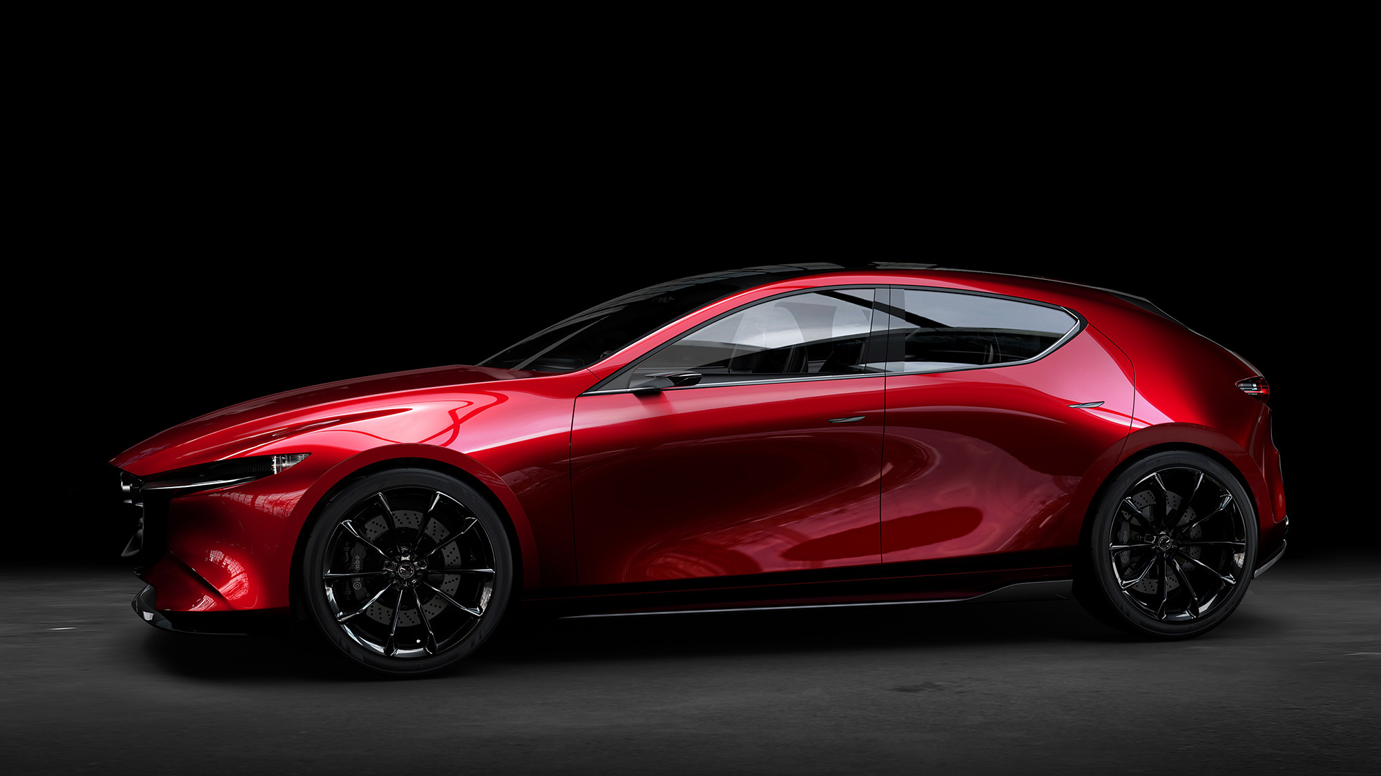 Mazda Kai с небольшой площадью бокового остекления выглядит динамично, а с некоторых ракурсов предельно агрессивно. Пятидверному кузову с массивной задней стойкой впору новое фирменное лицо Мазды, а накачанной филейной частью с характерными фонарями Kai напоминает прежние Сеаты. Внутри царствует минимализм: широкие горизонтальные панели, минимум физических кнопок, которые заменяют сенсорные поверхности, и дисплей мультимедийной системы во всю ширину передней консоли. Приборная панель ― три виртуальных циферблата с тахометром в главной роли.
