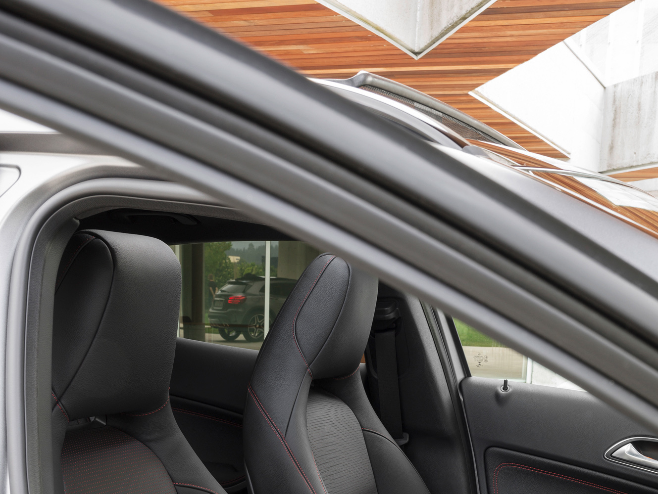 Среди новинок, касающихся безопасности, можно отметить продвинутый электроусилитель руля. Здесь он завязан в комплекс с системой стабилизации. Благодаря этому GLA может самостоятельно подавлять занос и изменение траектории при движении по разнородному покрытию не только избирательным подтормаживанием колёс, но и активными действиями рулём. Плюс к этому он обучен противостоять боковому ветру и компенсировать уводы автомобиля при поперечном уклоне дорожного полотна.