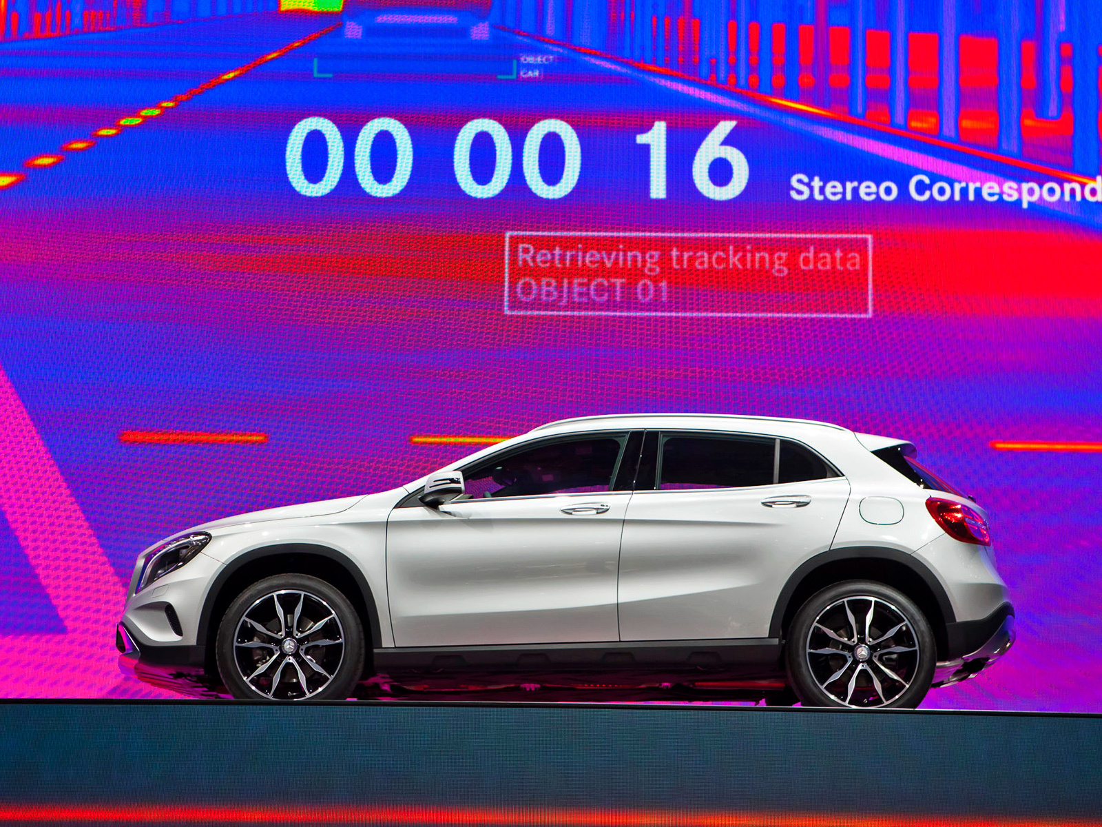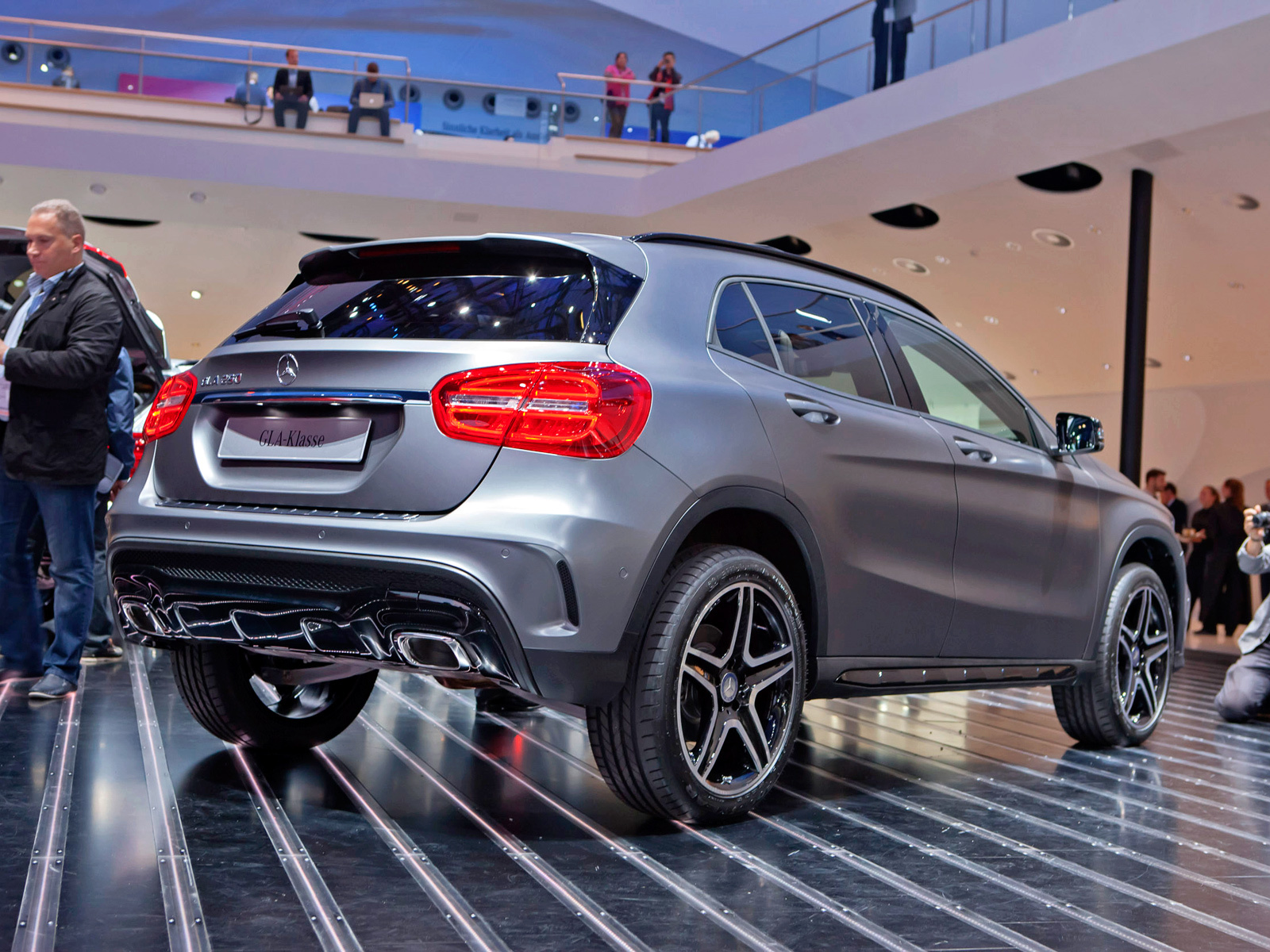 А что получилось у специалистов Мерседеса с моделью GLA, мы можем увидеть и пощупать уже сейчас. Издали автомобиль кажется просто приподнятым хэтчбеком A-класса. Но вблизи уже обращаешь внимание на различные внедорожные украшательства. И их достаточно, чтобы поверить: GLA и вправду кроссовер. На это косвенно намекают бамперы, высоко поднятые над землёй, некрашеный пластик по периметру кузова. Точные данные по дорожному просвету нам не назвали, но немцы дали подсказку — в зависимости от типа подвески увеличение клиренса по сравнению с А-классом варьируется от 44 до 74 мм.