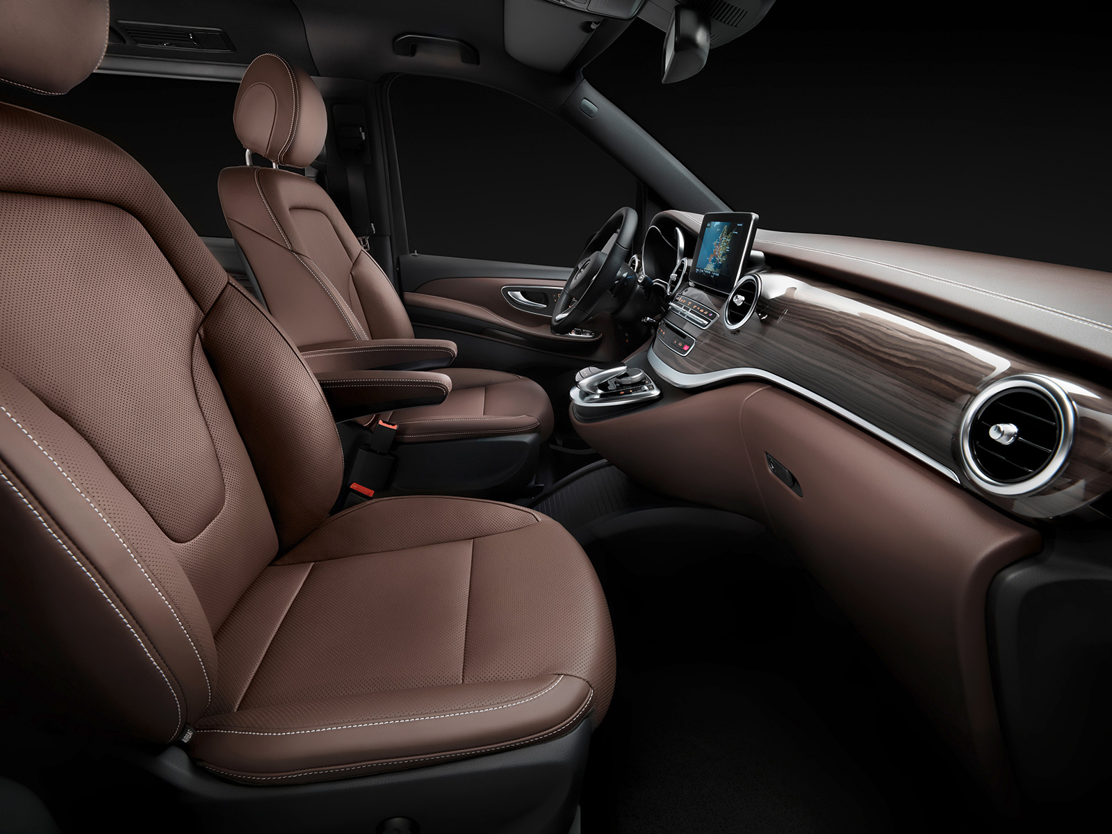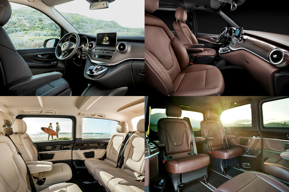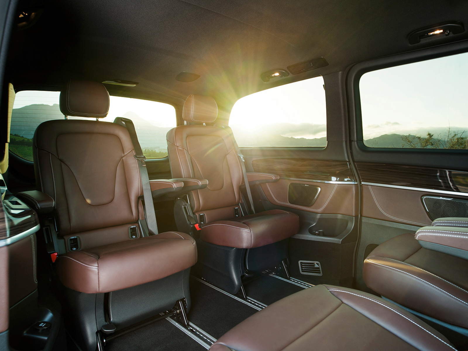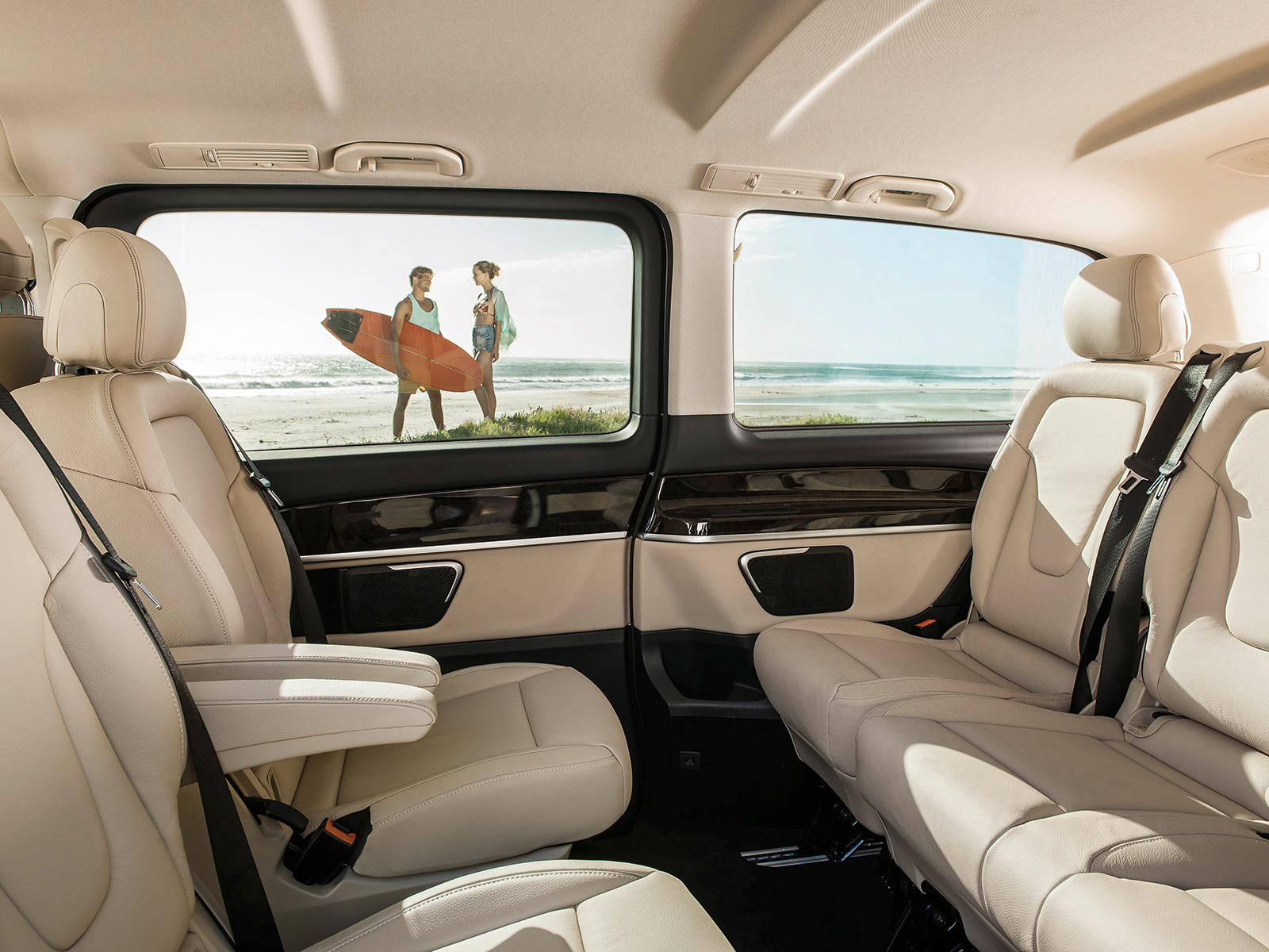 Мерседес V-класса должно быть легко подобрать под любую нужду. Он доступен с двумя колёсными базами на выбор (3200–3430). А длина машины может составлять 4895, 5140 или 5370 мм. В стандартной комплектации салон шестиместный, но количество кресел можно как увеличить, установив вместо раздельных кресел диваны, так и уменьшить, убрав ненужные сиденья. К качестве опции предлагаются поворотные кресла водителя и переднего пассажира, которые могут вращаться на 50° наружу и на 180° внутрь, — обычно такое бывает на концептах.