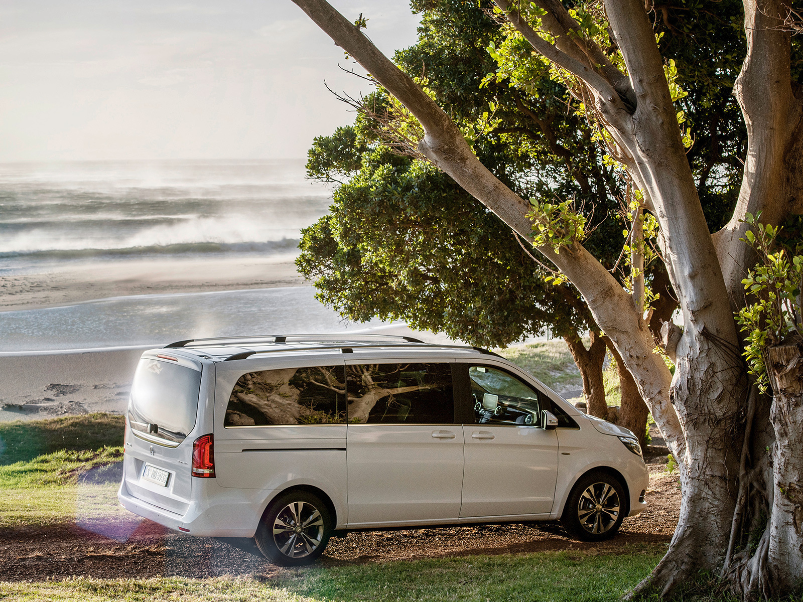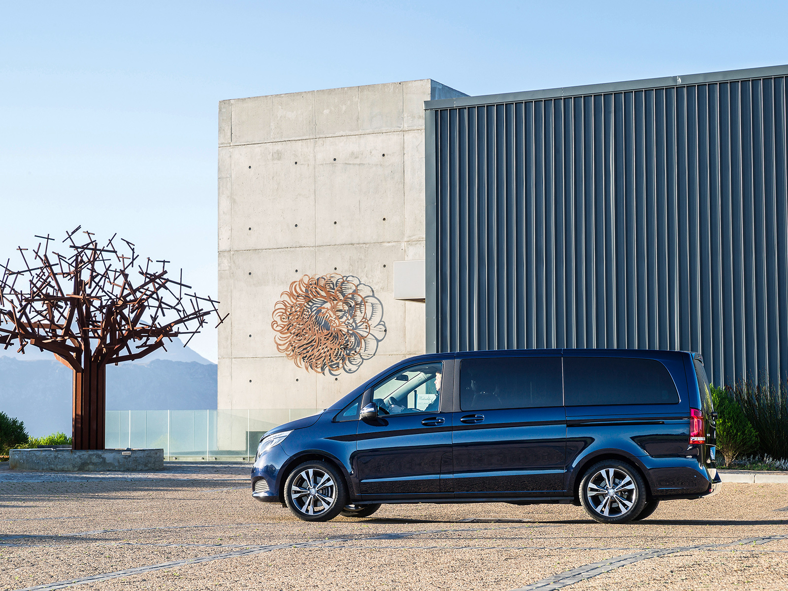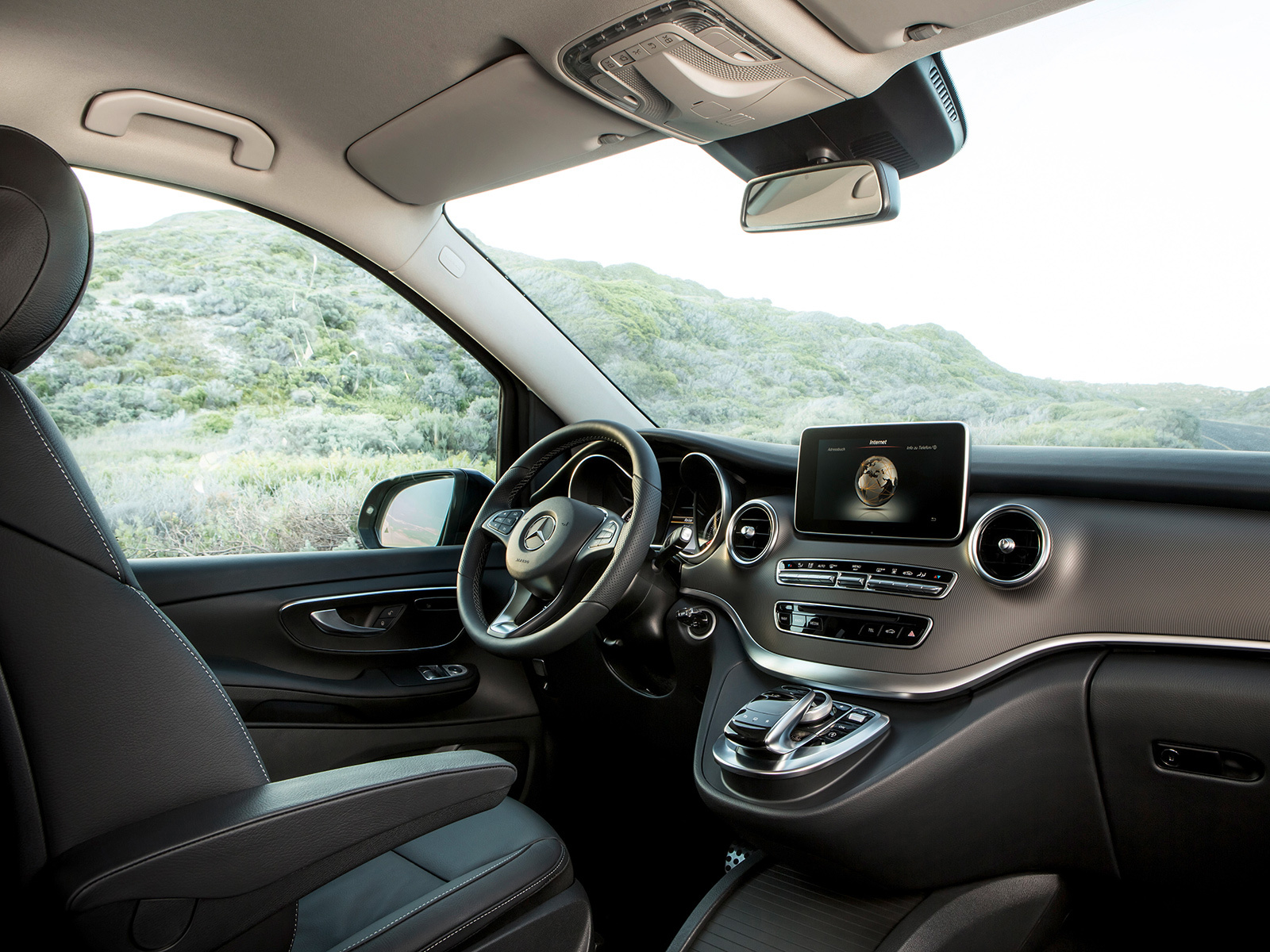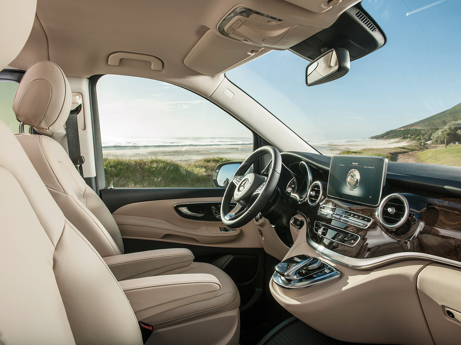 Мерседес V-класса должно быть легко подобрать под любую нужду. Он доступен с двумя колёсными базами на выбор (3200–3430). А длина машины может составлять 4895, 5140 или 5370 мм. В стандартной комплектации салон шестиместный, но количество кресел можно как увеличить, установив вместо раздельных кресел диваны, так и уменьшить, убрав ненужные сиденья. К качестве опции предлагаются поворотные кресла водителя и переднего пассажира, которые могут вращаться на 50° наружу и на 180° внутрь, — обычно такое бывает на концептах.