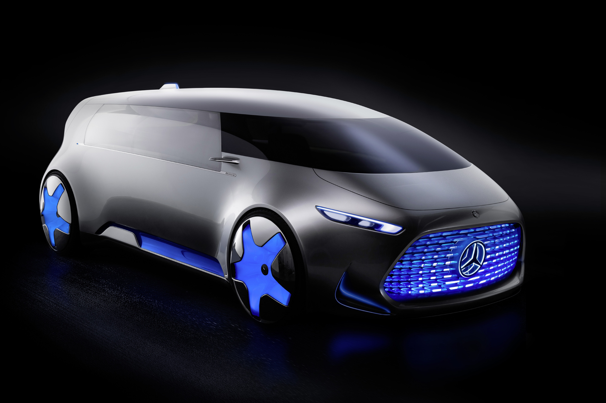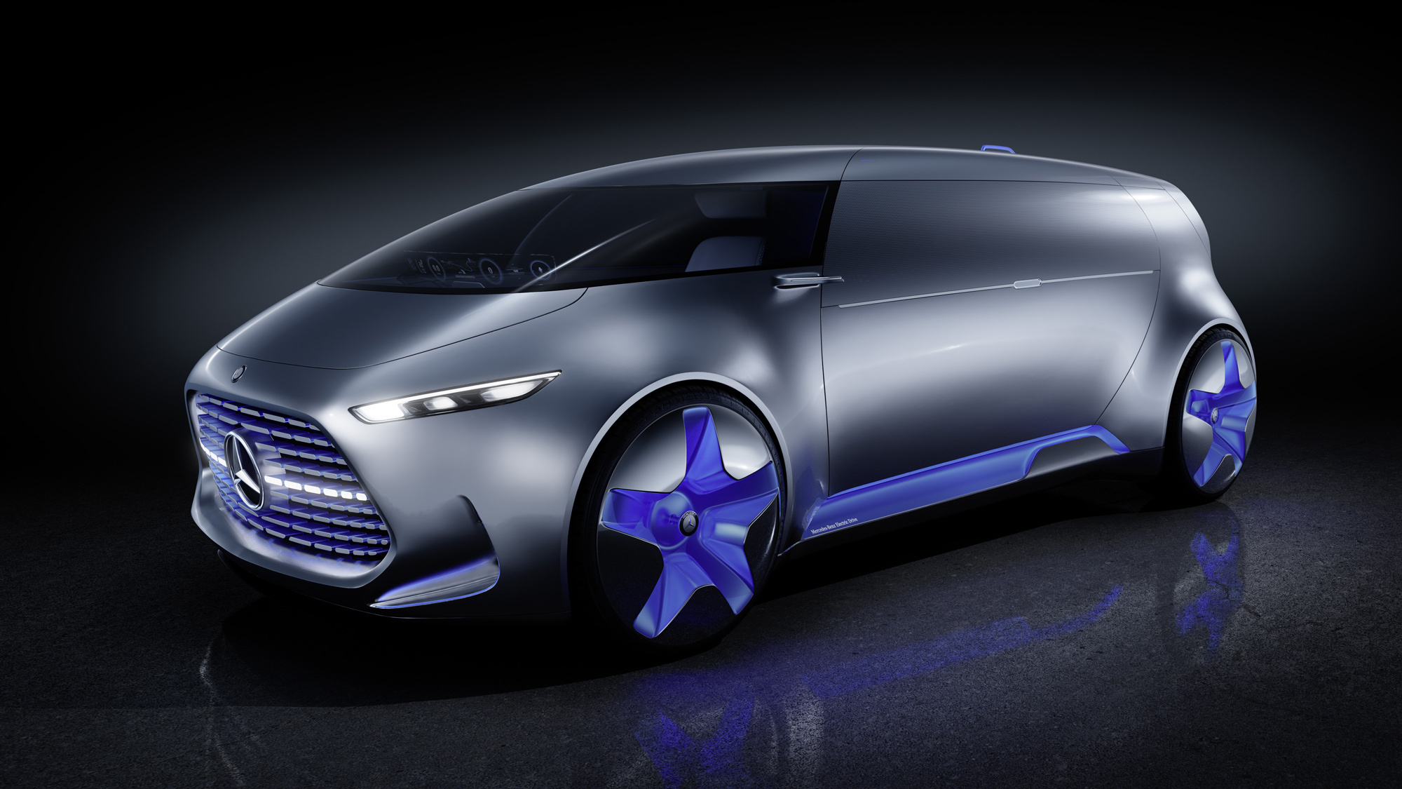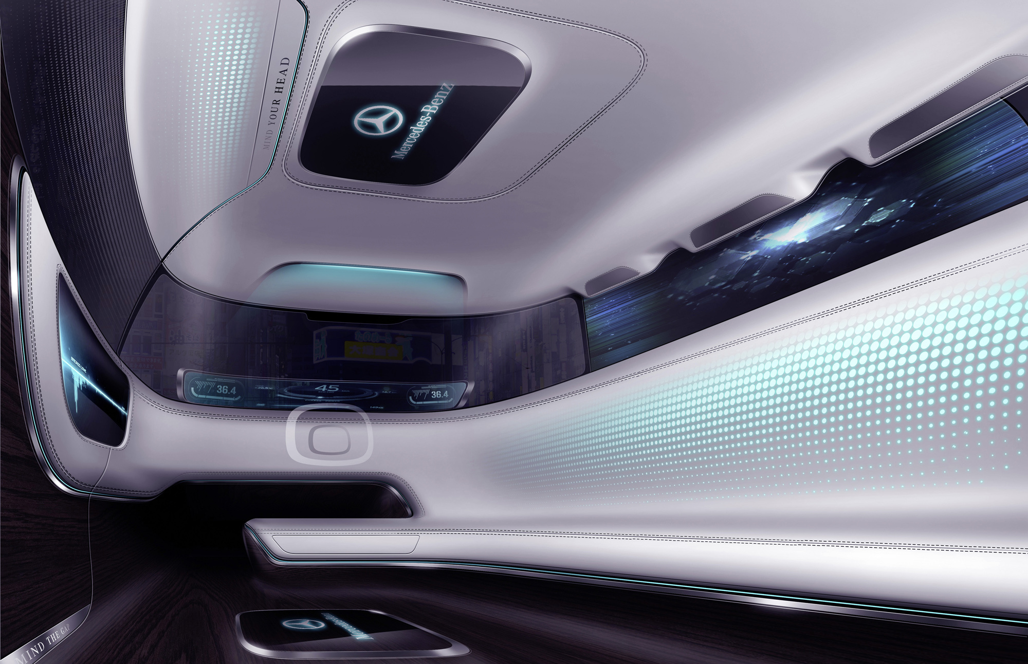 Машина адресована поколению, родившемуся после 1995 года, тем молодым людям, для которых автомобиль — «ай-ти»-компаньон, ну и заодно средство передвижения. Потому тут большие светодиодные экраны на стенах, сиденья с подсветкой. Если же машину нужно перевести на ручное управление — из приборки выдвигается рулевое колесо, а передняя часть общего дивана трансформируется в кресло для водителя.
