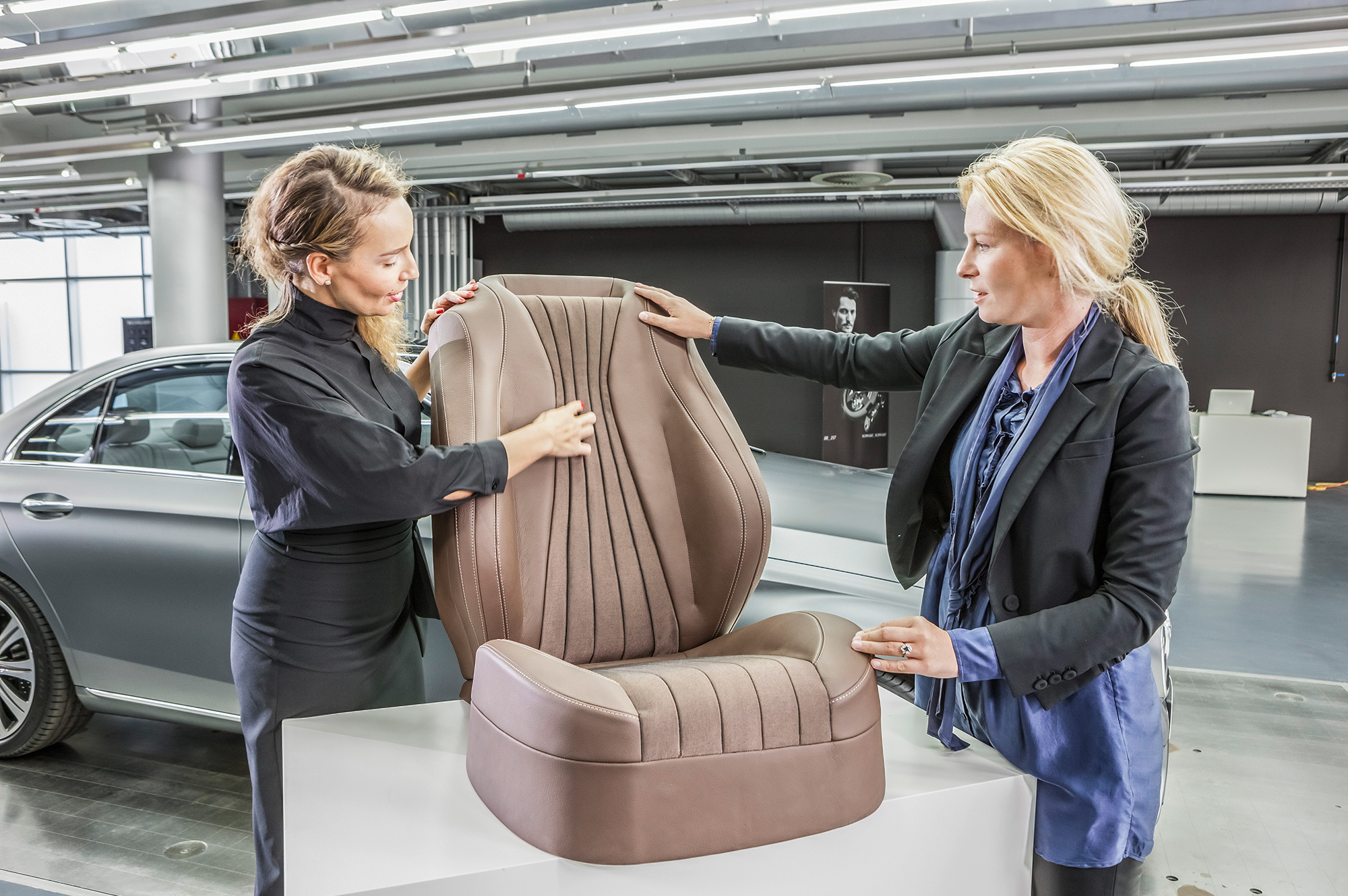 Передние кресла с вручную регулируемой по длине подушкой тоньше прежних, а между модификациями отличаются в основном обивкой. У сидений AMG Line более развитая боковая поддержка, а у активных мультиконтурных ― четырнадцать массажных пневмоэлементов в спинке, два в подушке и четыре вентилятора. Программ массажа ― девять против шести у S-класса. Подушка у таких кресел раскручивается в длину, будто из рулона, электроприводом.